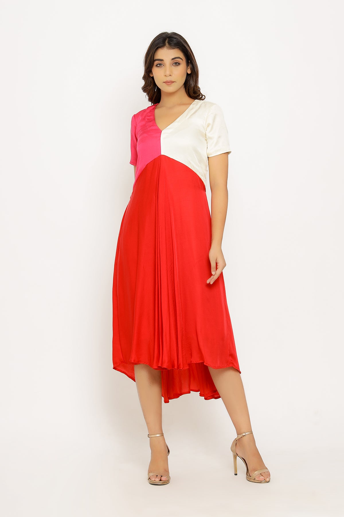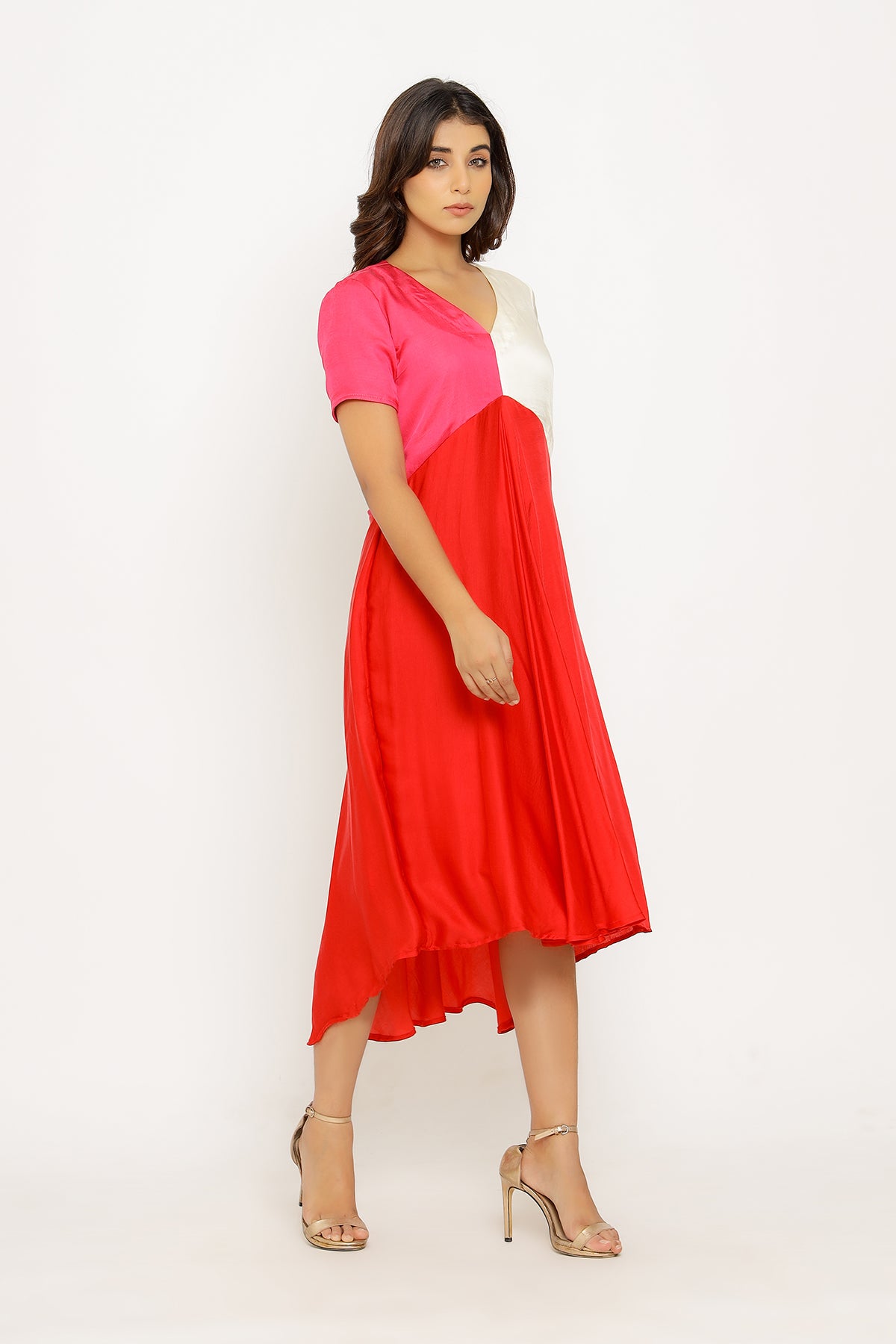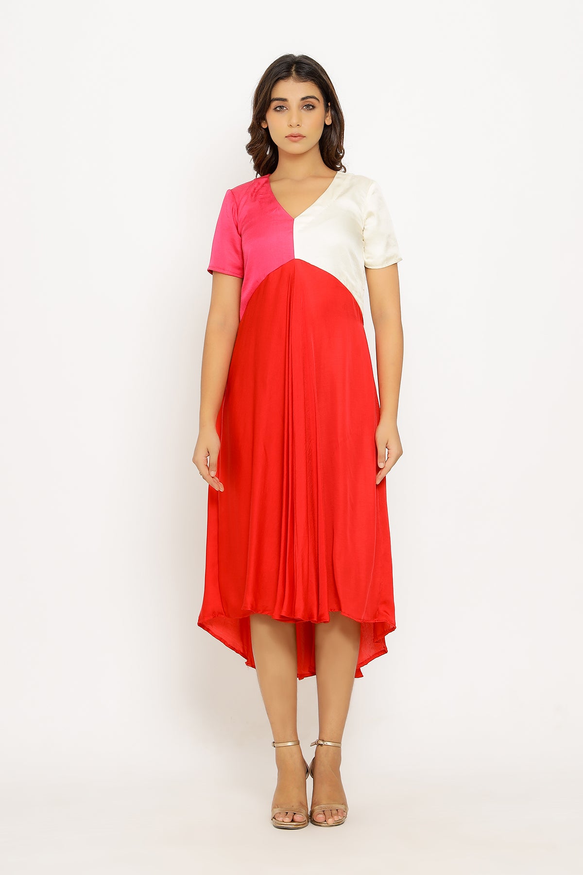Red-Pink Midi Dress with Tri Colorblocked Pattern.Length of the Garments: 44