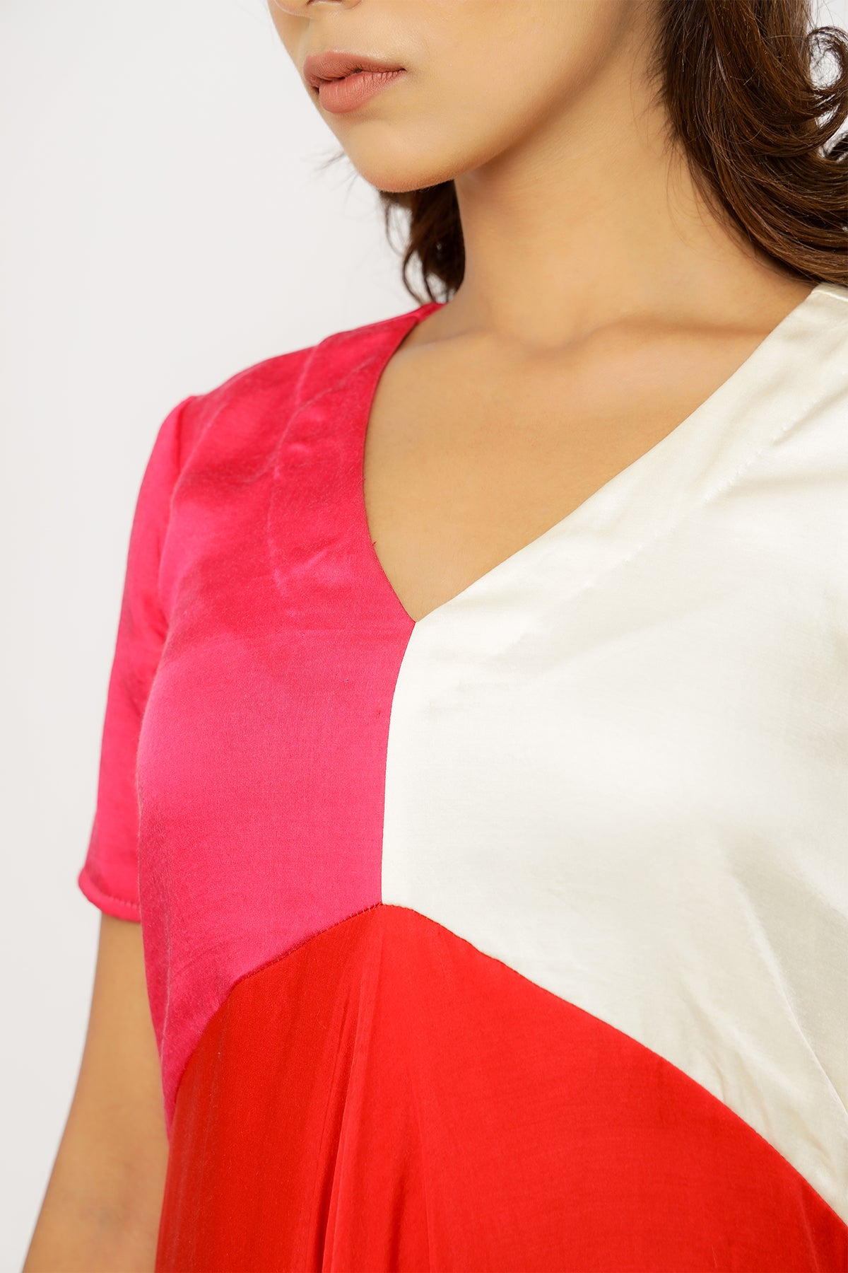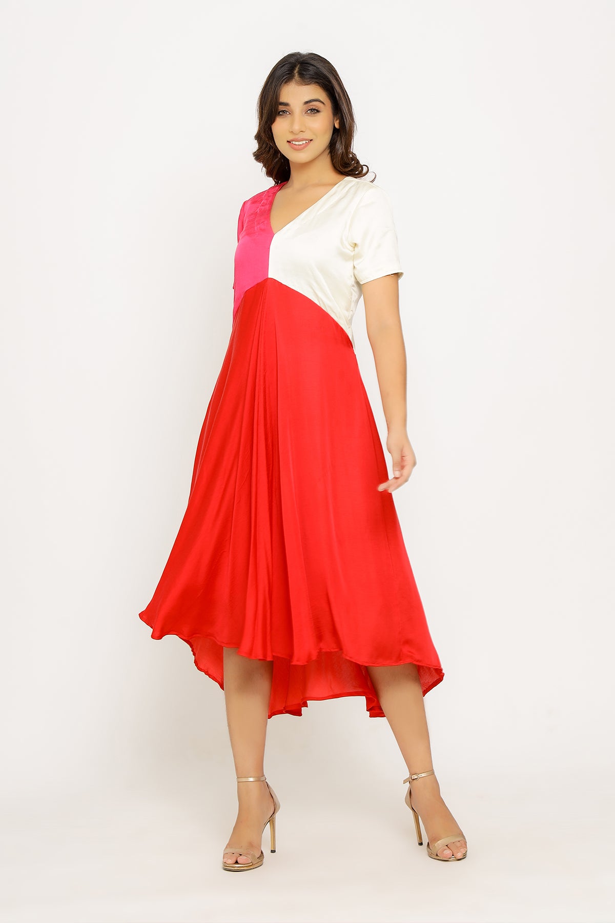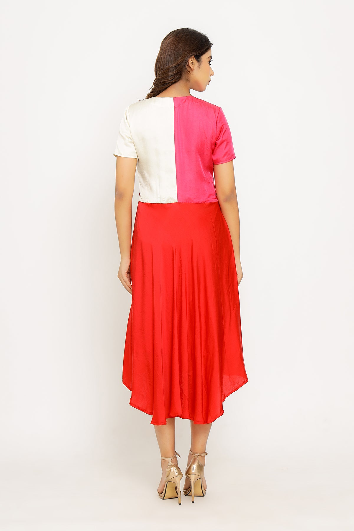 Red-Pink Midi Dress with Tri Colorblocked Pattern.Length of the Garments: 44