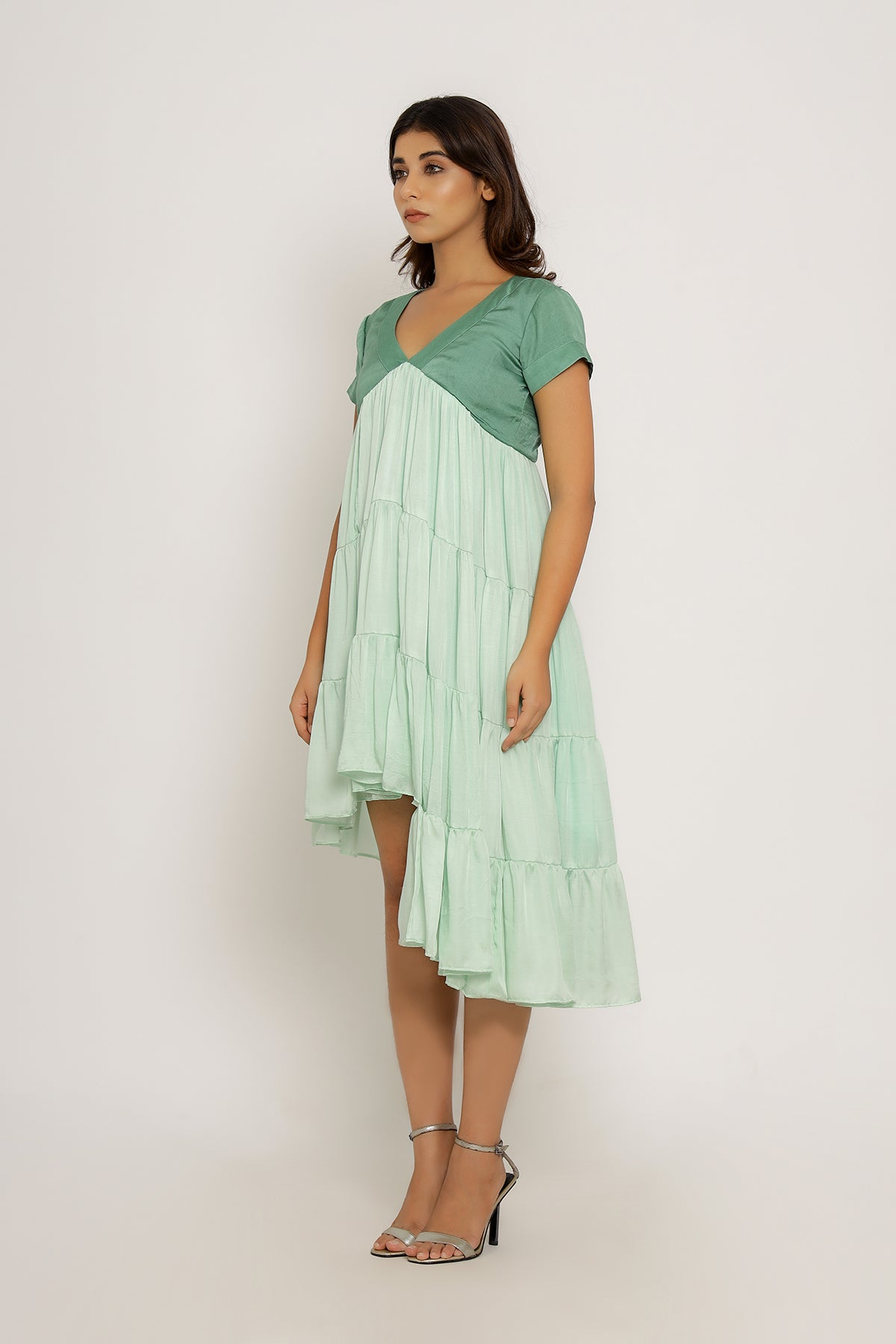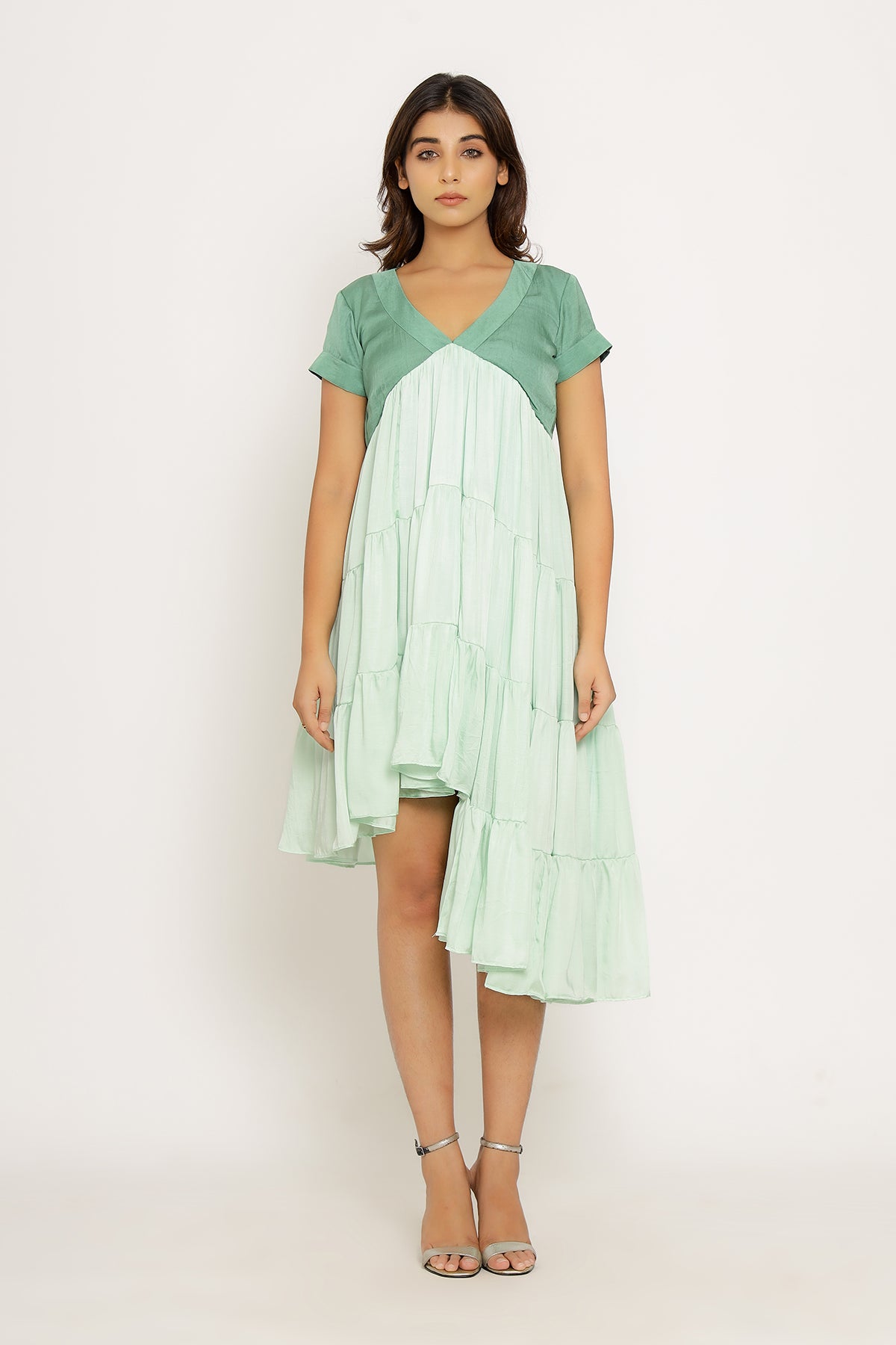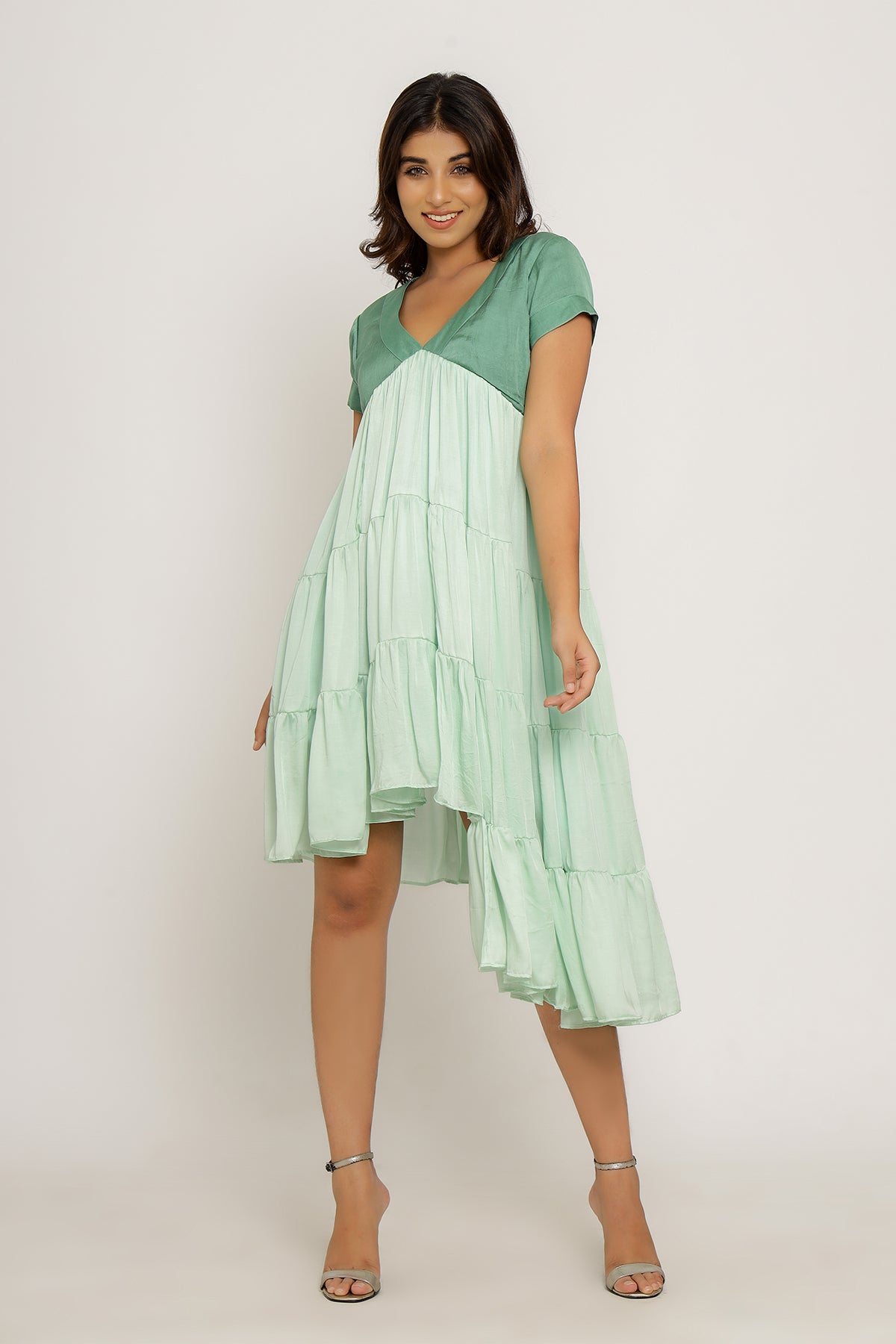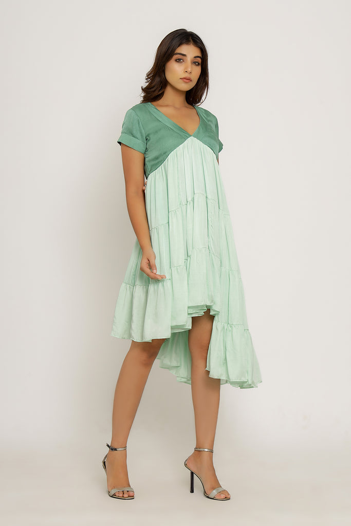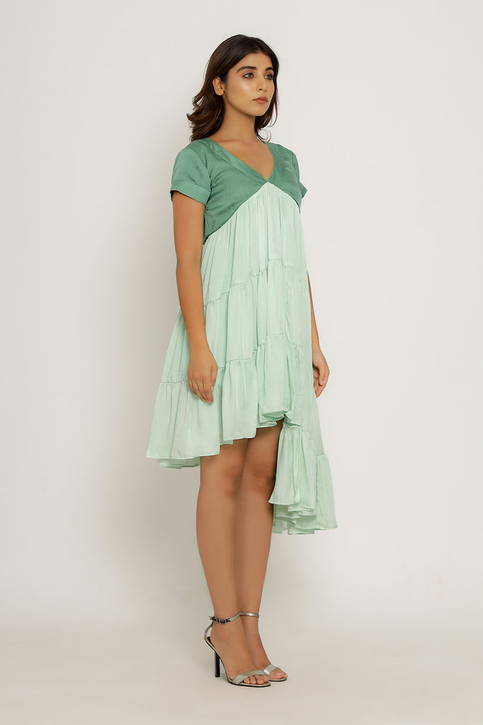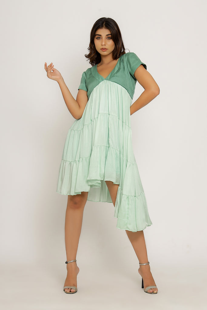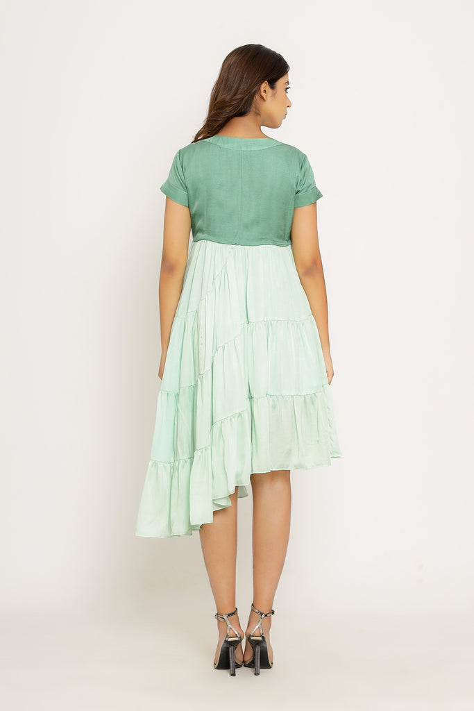 Teal-Tea Green Mid Length Dress with Gathers and an Asymmetrical High Low Pattern.Length of the Garments: 36