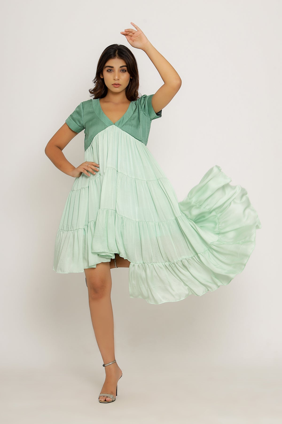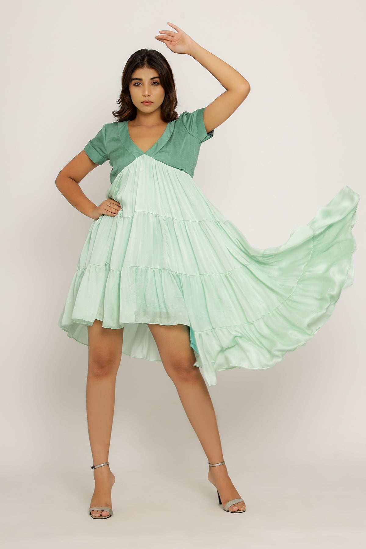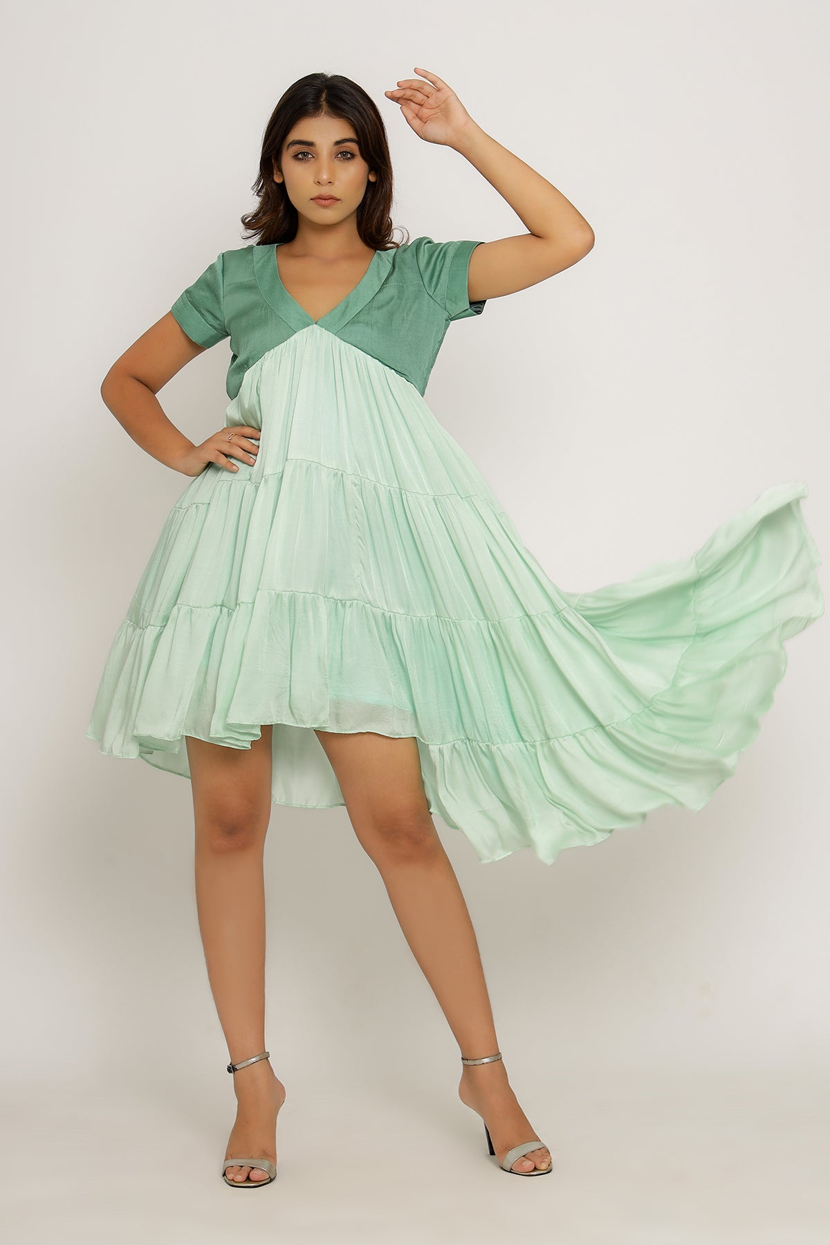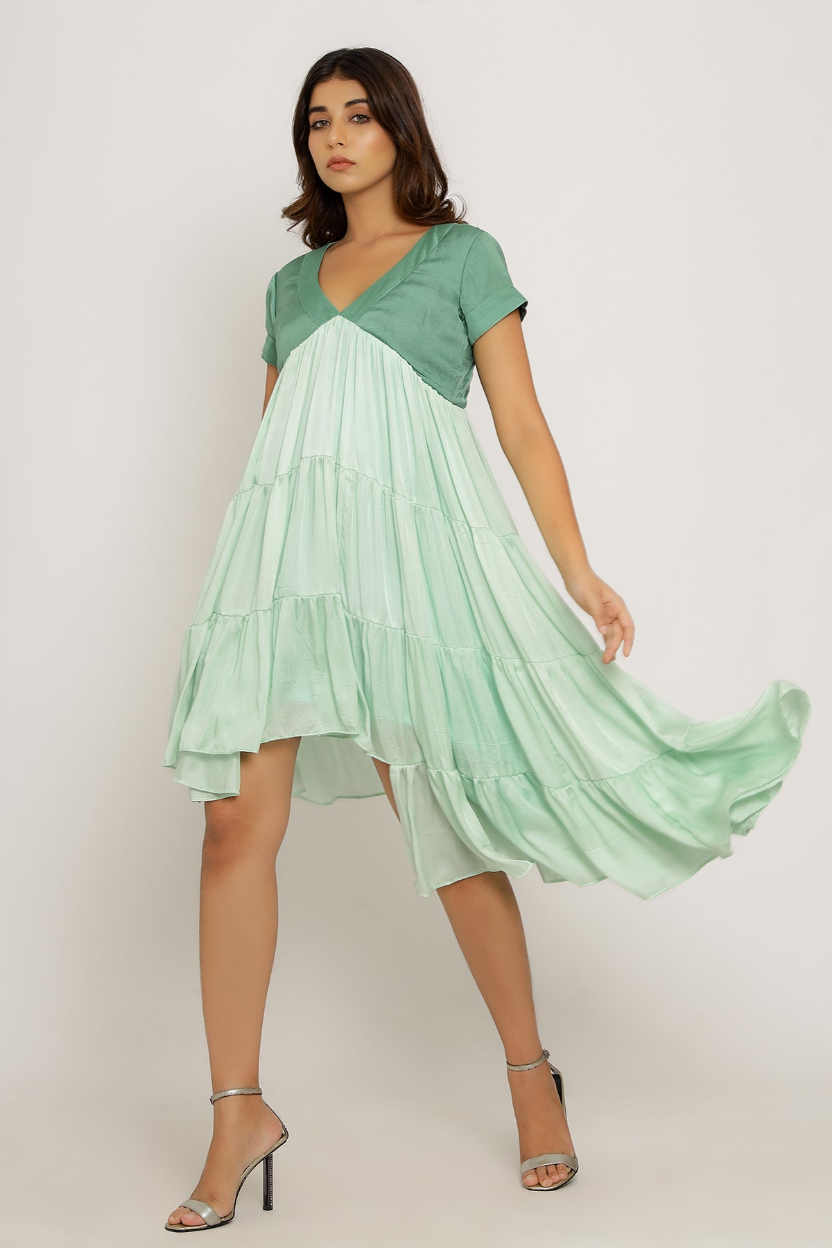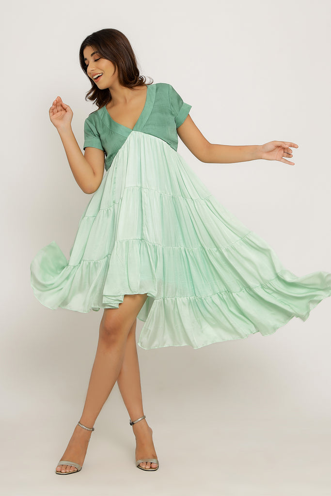 Teal-Tea Green Mid Length Dress with Gathers and an Asymmetrical High Low Pattern.Length of the Garments: 36