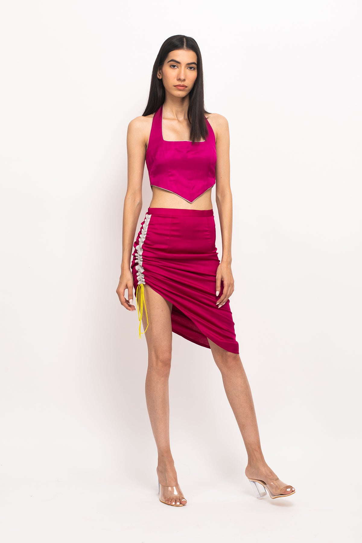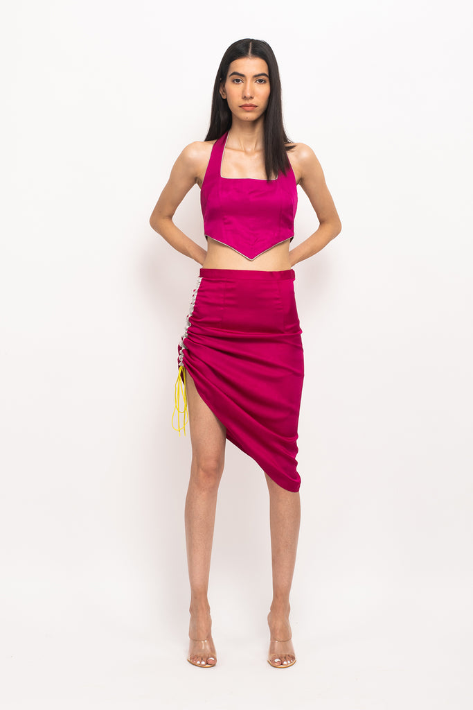 Wine bustier with grey pipin throughout and black skirt with grey rouching on one side.Length of the Garments: Bustier- 16, Skirt- 25
