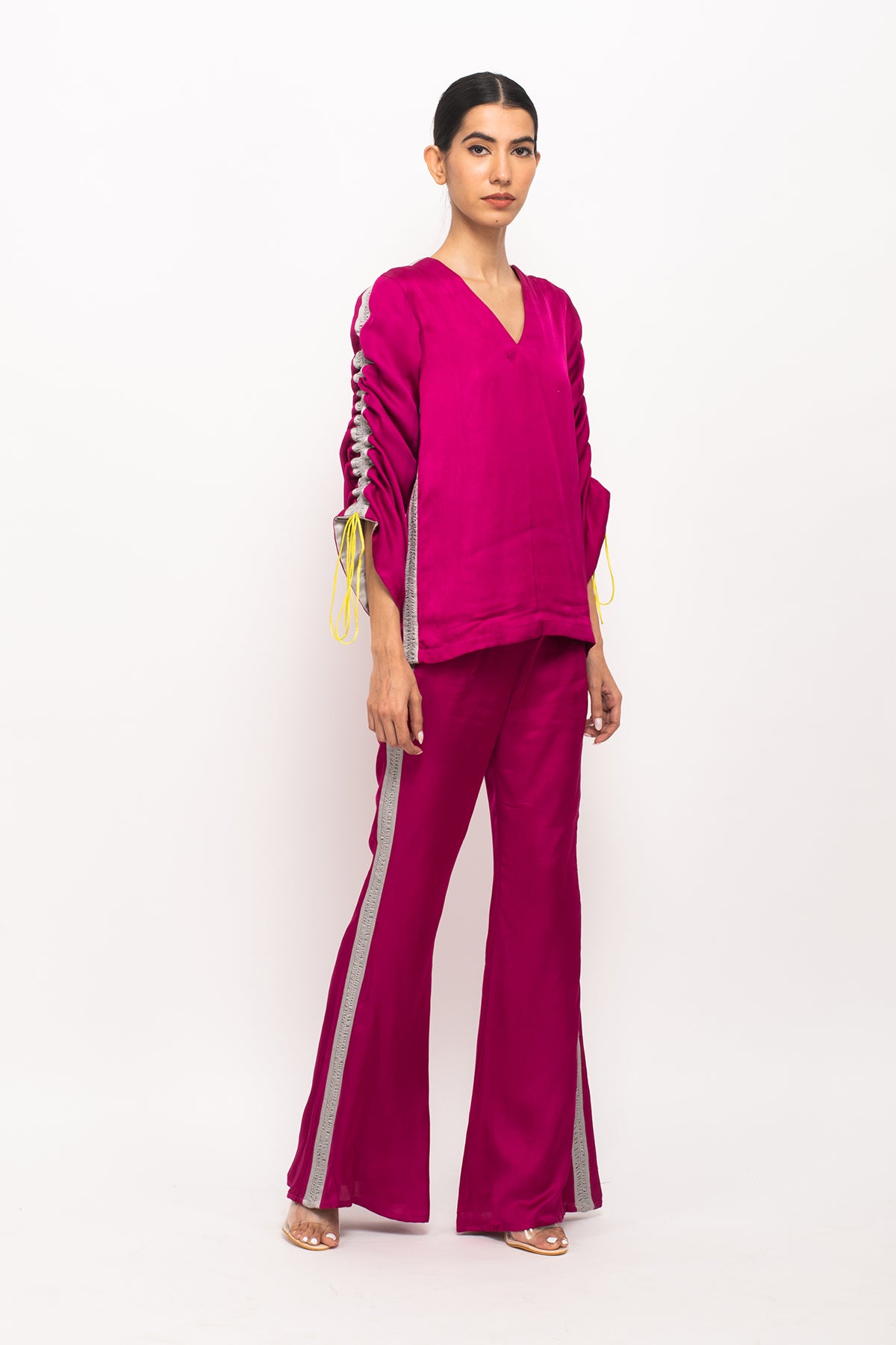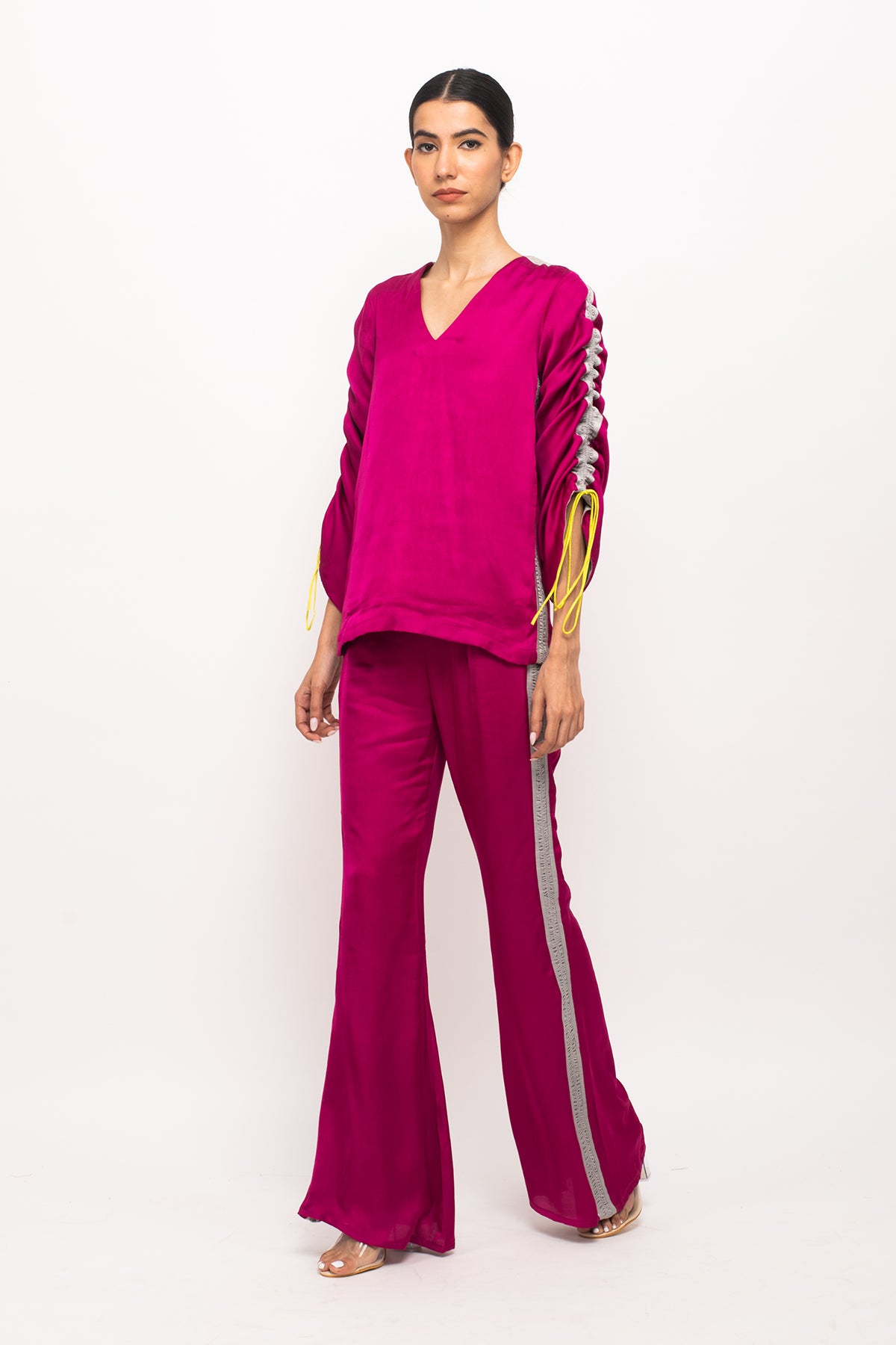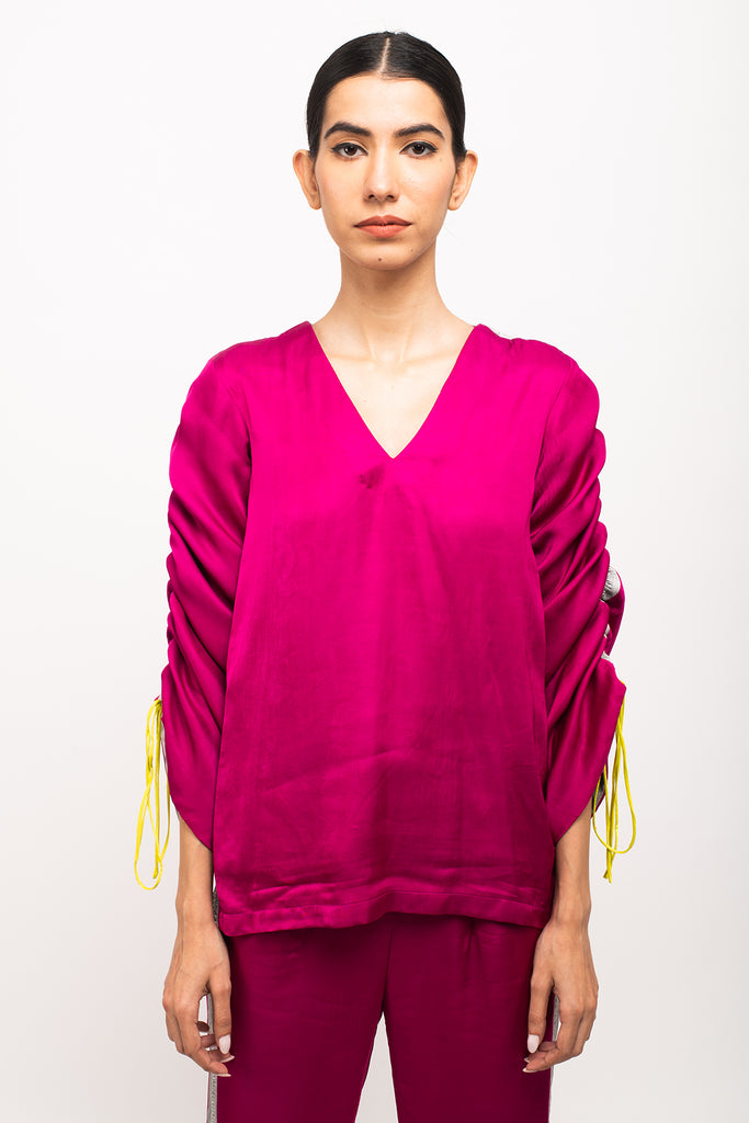 Wine-Grey full sleeves top with rouching on the sleeves, making it's length adjustable and straight blue pants with grey rouching on either sides.Length of the Garments: Top- 27, Pant- 40