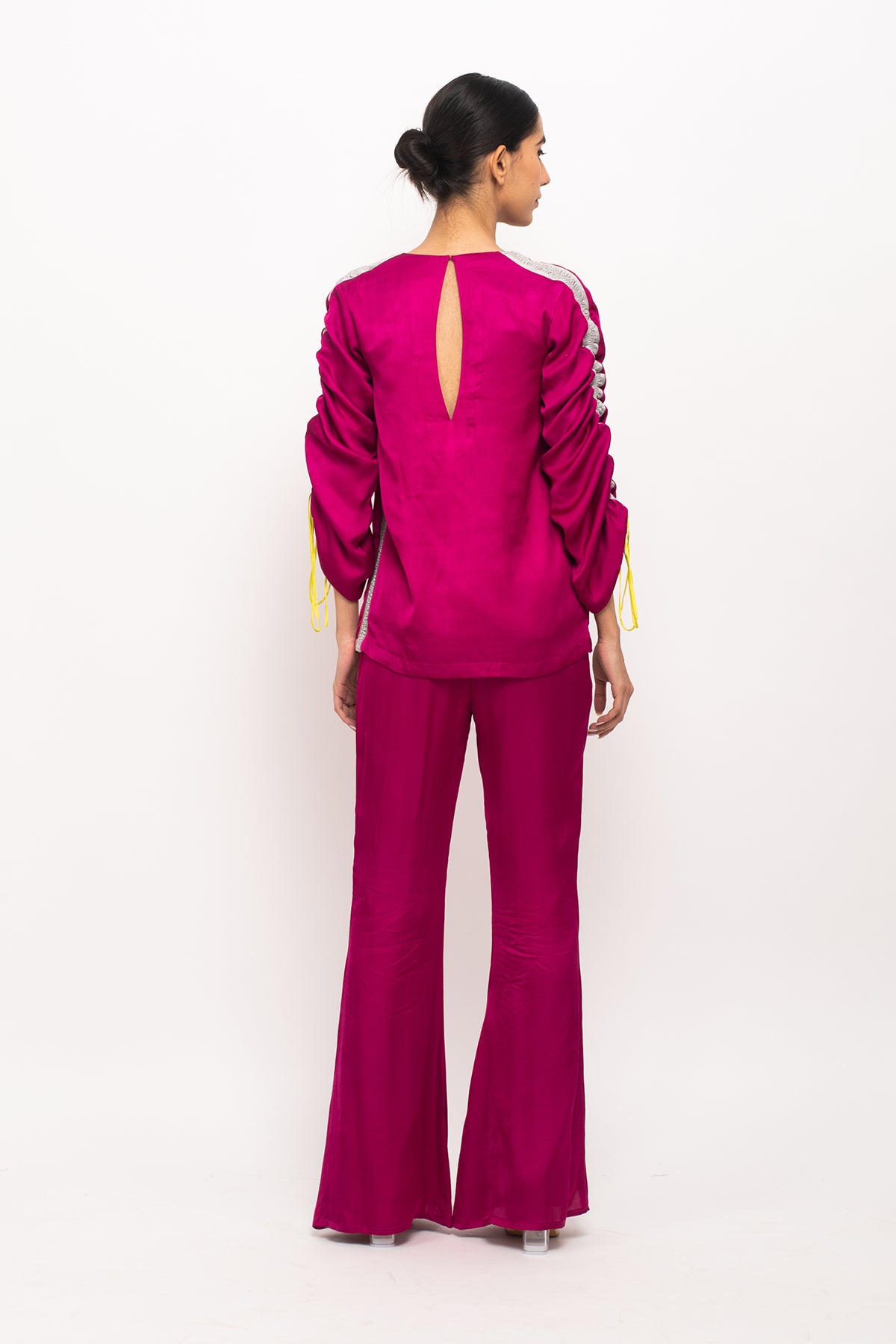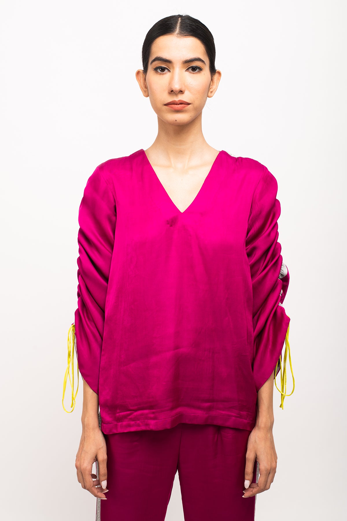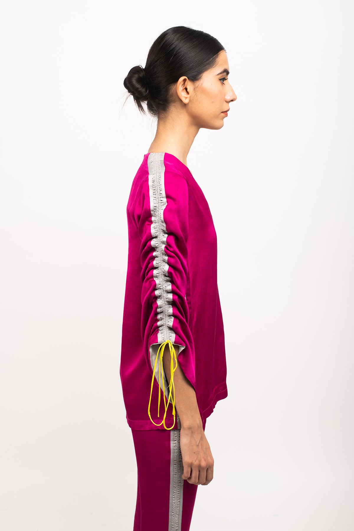 Wine-Grey full sleeves top with rouching on the sleeves, making it's length adjustable and straight blue pants with grey rouching on either sides.Length of the Garments: Top- 27, Pant- 40