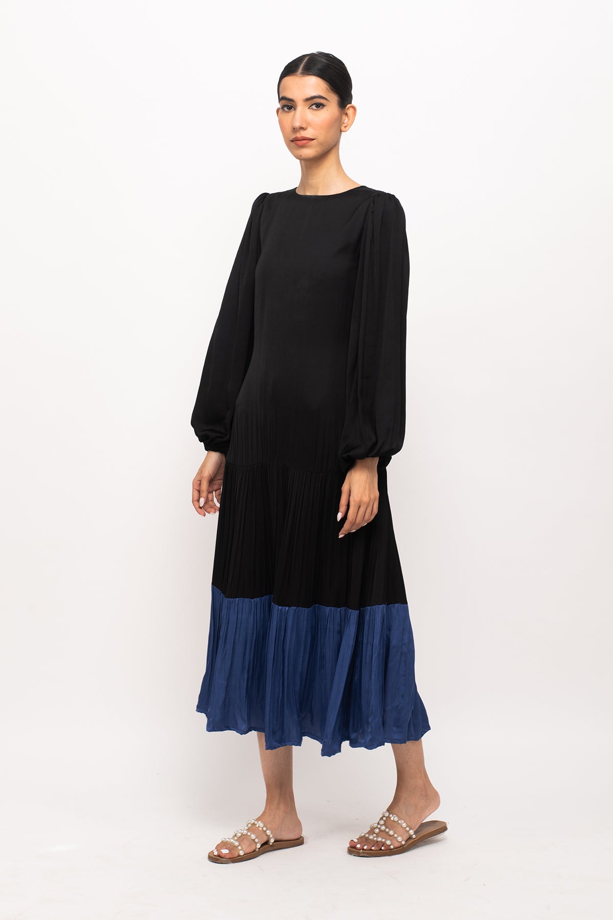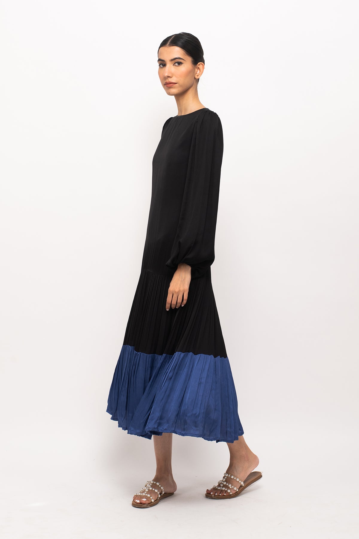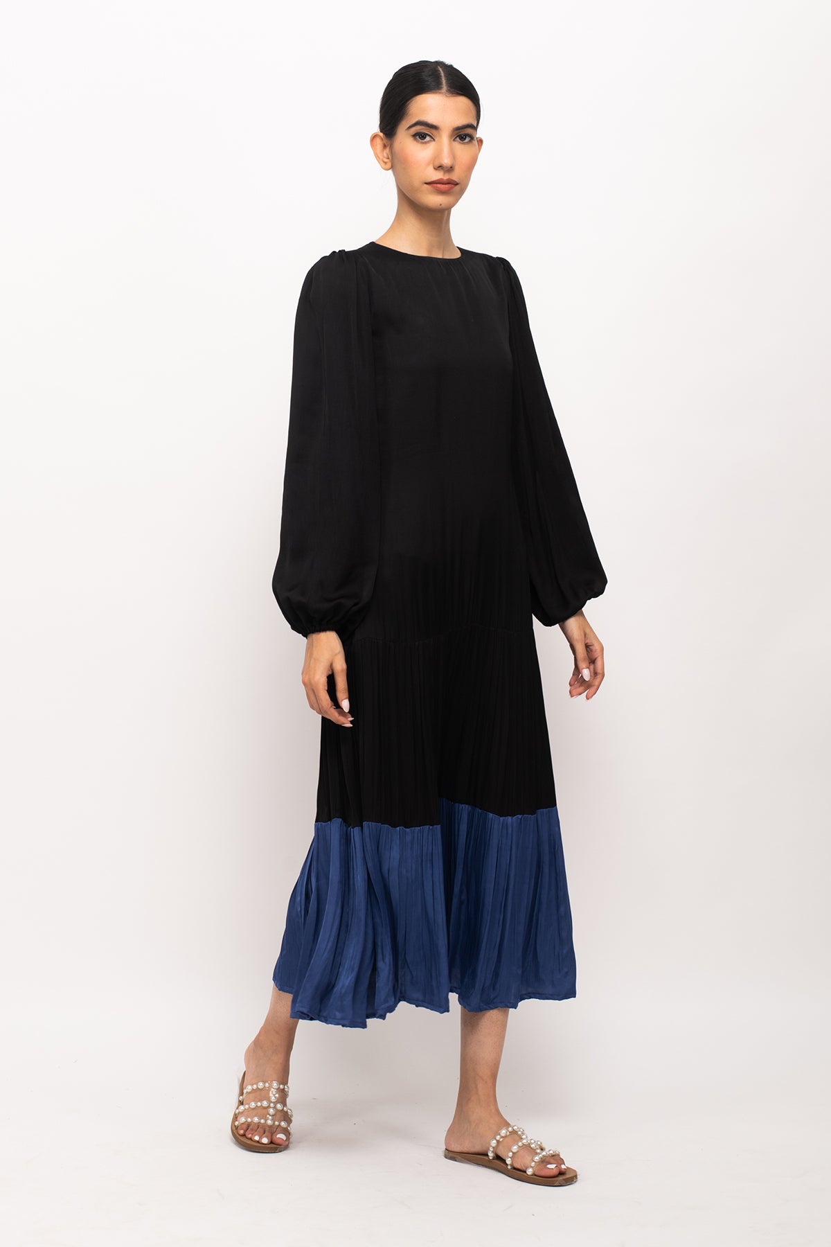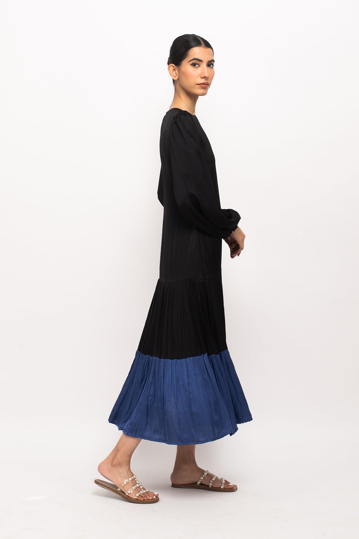 Black-Blue maxi dress with full sleeves and wine gathers at the end.Length of the Garments: 48