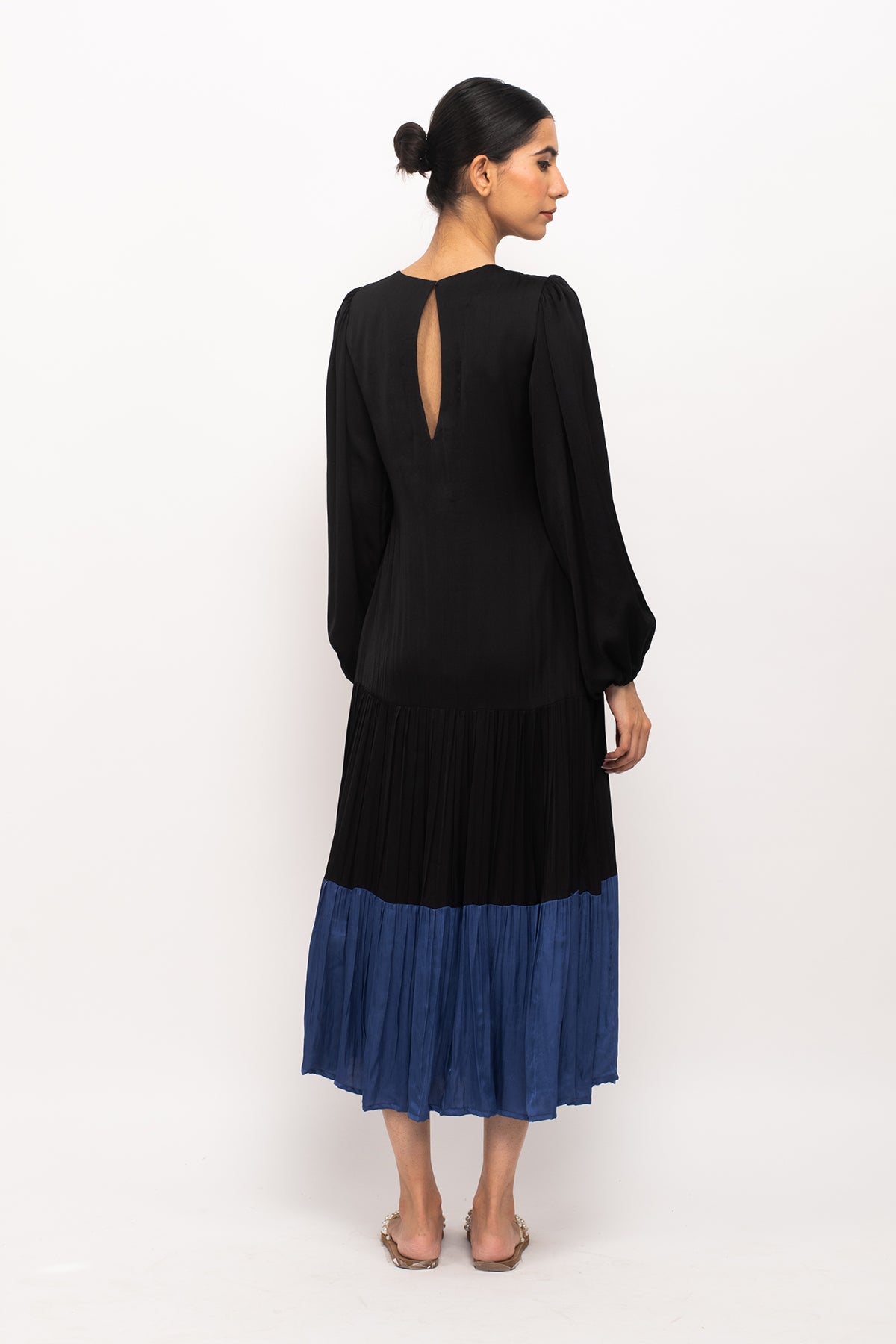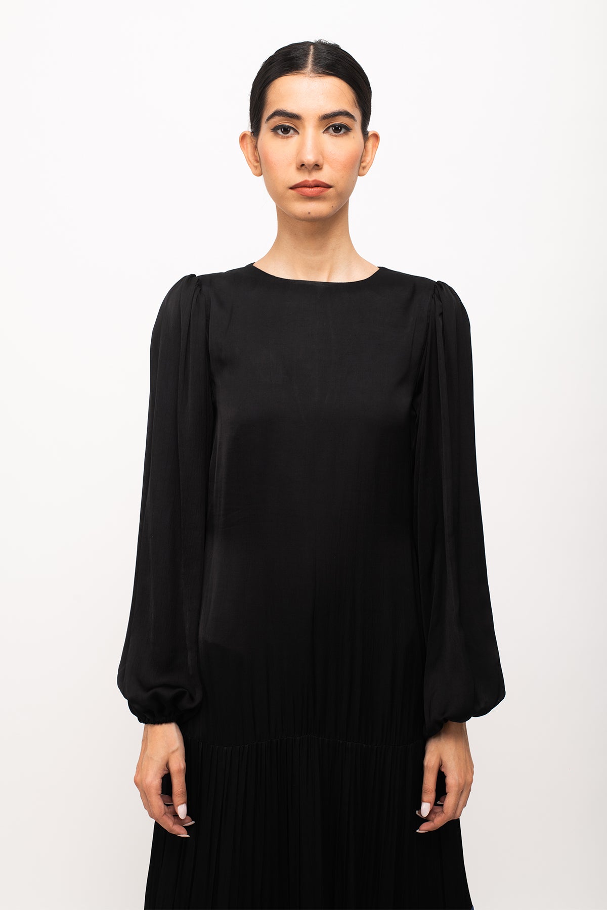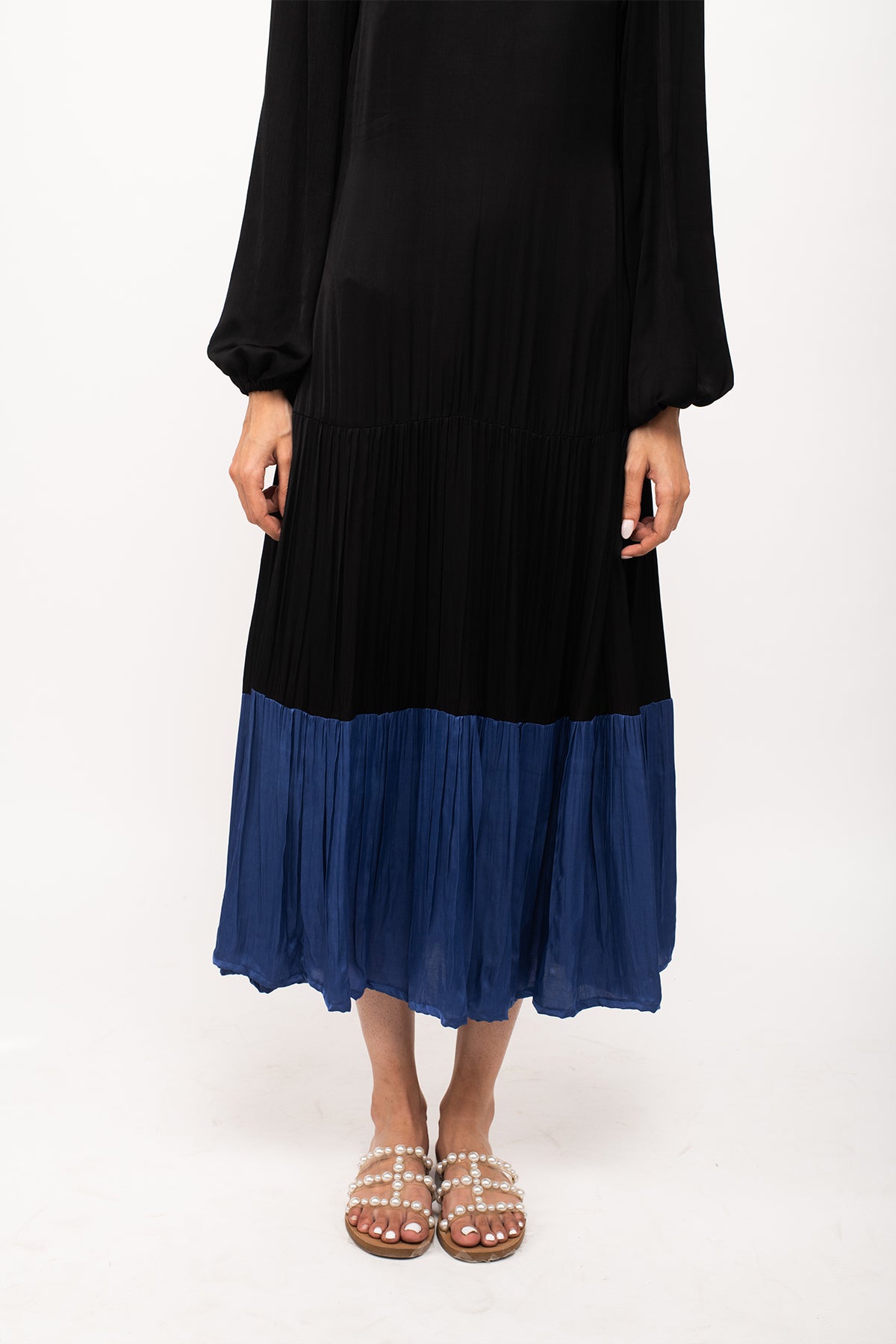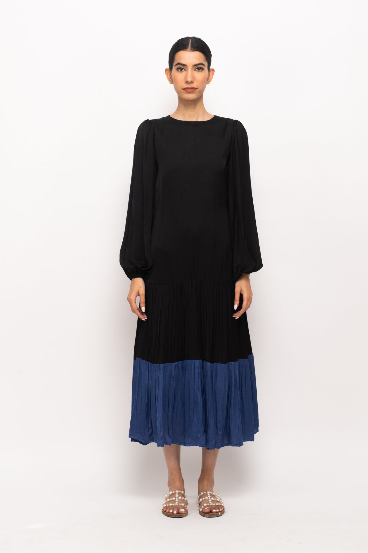 Black-Blue maxi dress with full sleeves and wine gathers at the end.Length of the Garments: 48