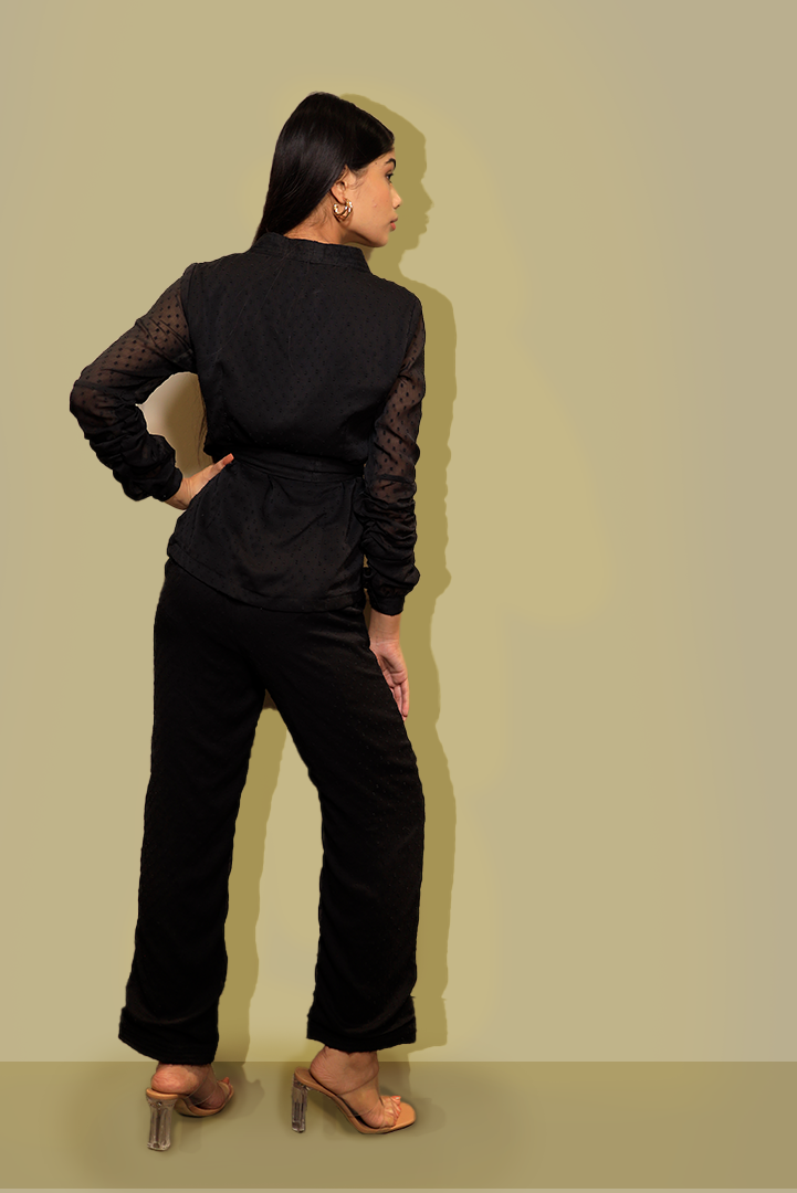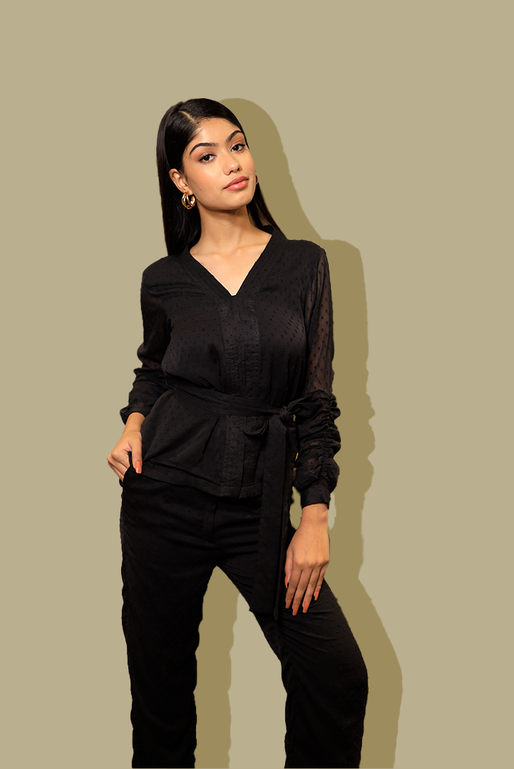 V Neck top with a tie belt on the waist. Featuring gathered details on sleeves.