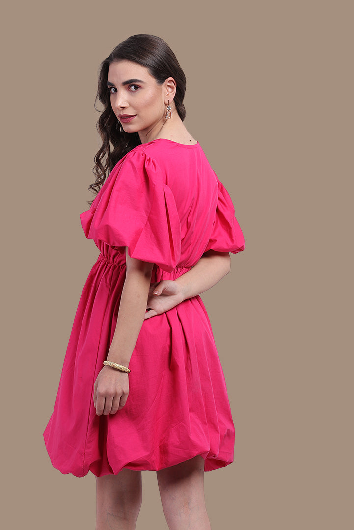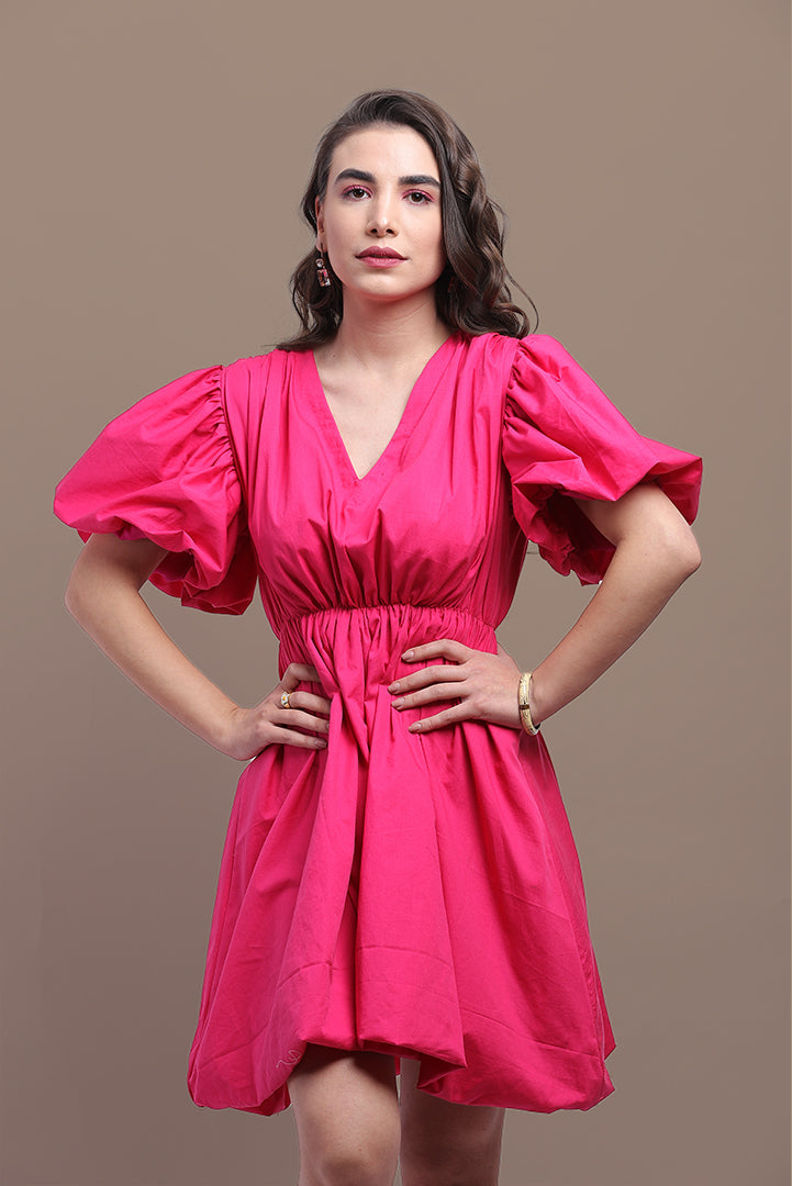 Peplum sleeve puffy dress with elastic at the waist. Flairy hem with bottom elastic for voluminous look.