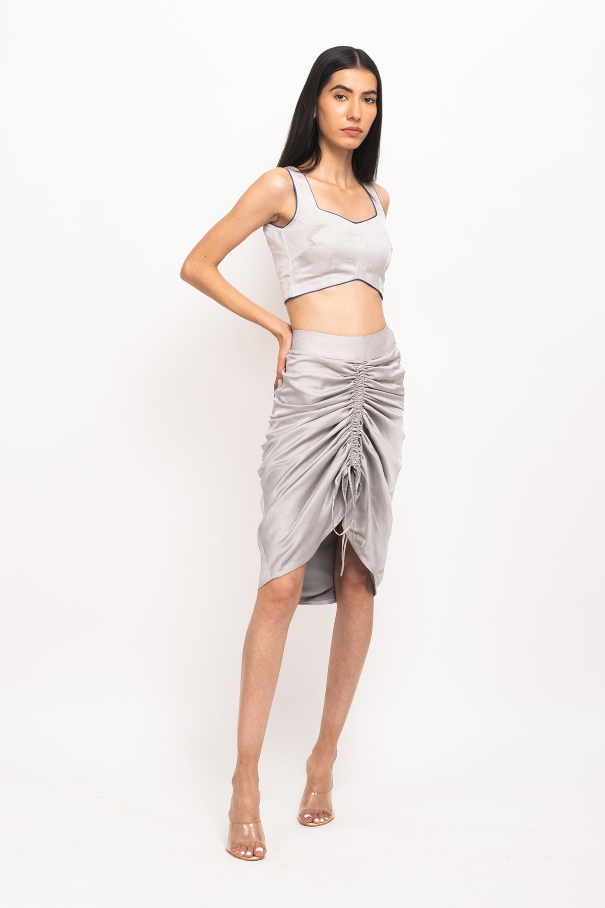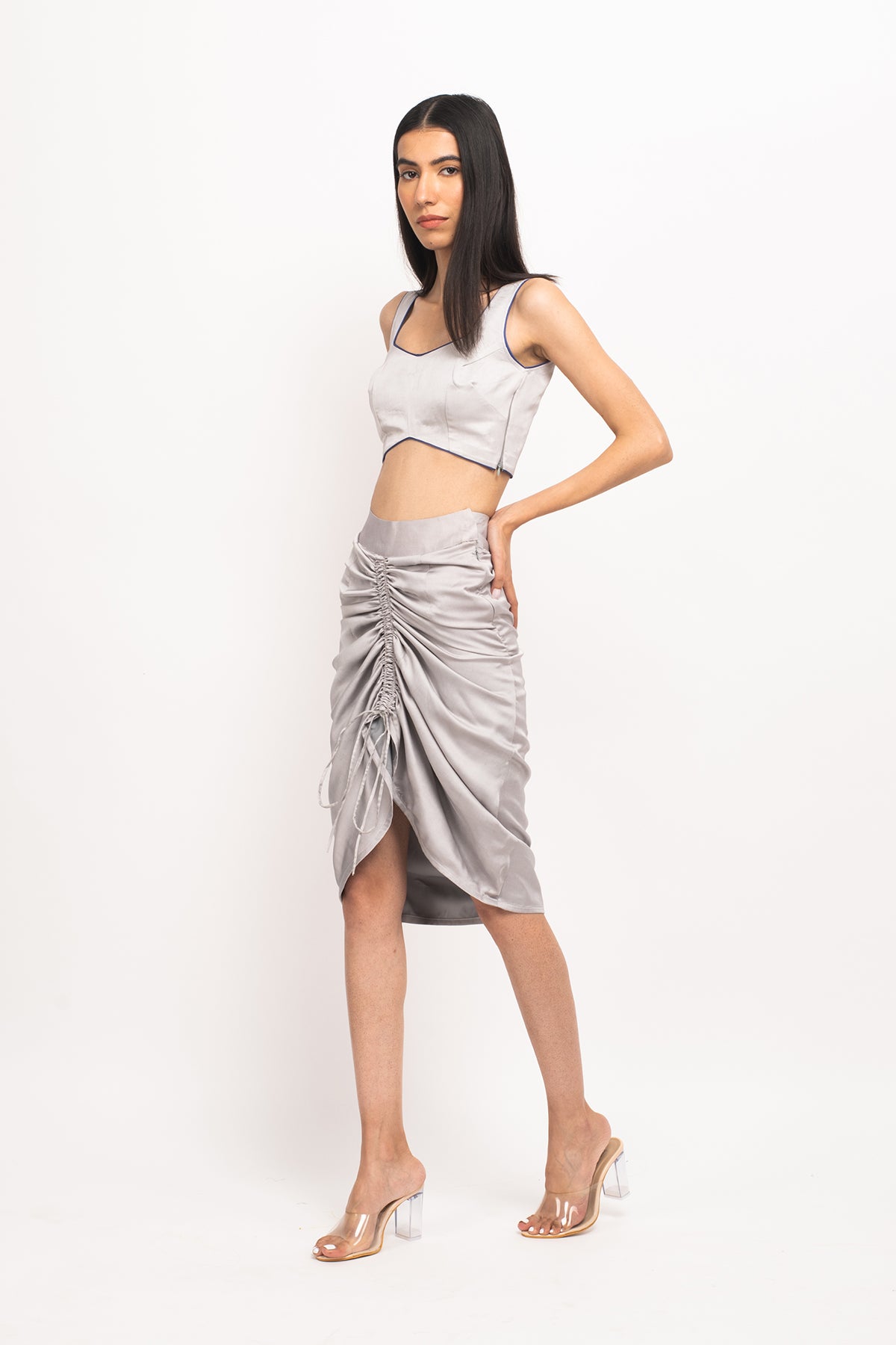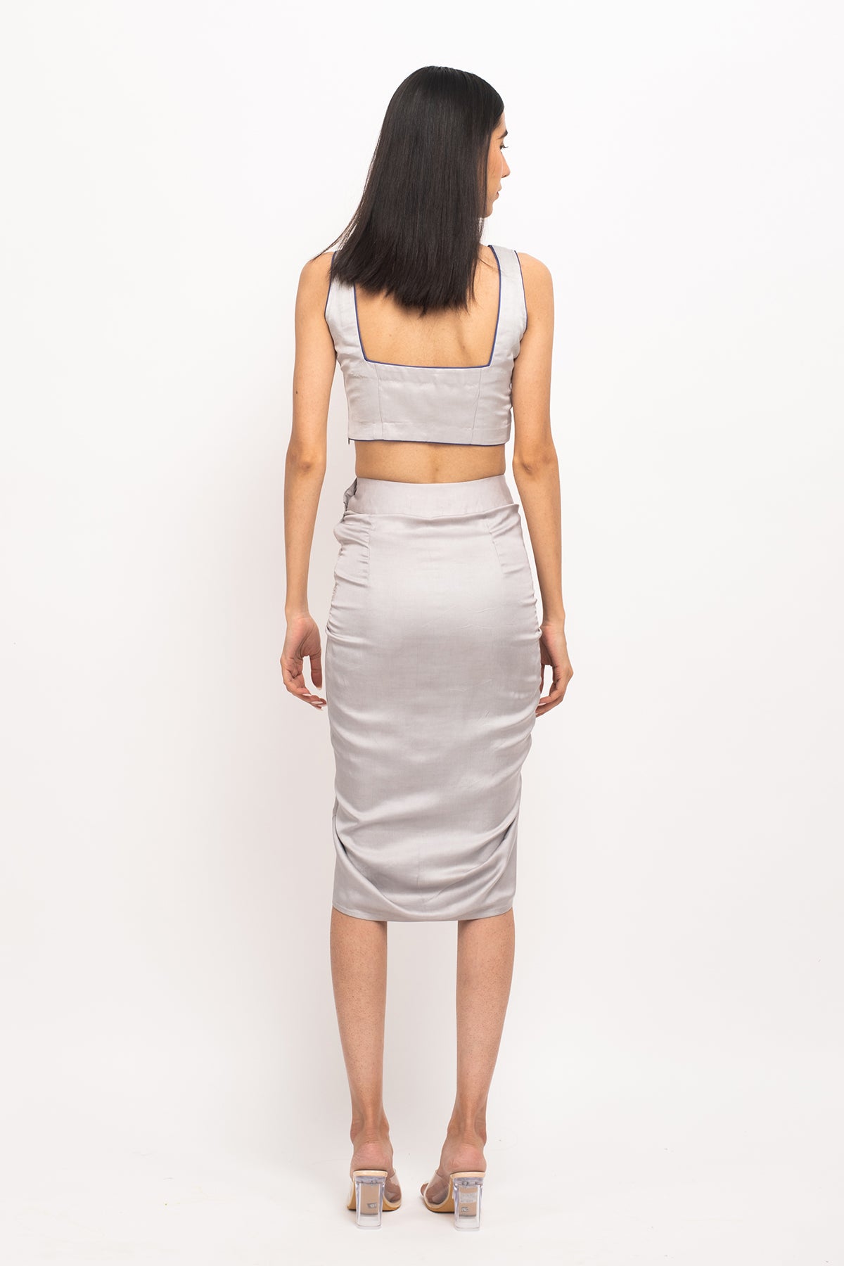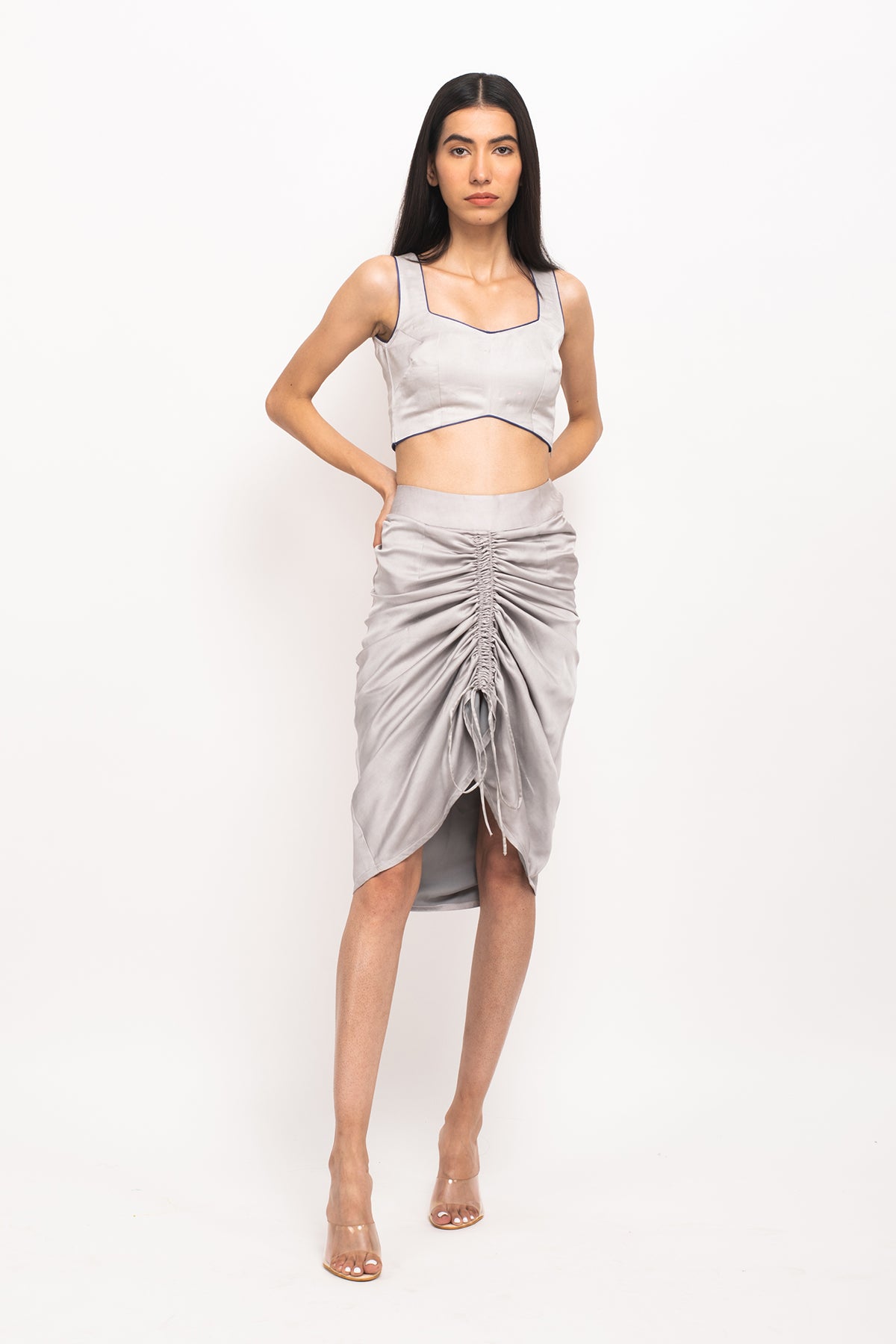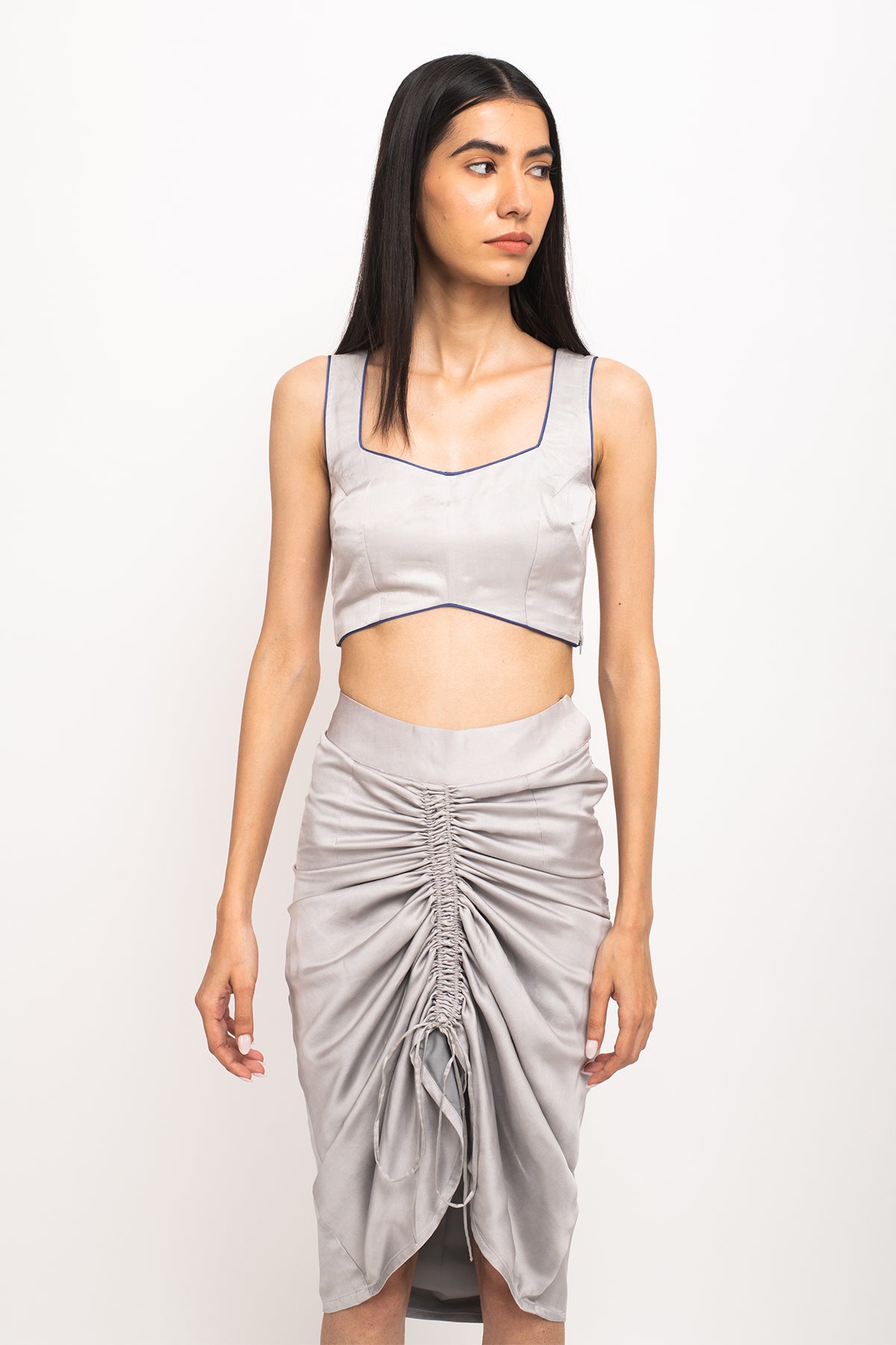 Grey bustier with blue pipin throughout and grey skirt with rouching at the front.