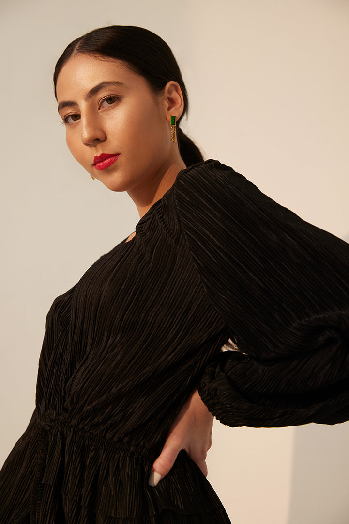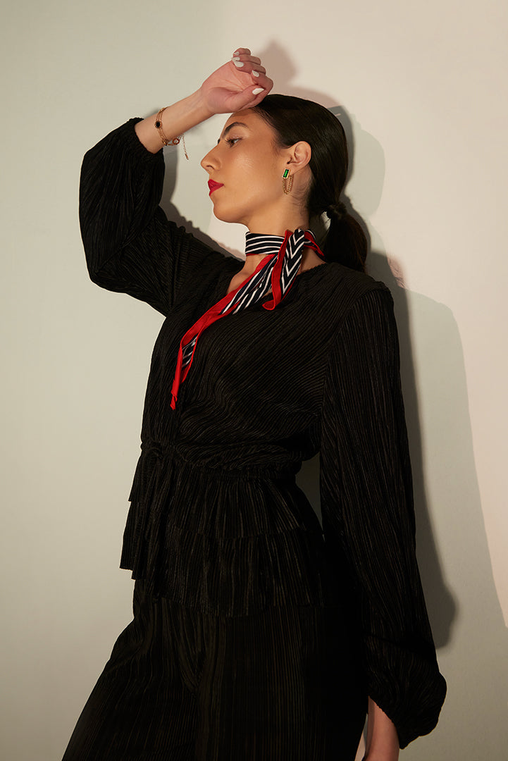 Featuring a black top in a pleated satin base with drawstring adjustment on the waist and lantern sleeves. It is paired with matching black pleated relaxed-fit flare pants. Available in plus size also.