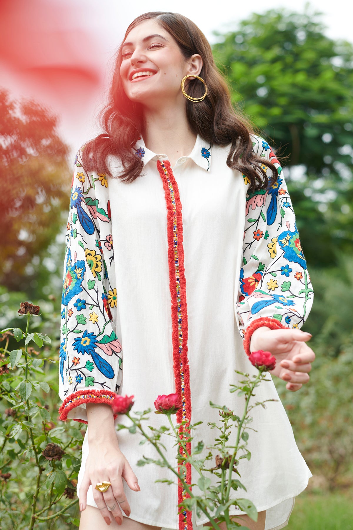 A signature piece from this Spring Summer 21 collection. This classic INES SHIRT DRESS will be a striking, timeless addition to your wardrobe. It is Crafted from a luxuriously soft cotton silk fabric and showcases the stunning flowers effect on the sleeves of shirt dress with the embroidered trim. This relaxed fit shirt dress is a special one- of-a-kind piece that will be extremely wearable. Can be Styled with flip flops at the beach as a resort wear style or a pret style with kettle heels for a brunch scene.