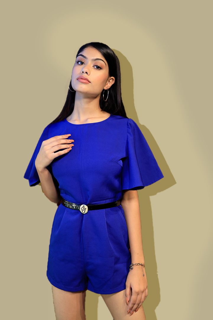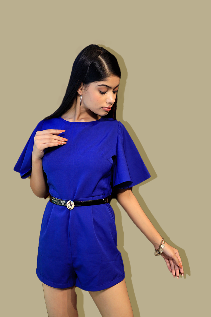 Playsuit featuring short ruffle sleeves with back zip. Available in plus sizes.