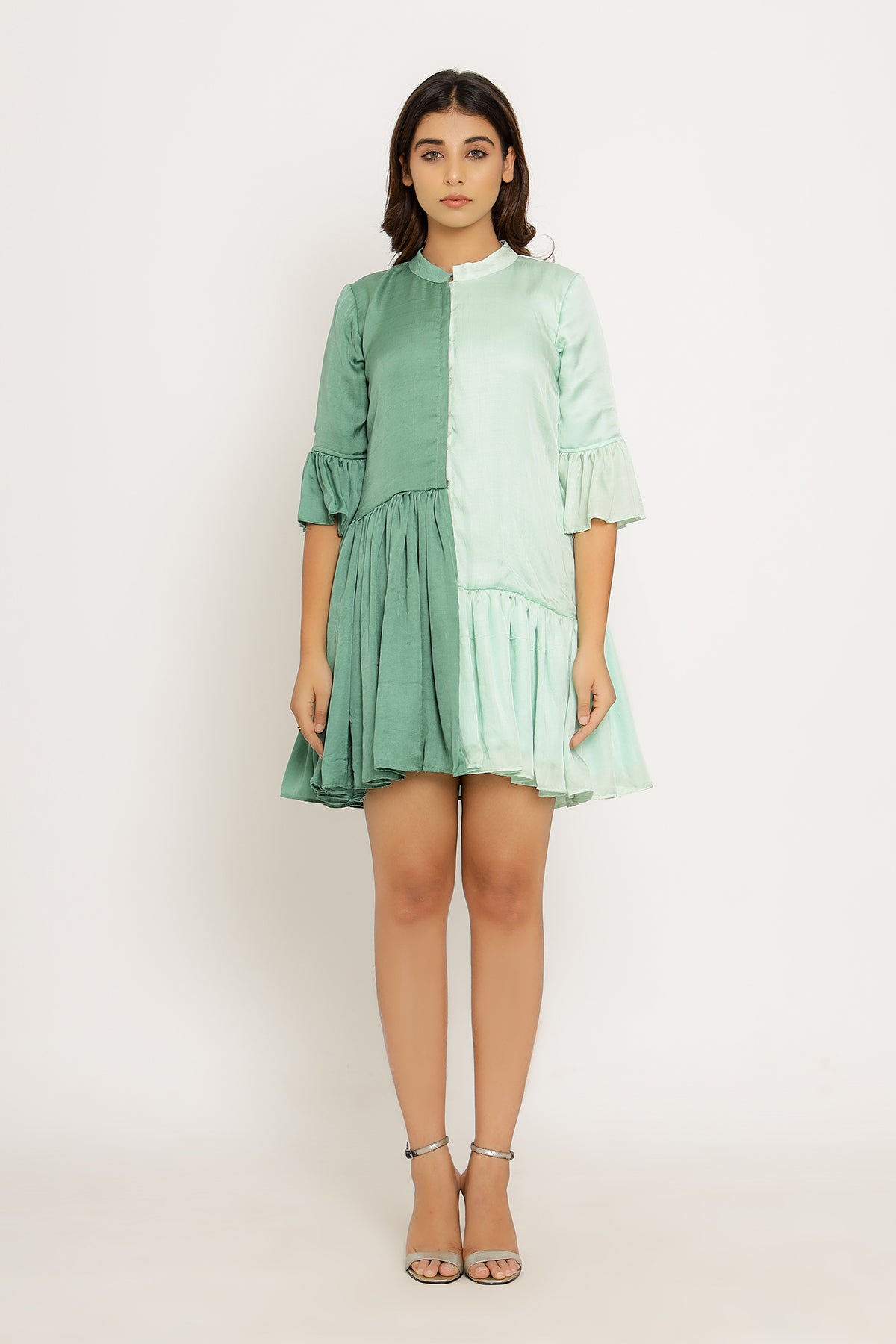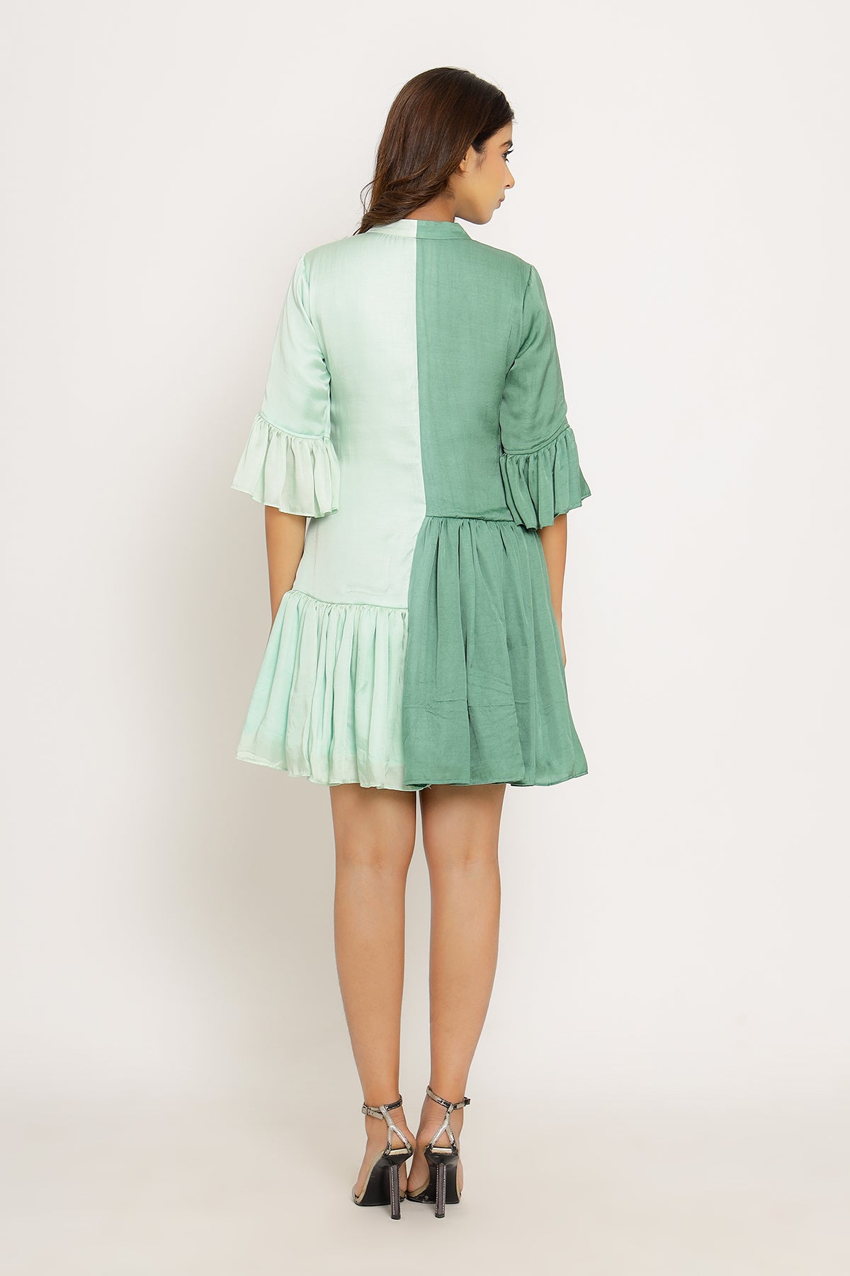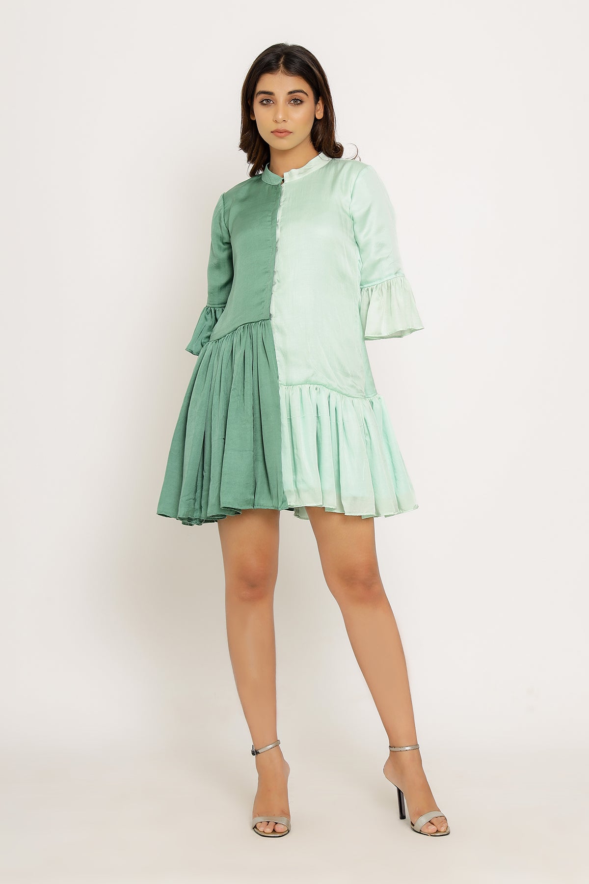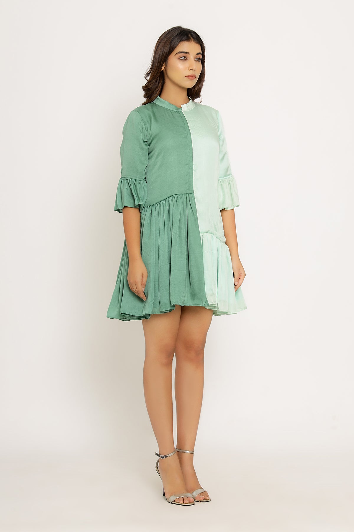 Tea Green-Teal Mid Length Dress with Asymmetrical Gathers and Elbow Sleeves with Bell Gathers.
