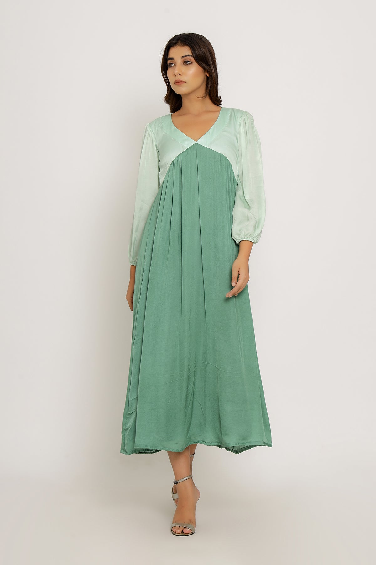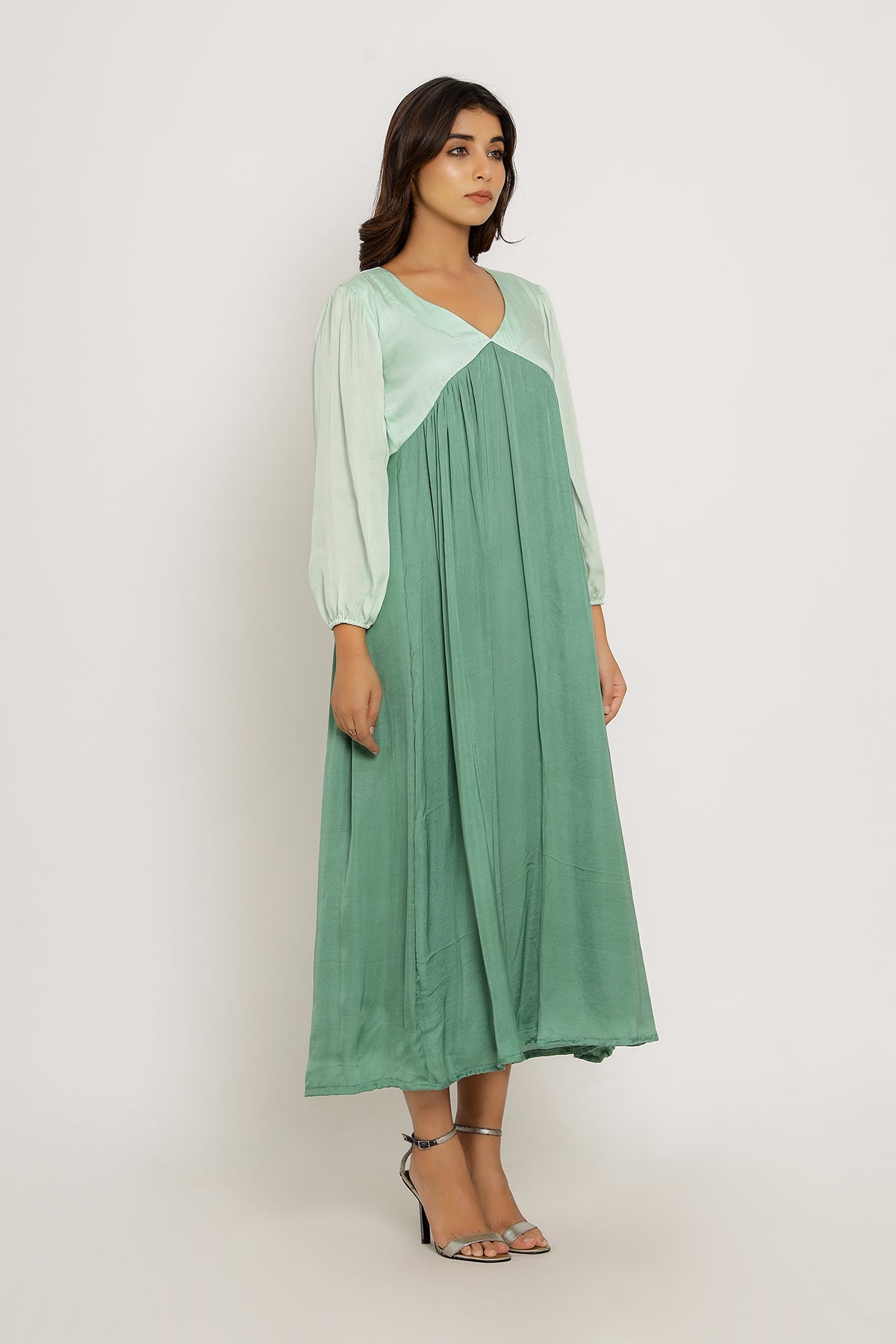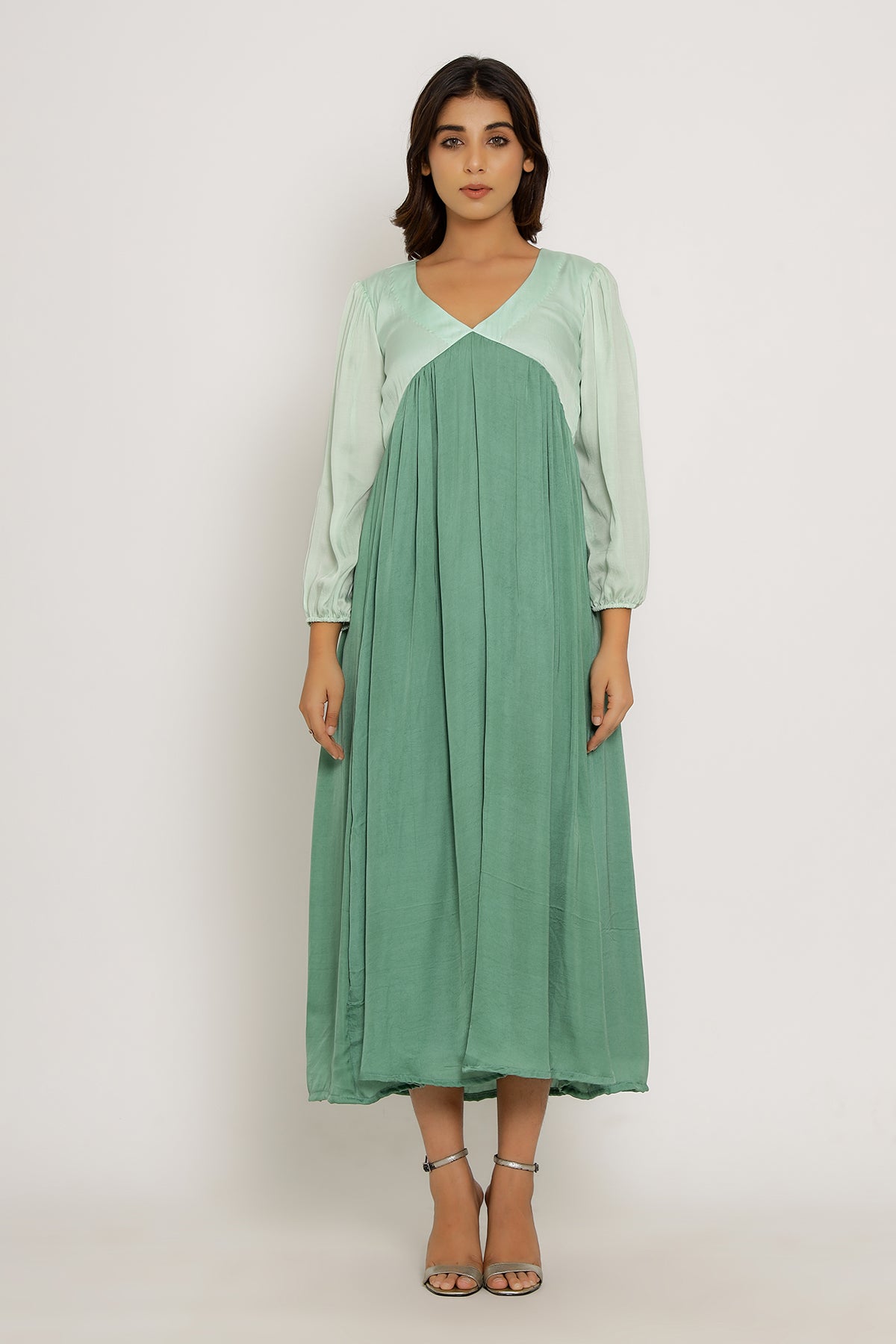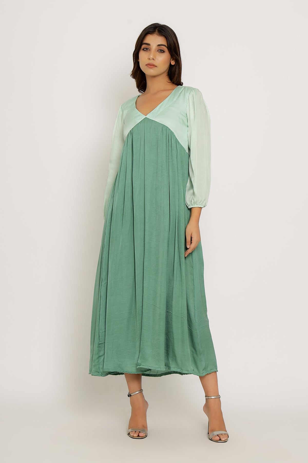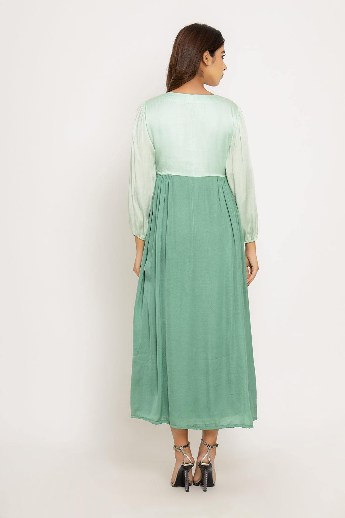 Teal-Tea Green Full Length Dress with Bishop Sleeves and Gathers.Length of the Garments: 50