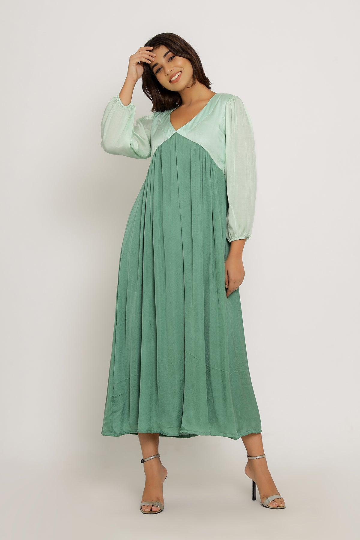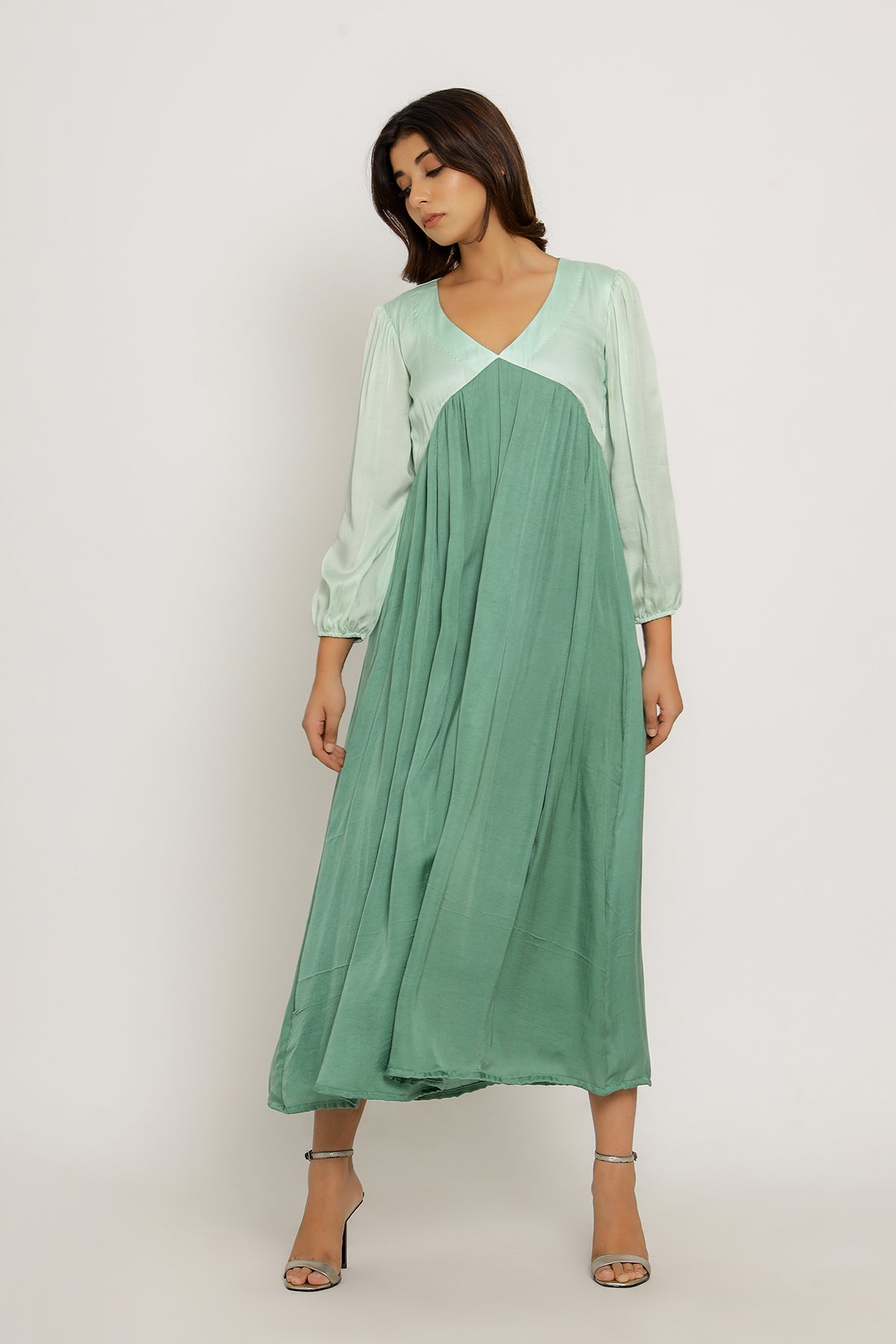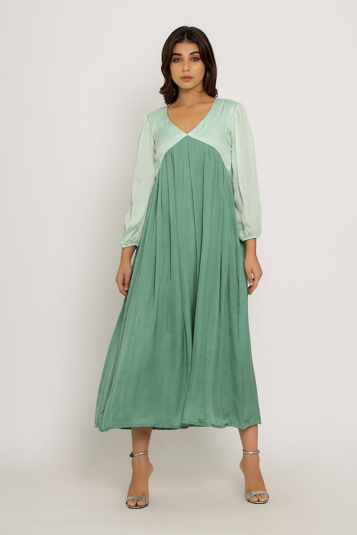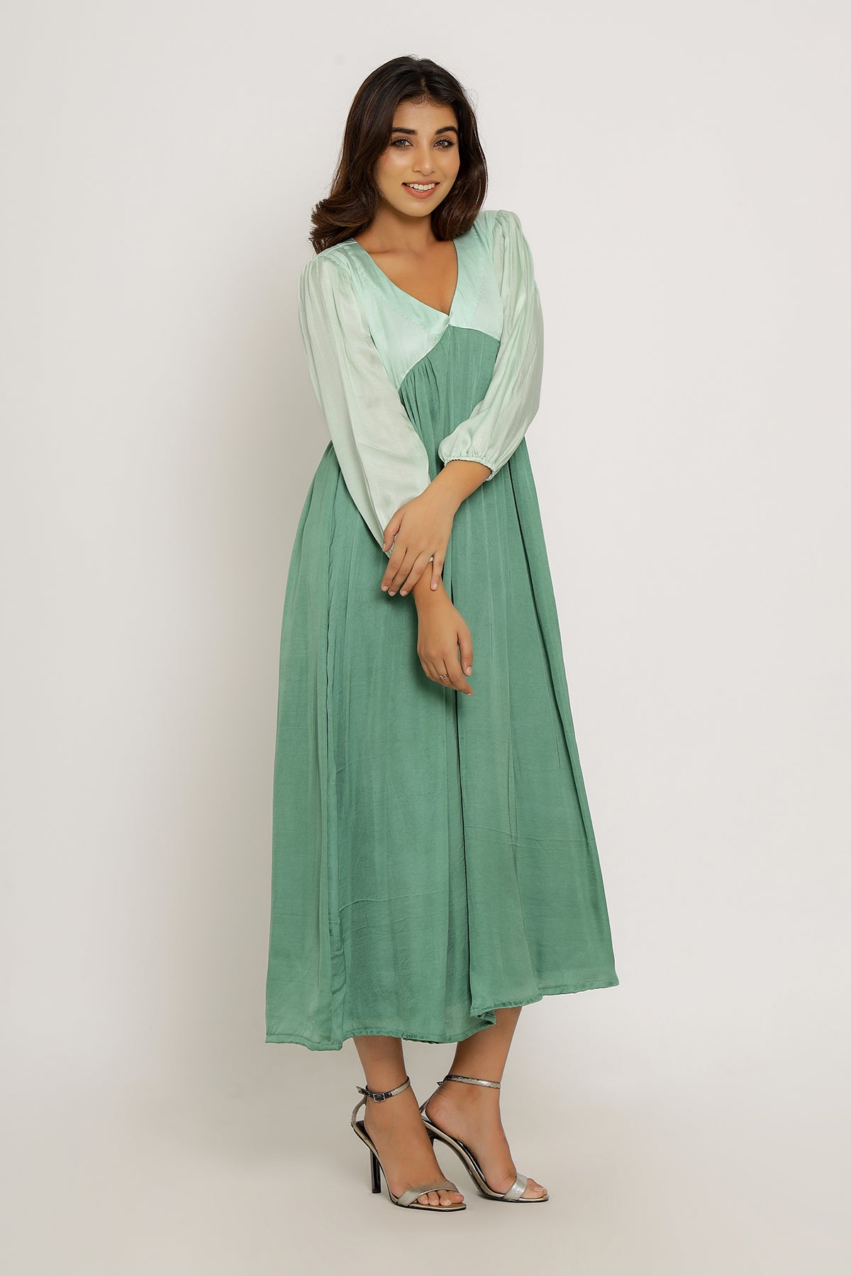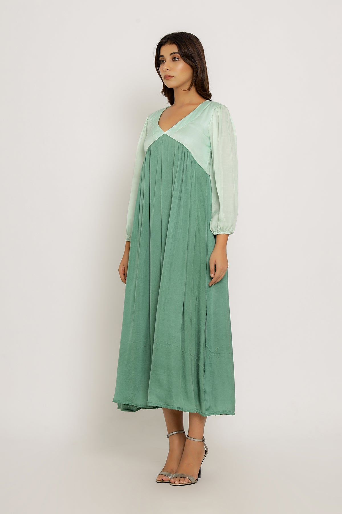 Teal-Tea Green Full Length Dress with Bishop Sleeves and Gathers.Length of the Garments: 50