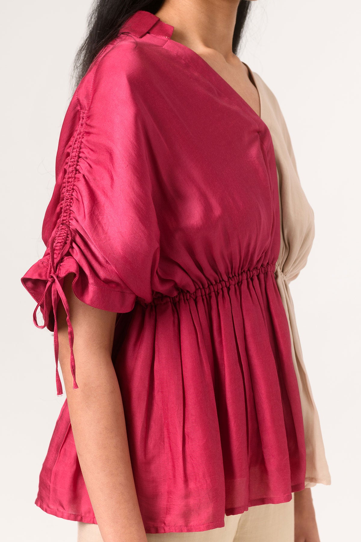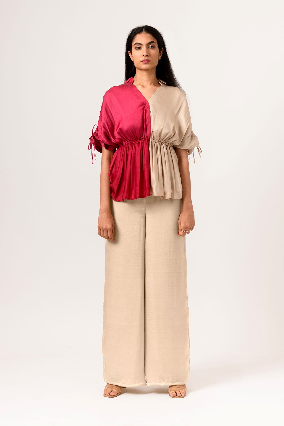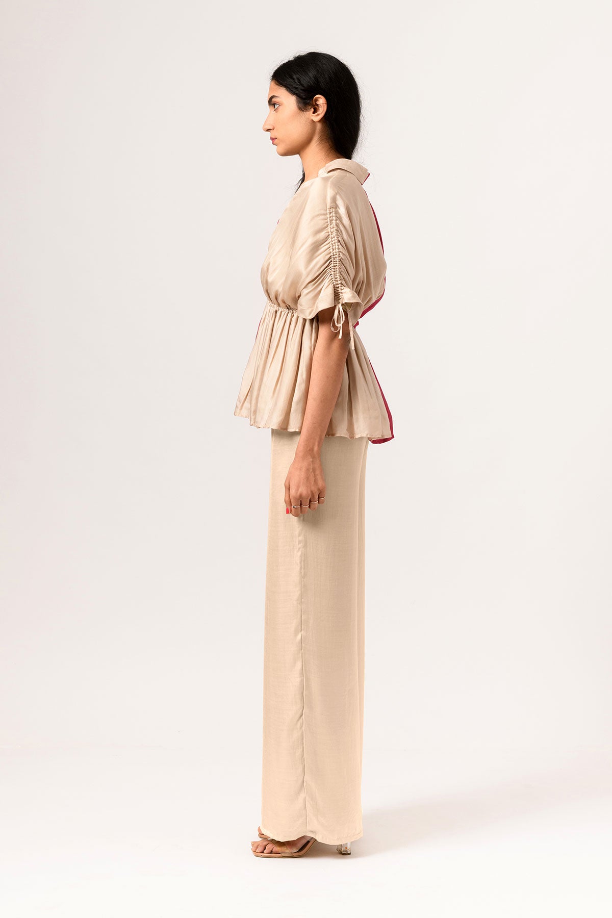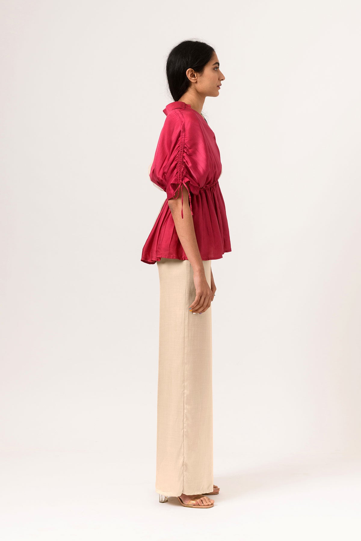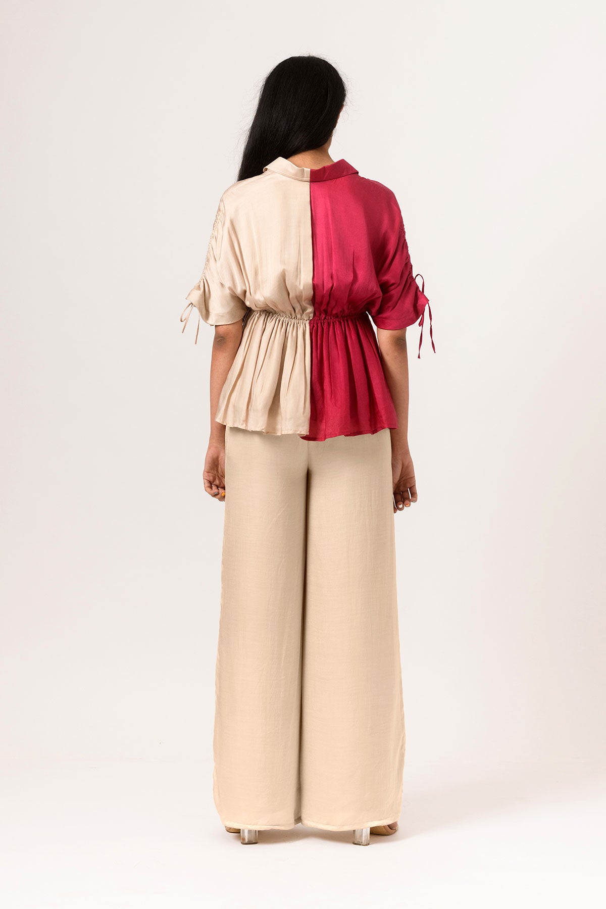 Wine-Ecru Half Sleeves Co-ord Set with detailing on the sleeve and waist with wide legged pants.Length of the Garments: 28 Top, 40 Pant