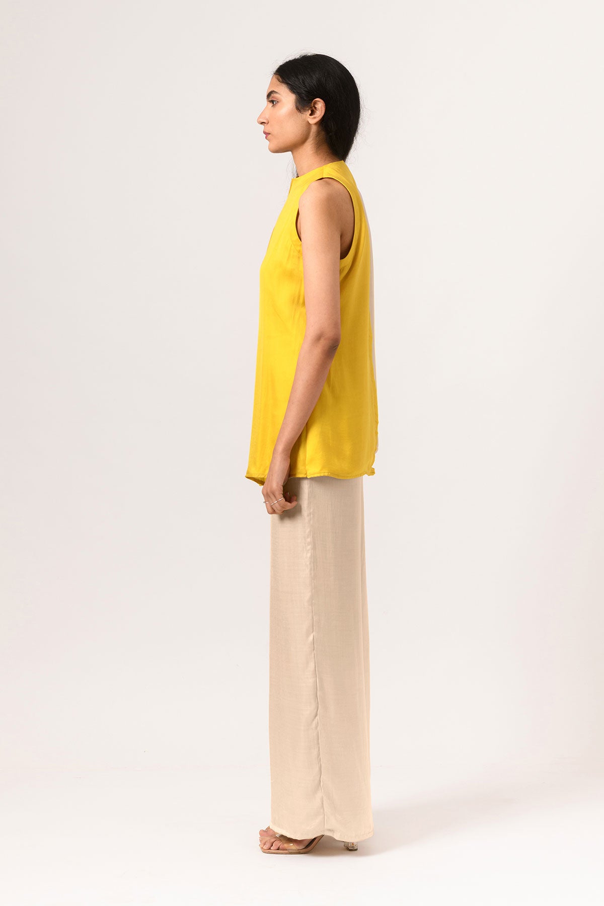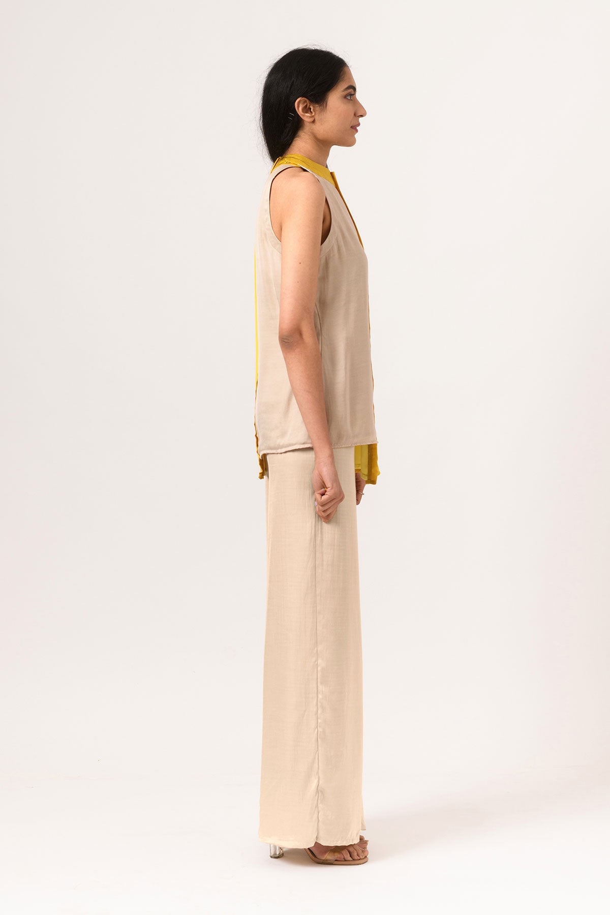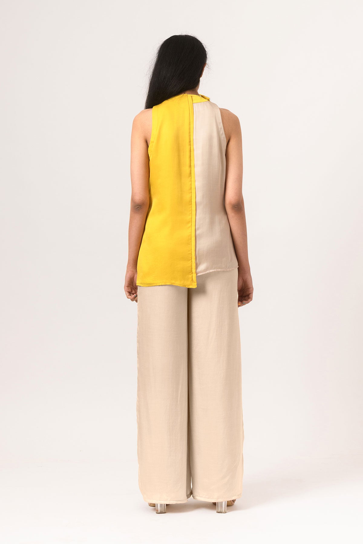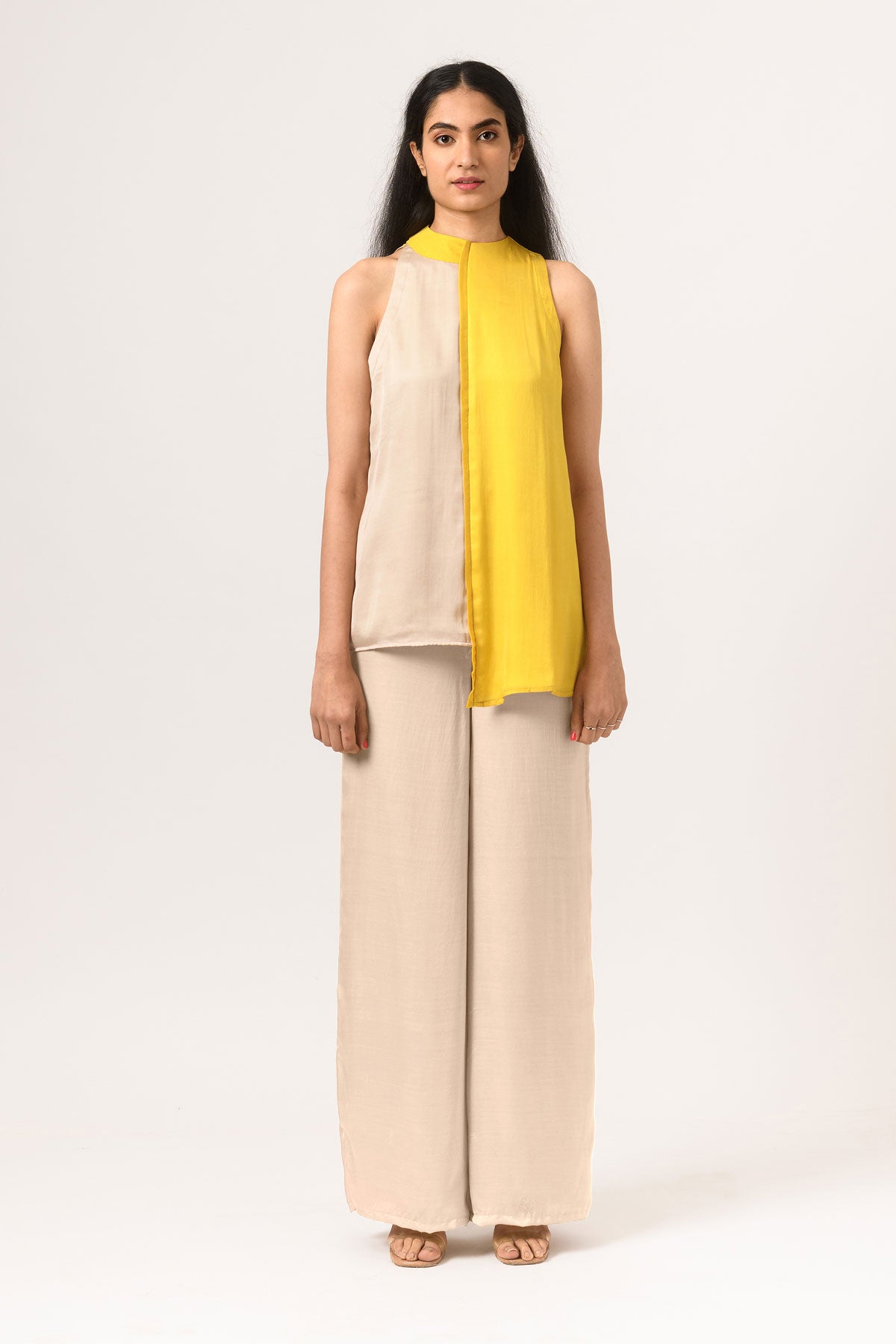 Yellow-Ecru Halter Neck co-ord set with wide legged pants.
