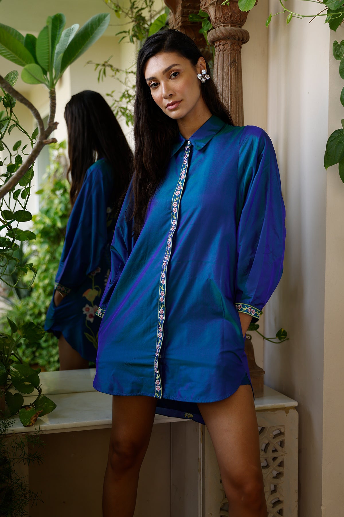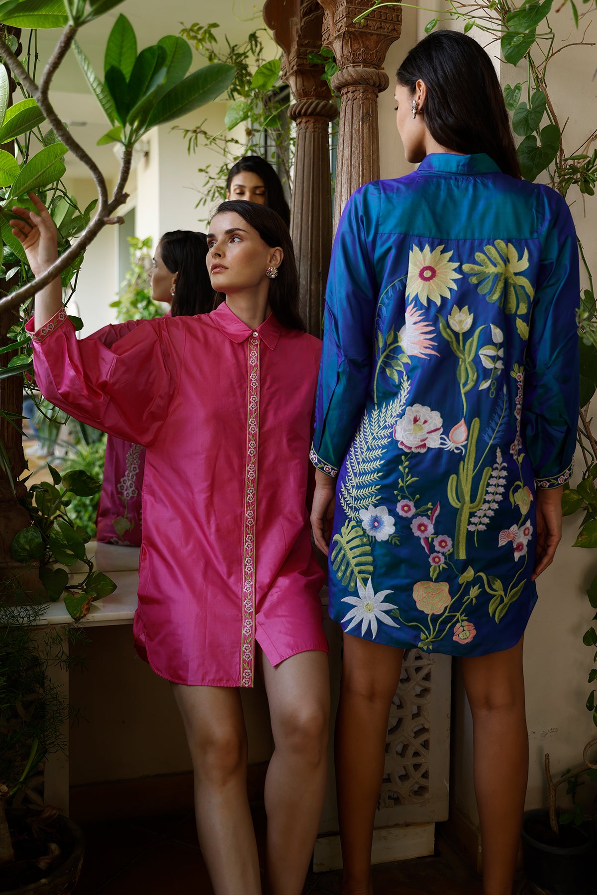 A signature piece from this Spring Summer 22 collection. This classic Nika 1.0 LIOR DRESS will be a striking, timeless addition to your wardrobe. It is Crafted from a luxuriously soft silk fabric and showcases the stunning flowers on its back along with the beautiful trim embroidered on the placket and cuffs. This relaxed fit shirt dress/top is a special one- of-a-kind piece that will be extremely wearable. Can be Styled with flip flops at the beach as a resort wear style or a pret style with kettle heels for a brunch scene.