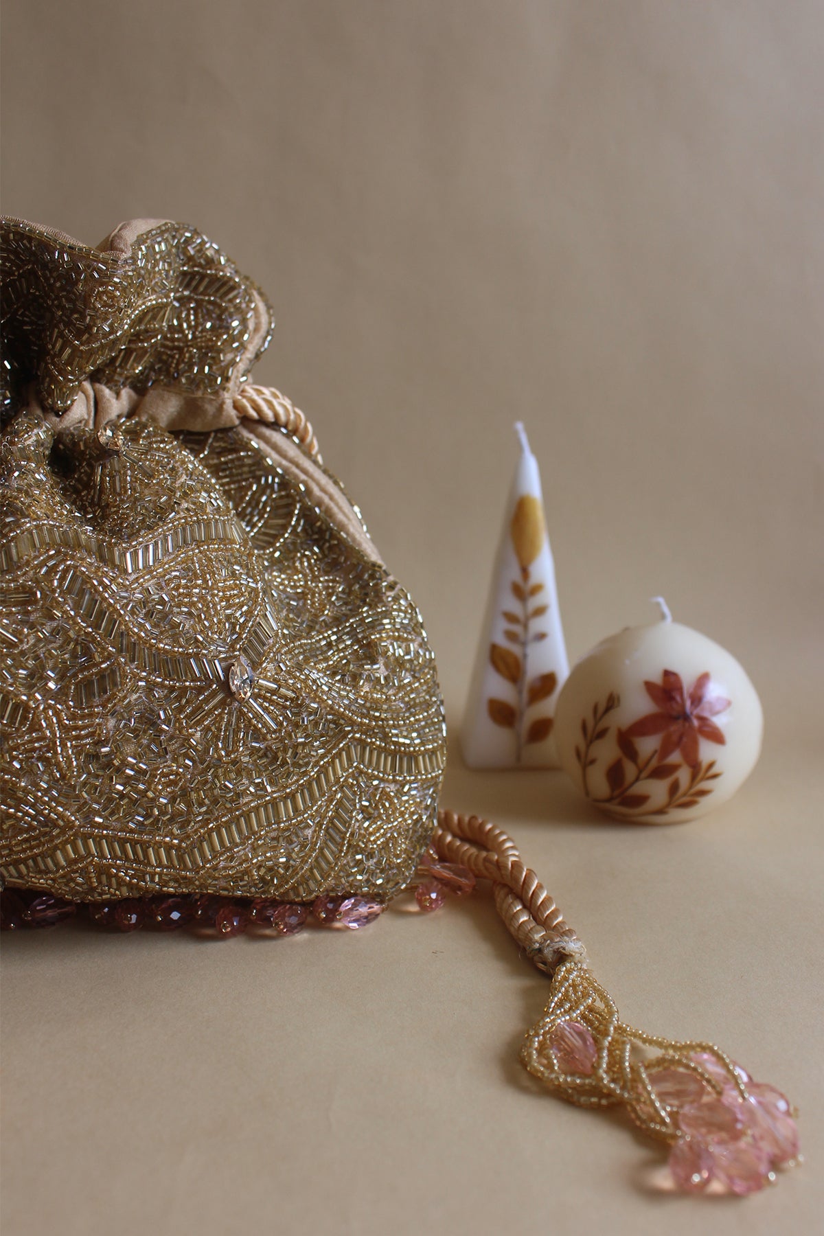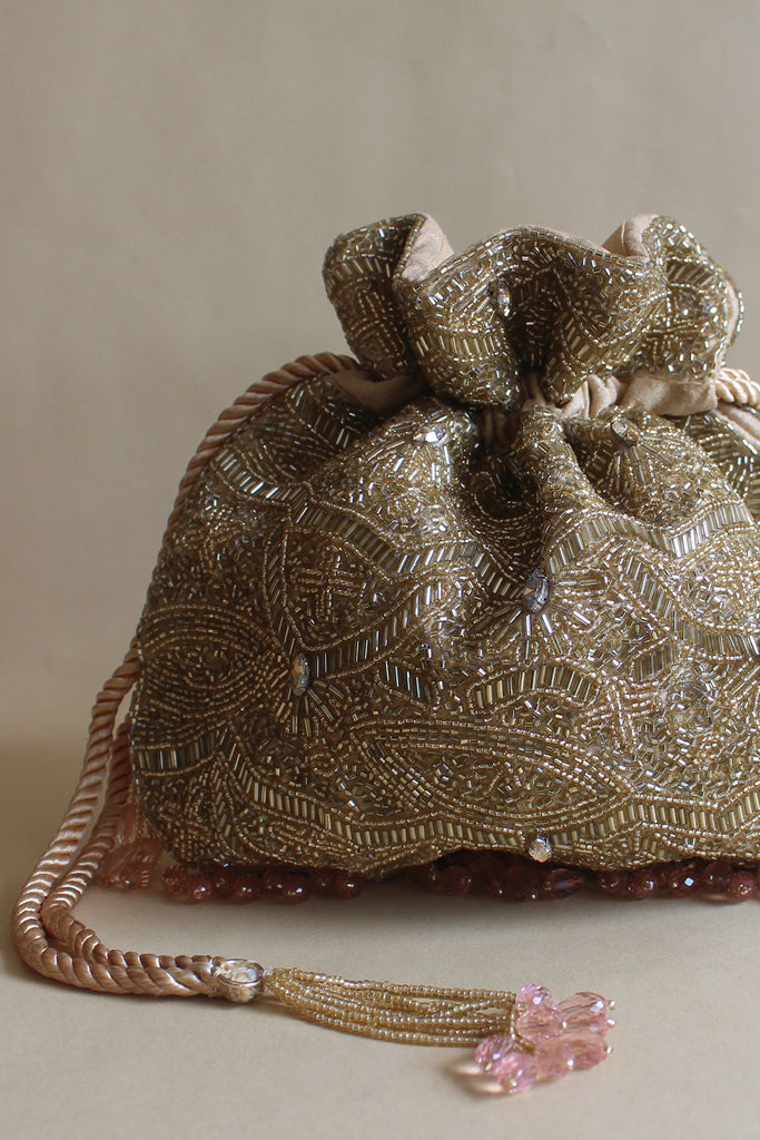 Hand embroidered, gold potli with gold cut dana embroidery and crystal tassels. Work on both sides.