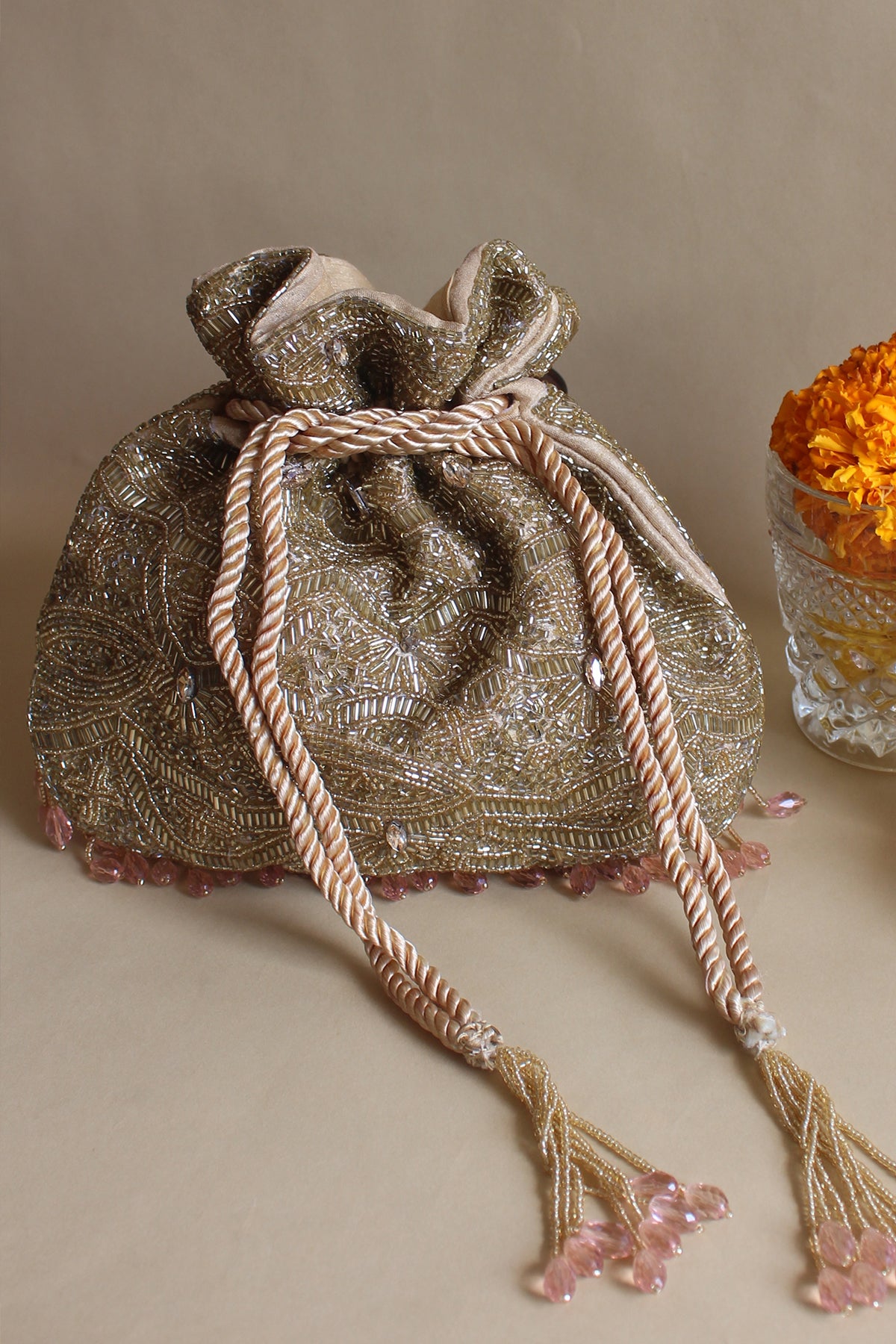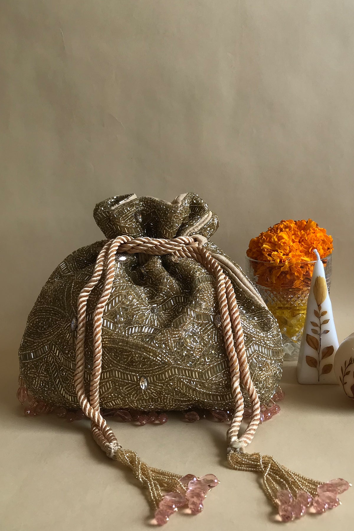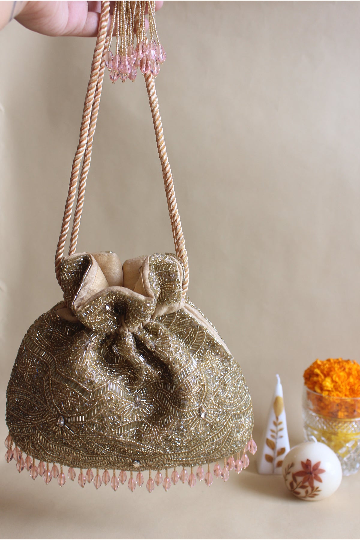 The crystal gold potli is embedded with sequins work all over and crystal tassels edged at the bottom to complete your traditional look.