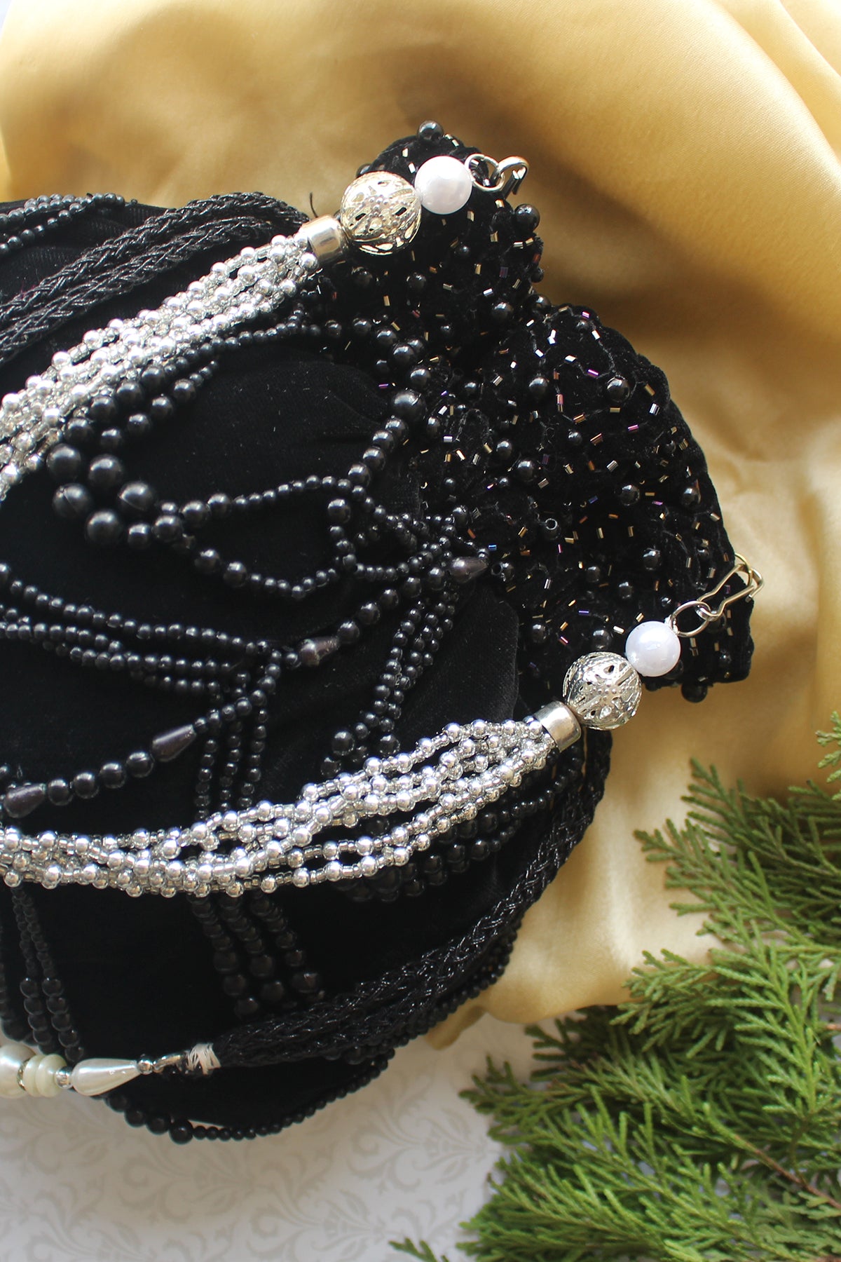 Black velvet potli with Black bead work . The potli comes with a detachable beaded handle. Work on both sides.