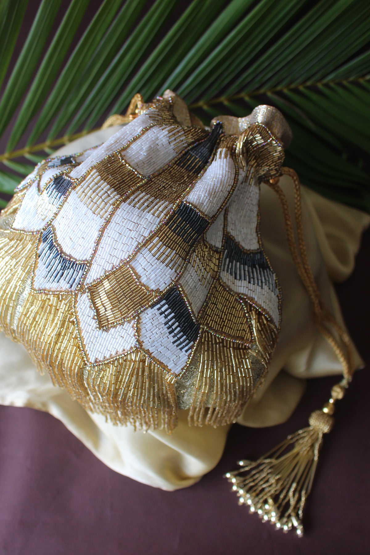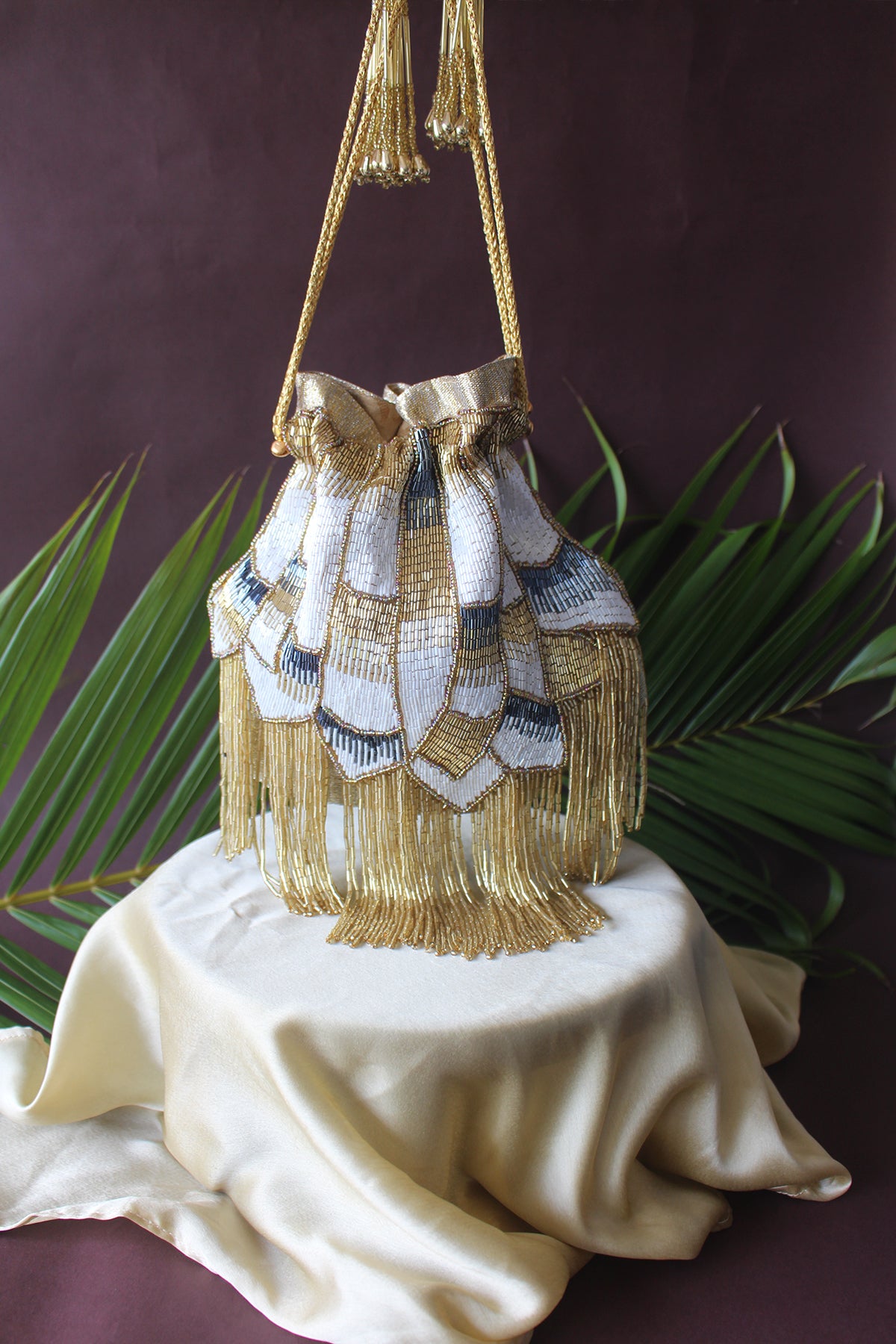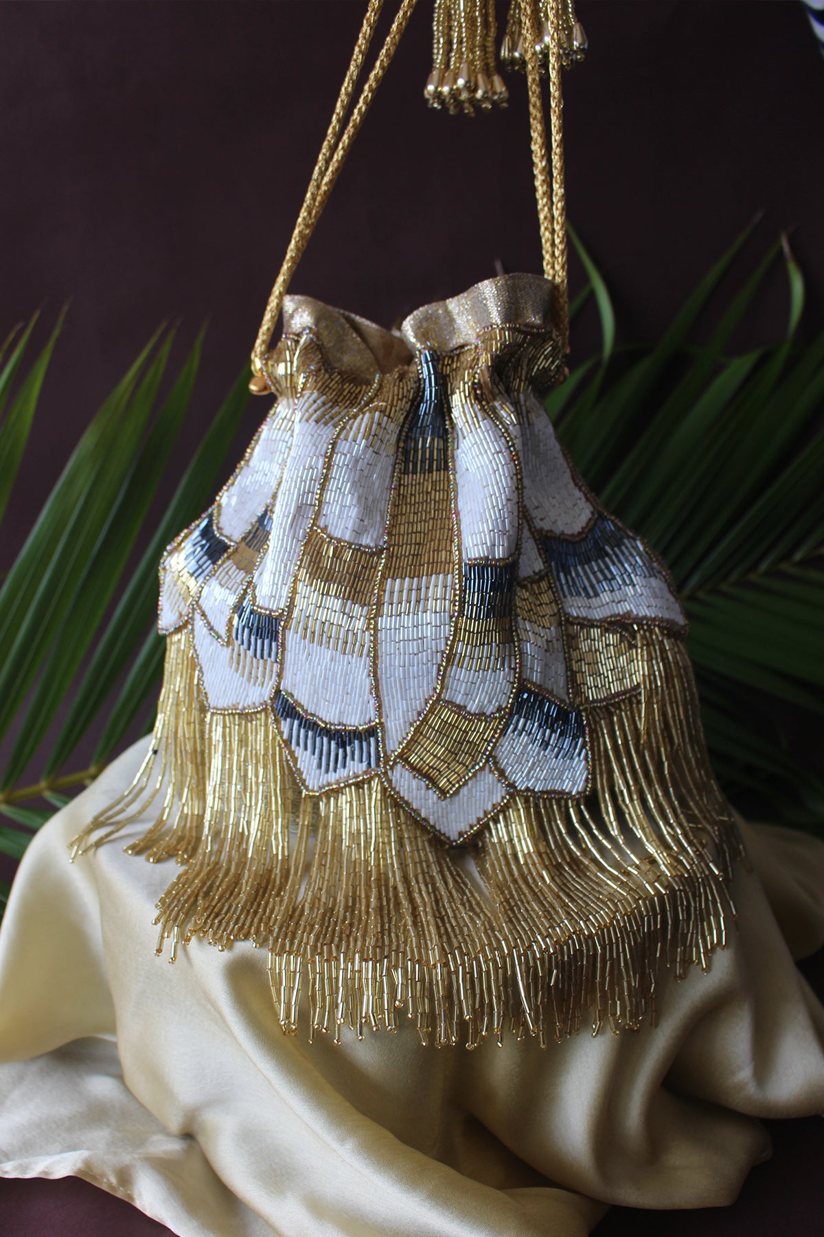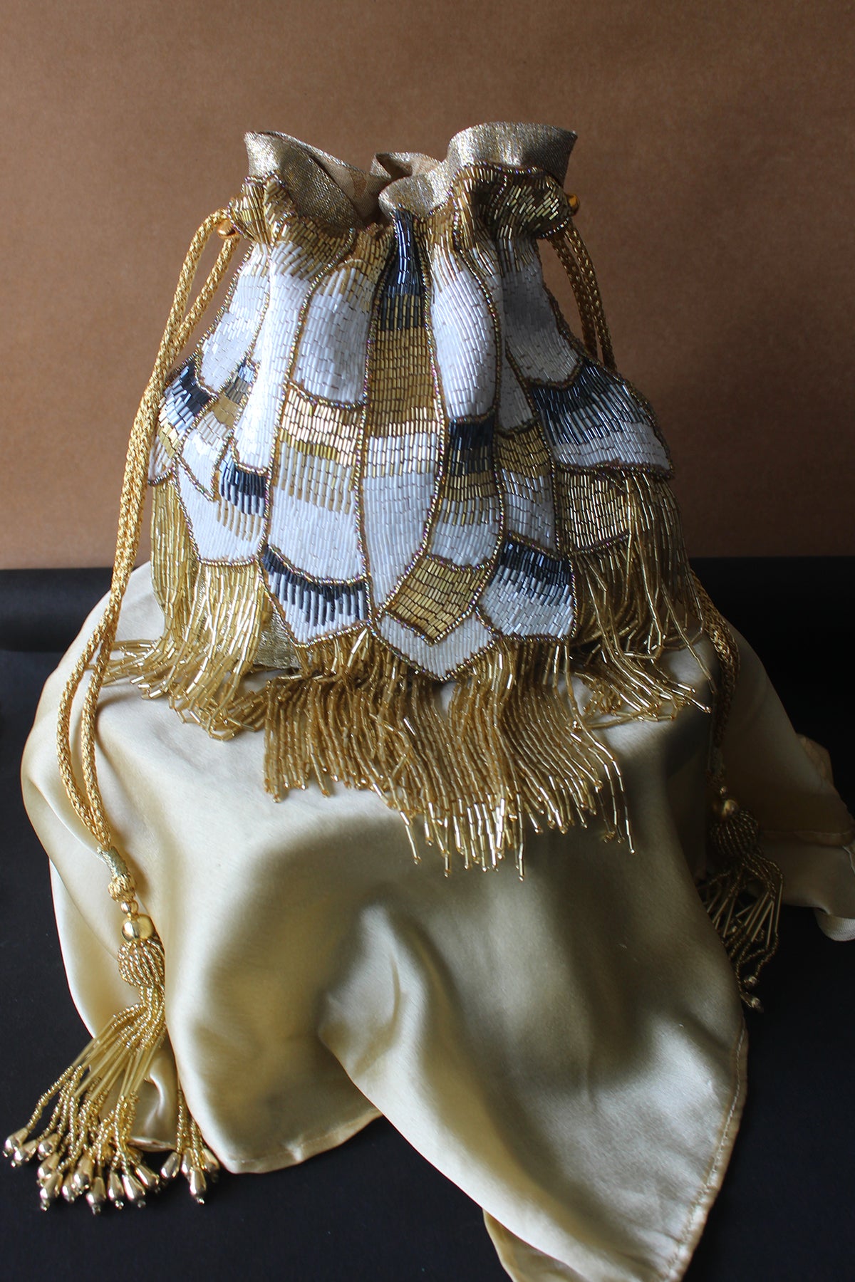 Hand work, shaded potli with sali work and gold tassels. Work on both sides. A 18 iinch chain is provided to enable you to wear the potli on your arm and be handsfree.