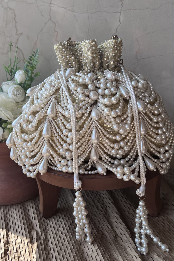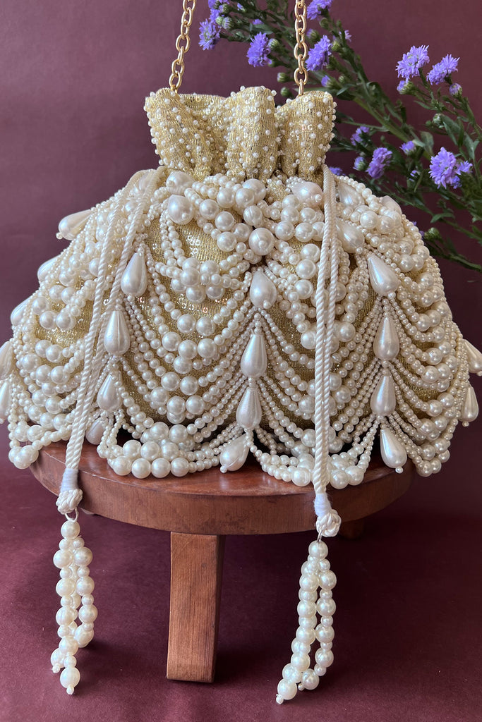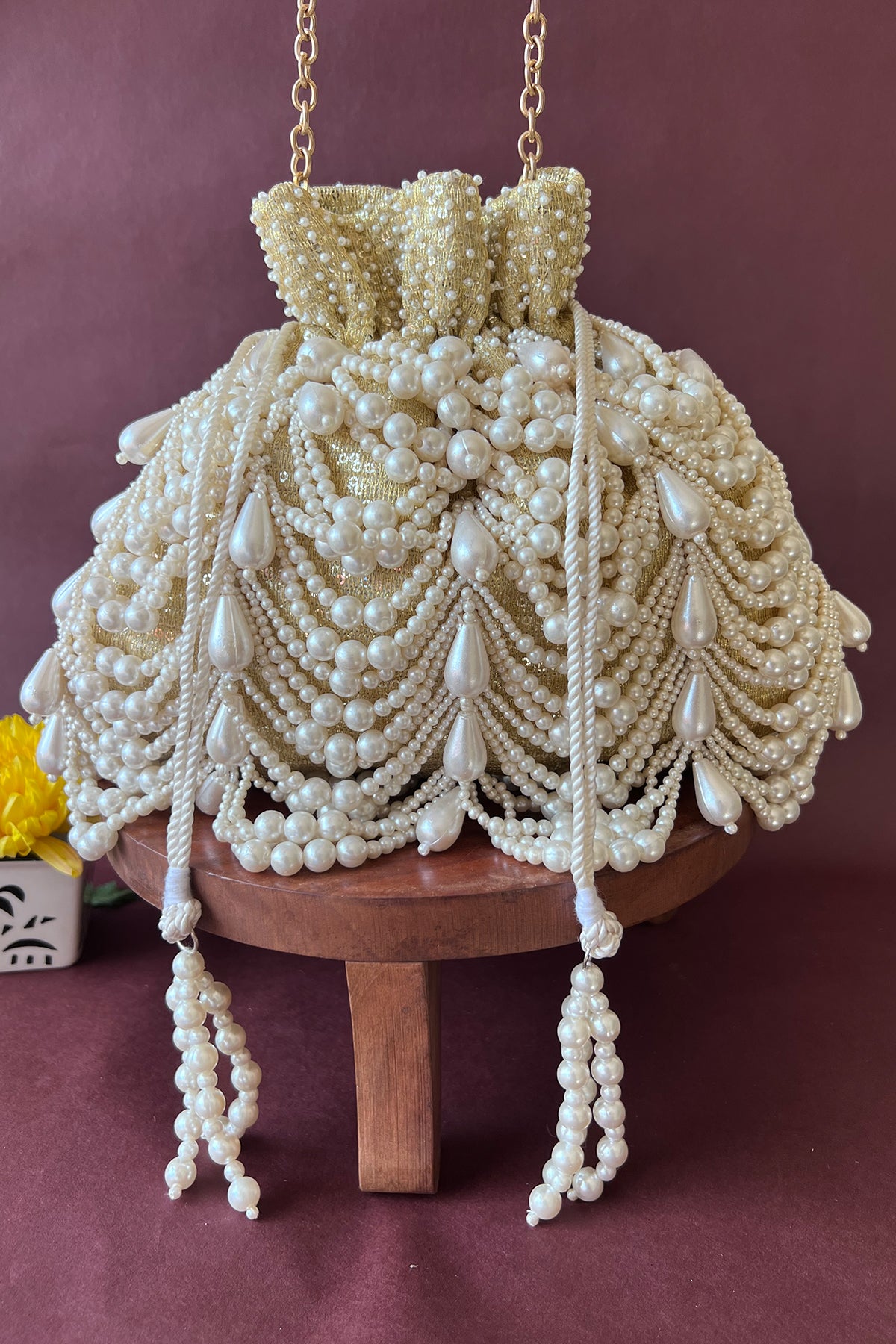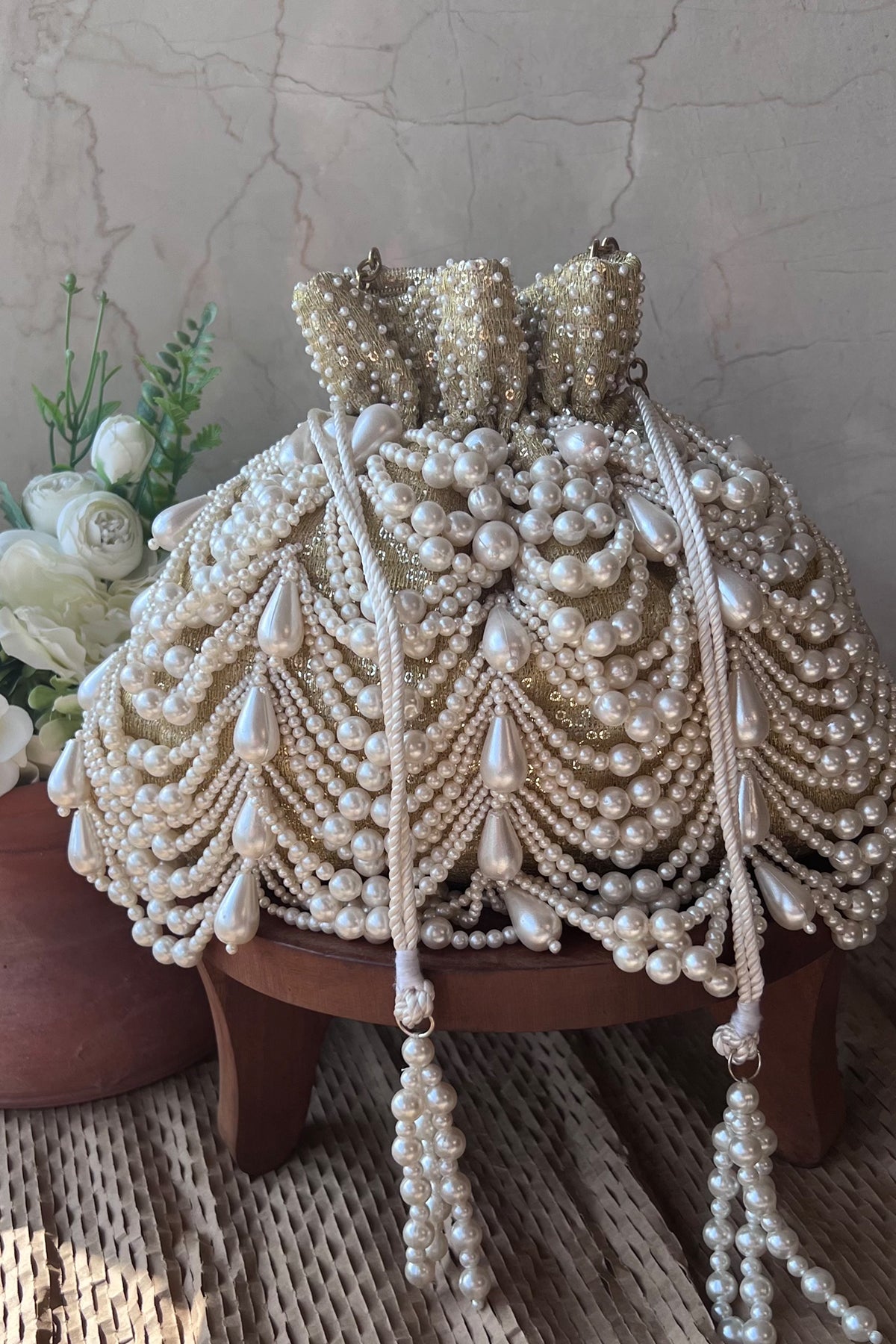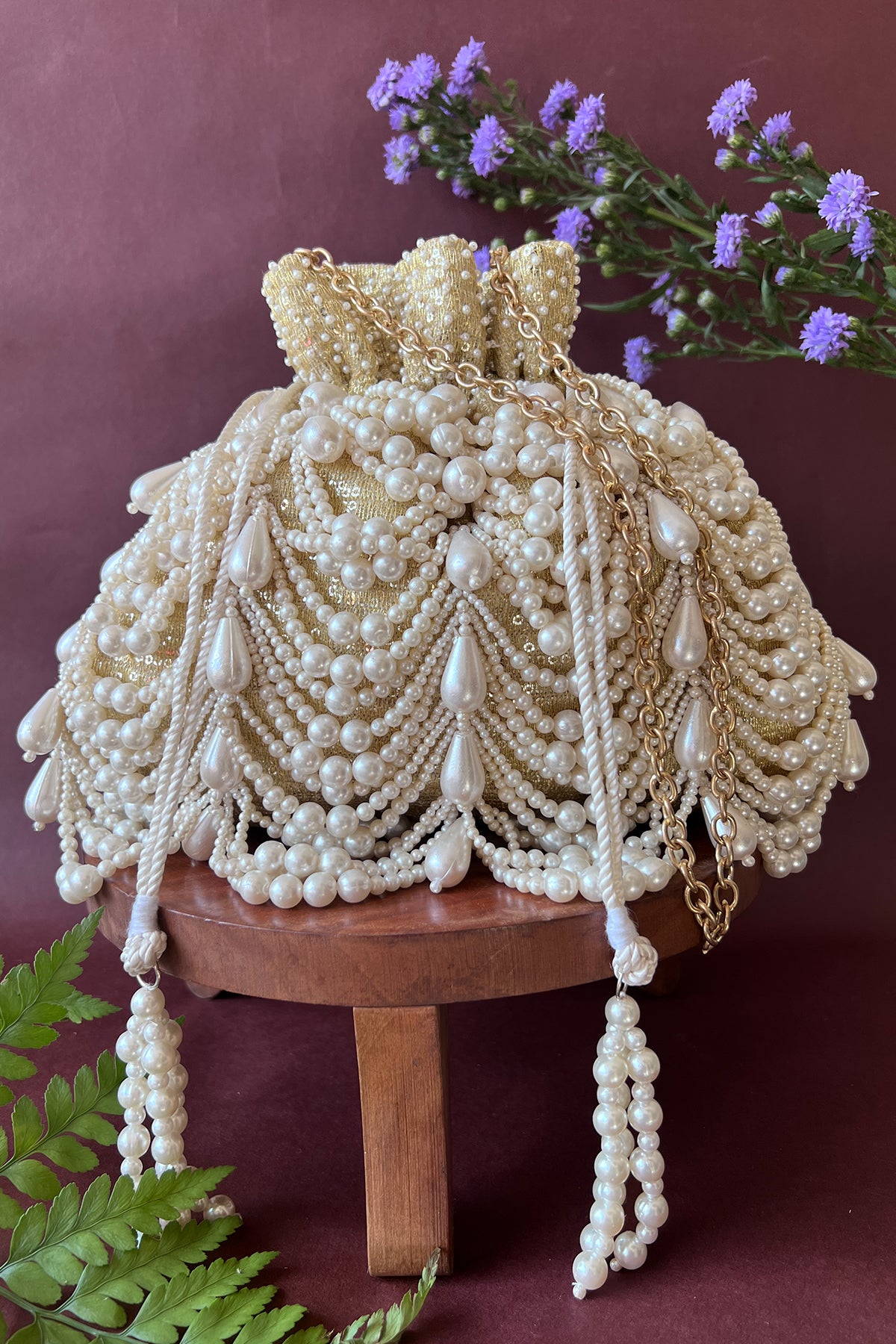 Light Gold velvet potli with a scallop of dainty pearls to bring in the perfect look anytime of the day.