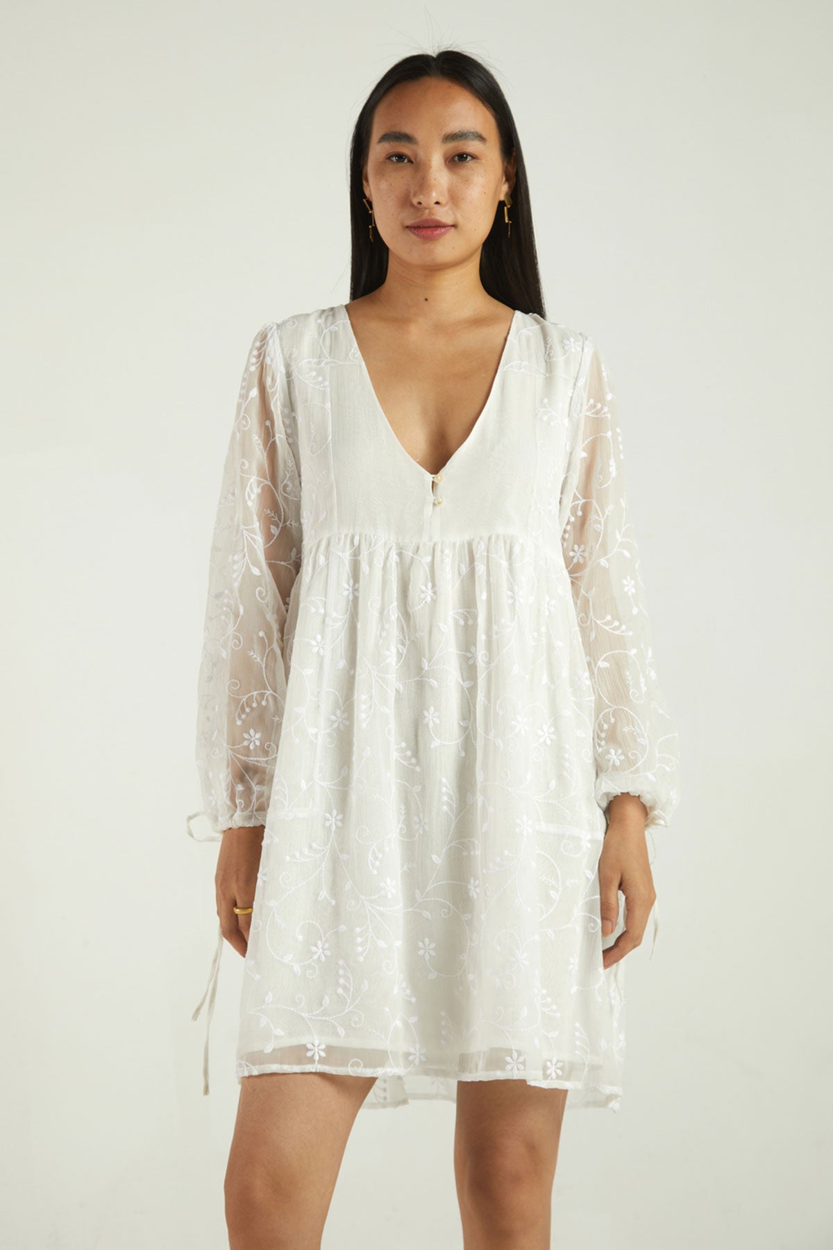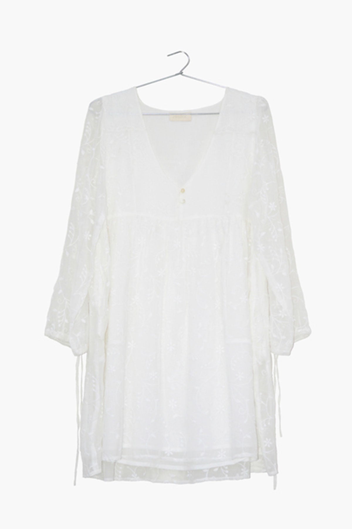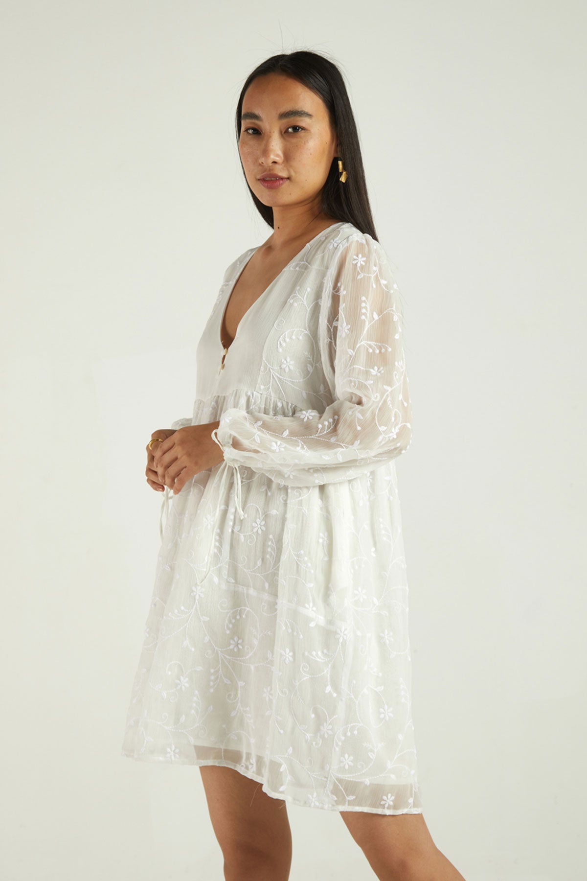 An embroidered chiffon dress, the sheer sleeves and gathered waist give this piece a whimsical quality.