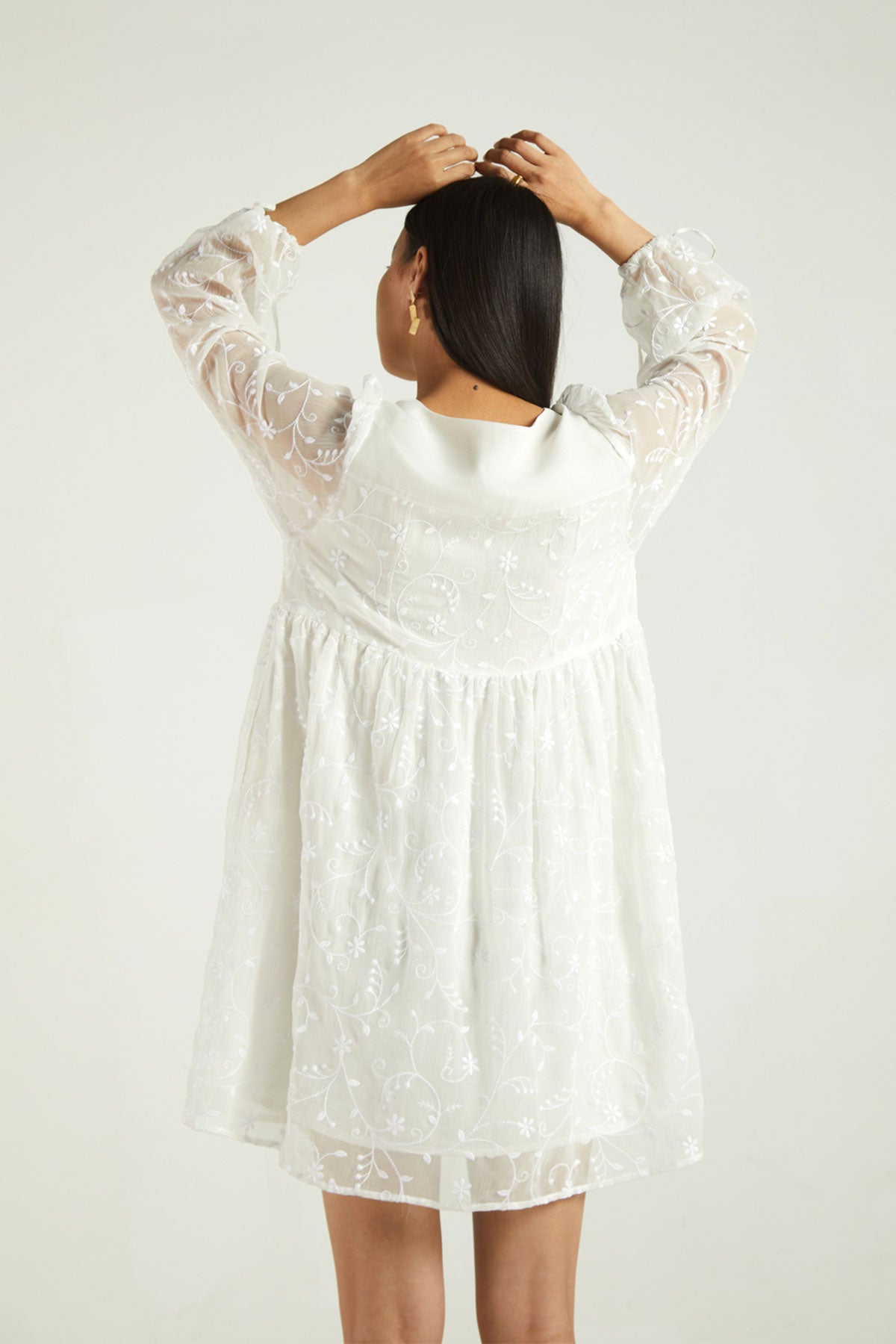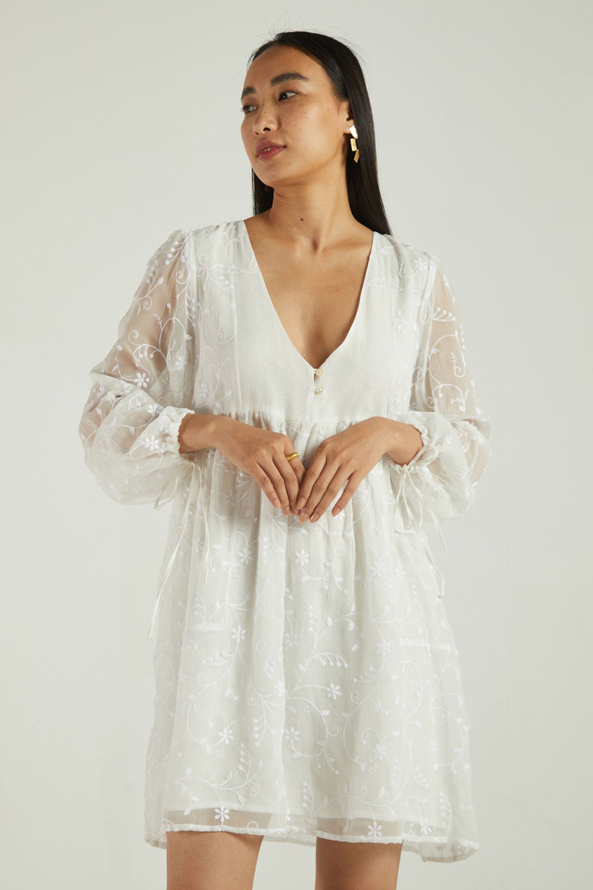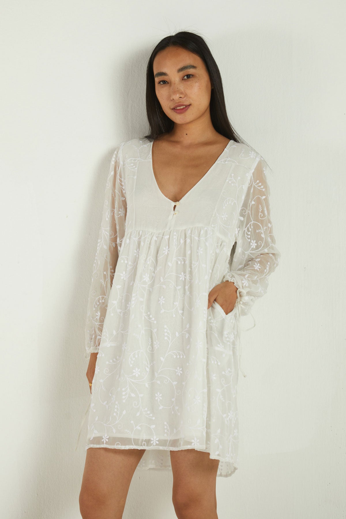 An embroidered chiffon dress, the sheer sleeves and gathered waist give this piece a whimsical quality.