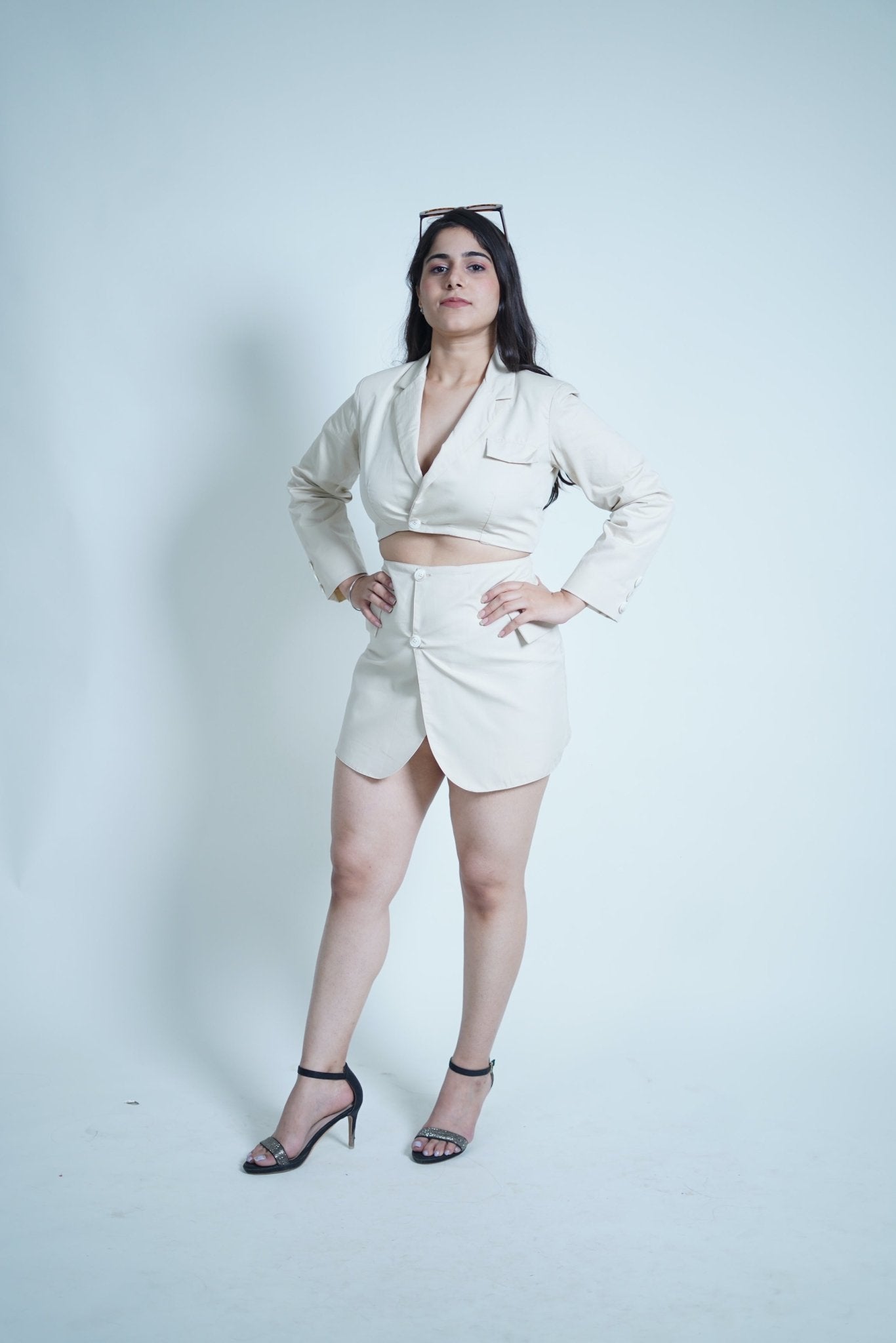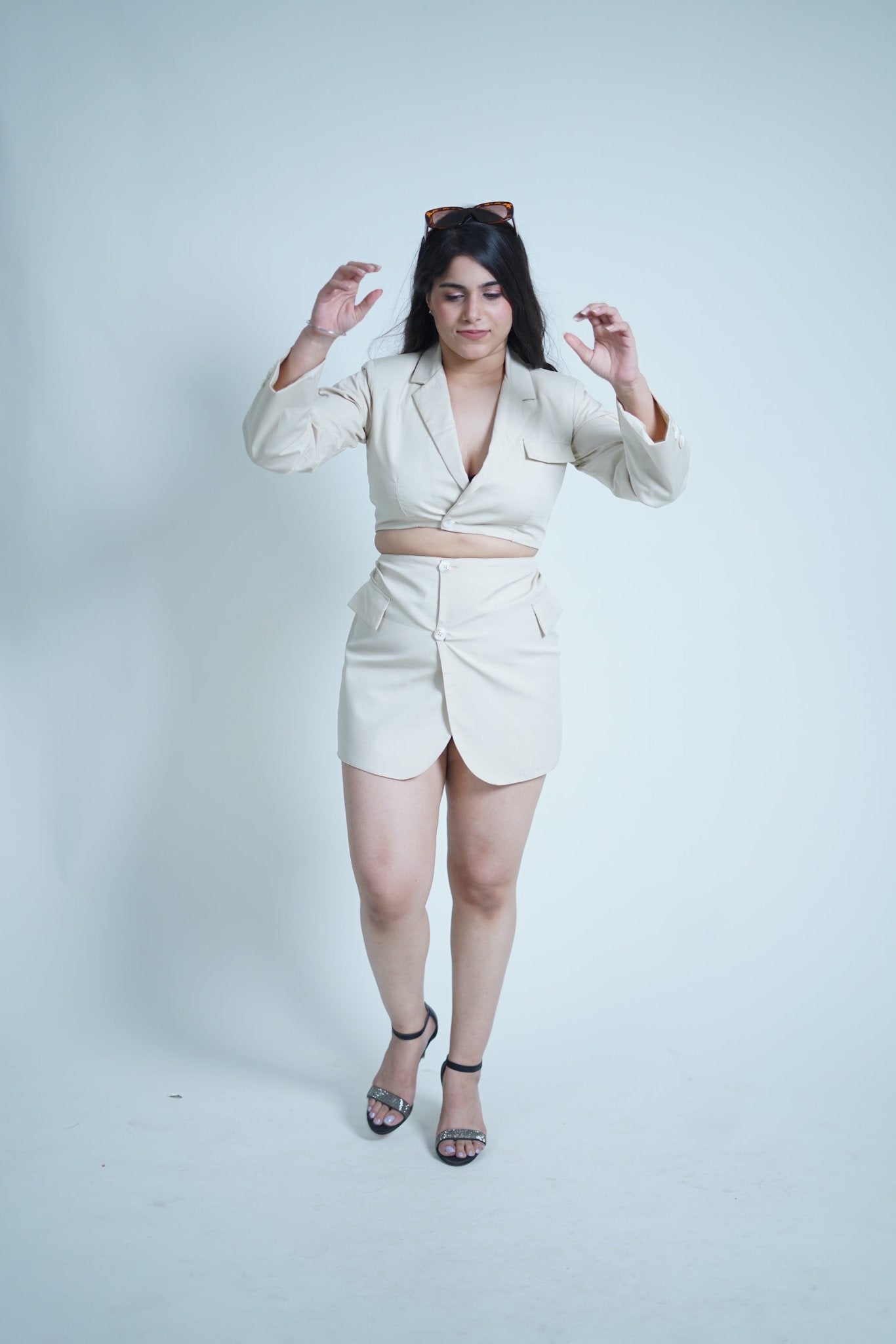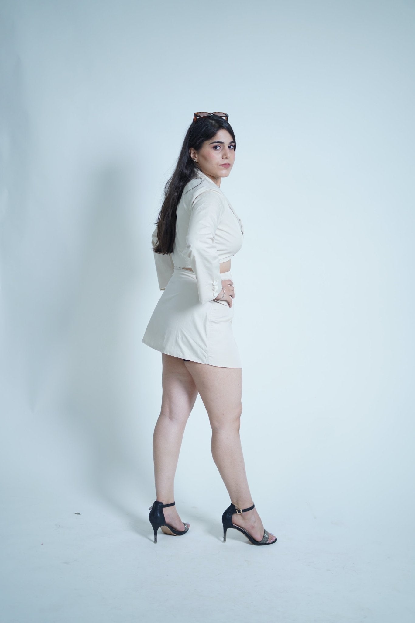 Long sleeves cropped double breasted blazer with light shoulder pads. With high-waisted mini skirt with faux flaps and creme buttons