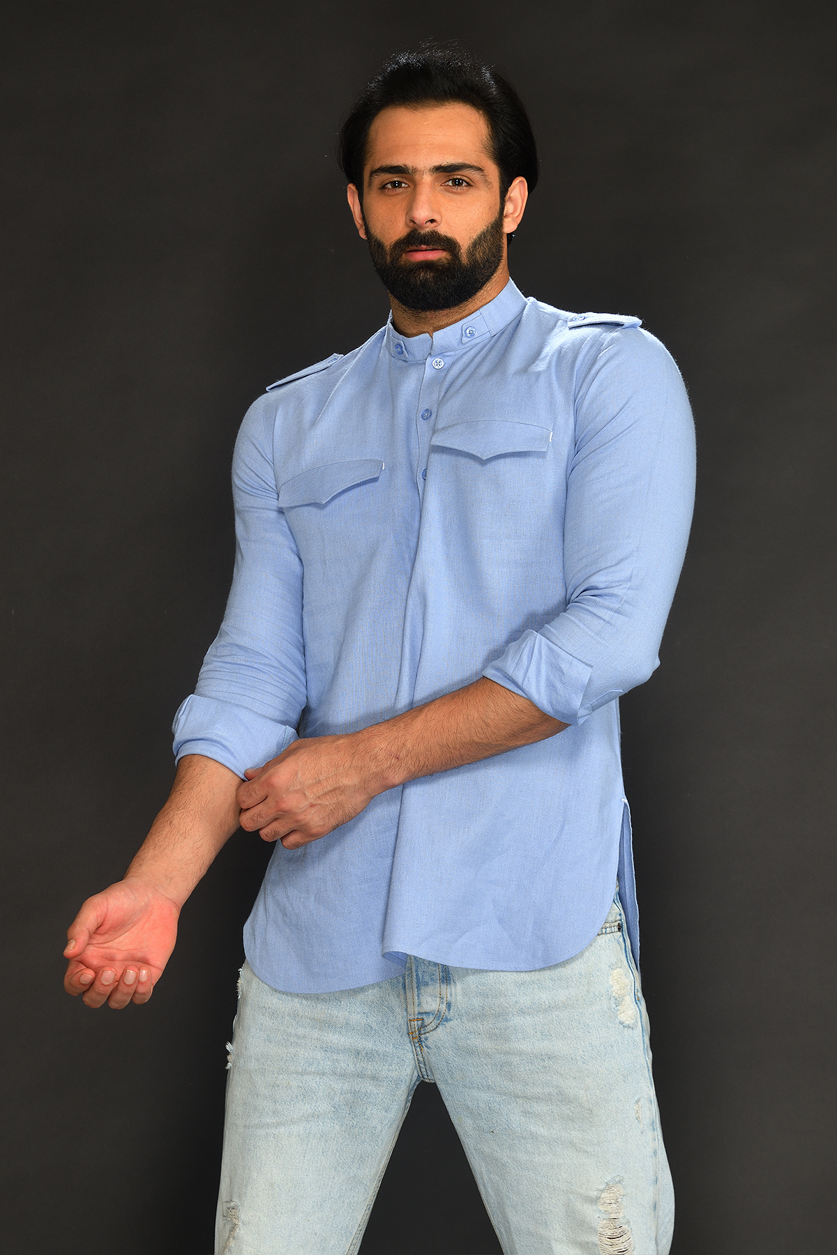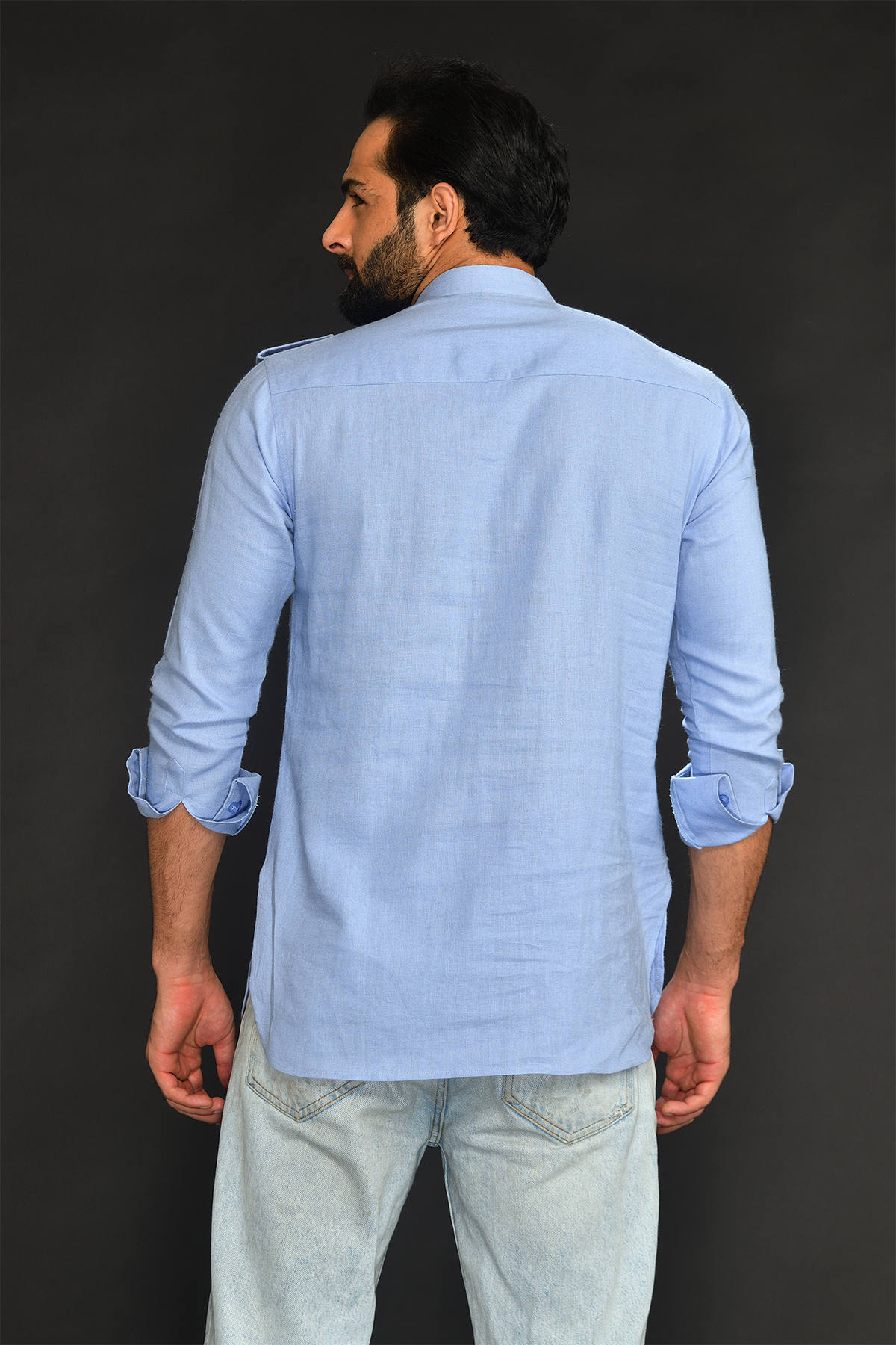 Fabric Compostion: Linen VisLining Material: 100% CottonColor: Sky BlueFit: RelaxedNeck Type: Collar