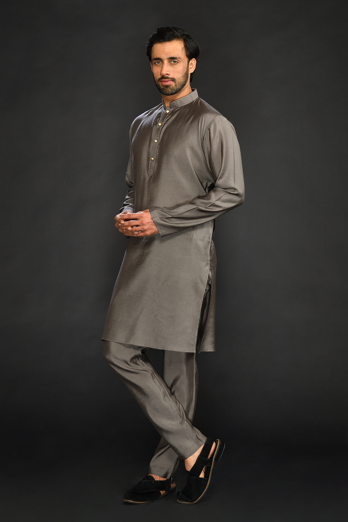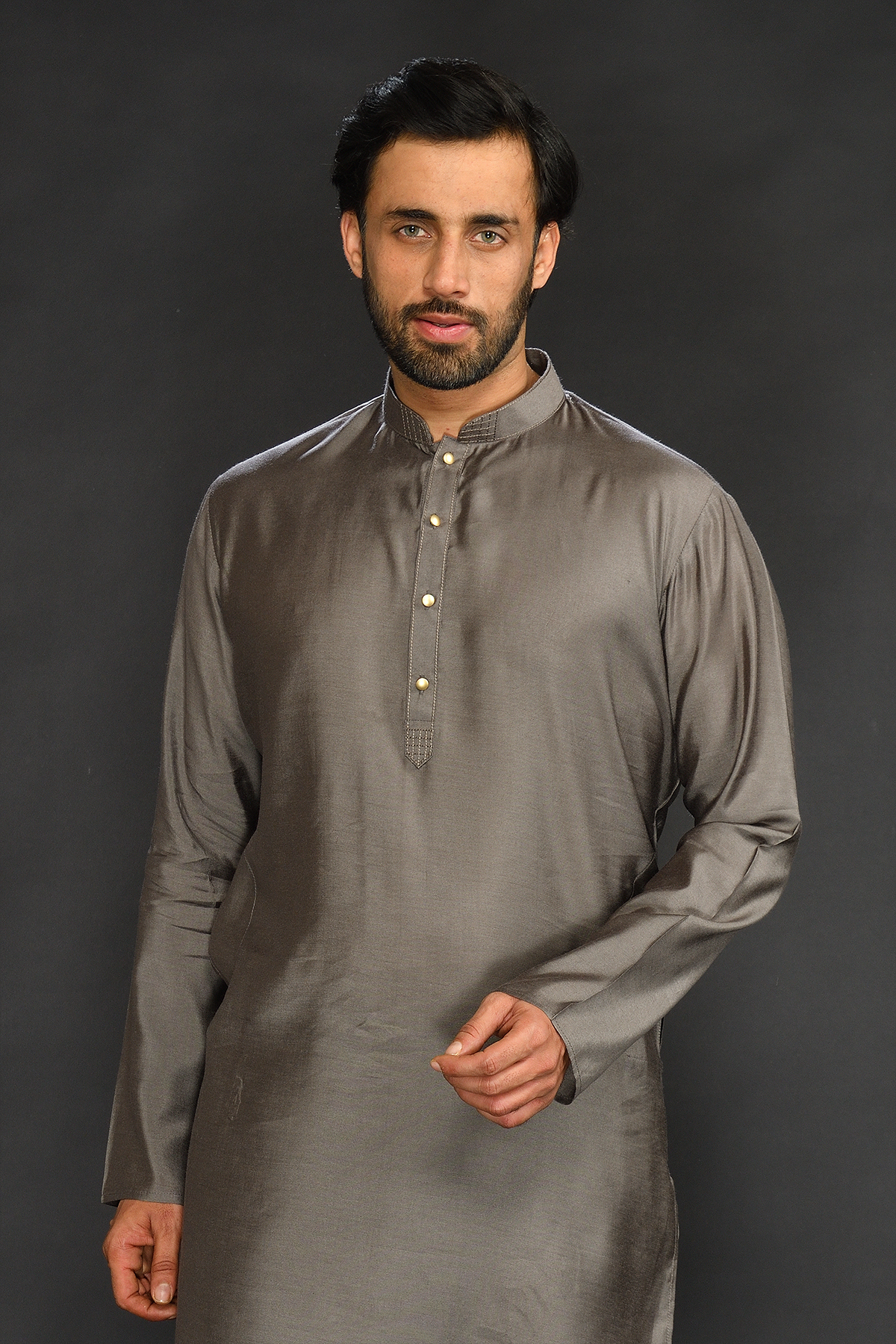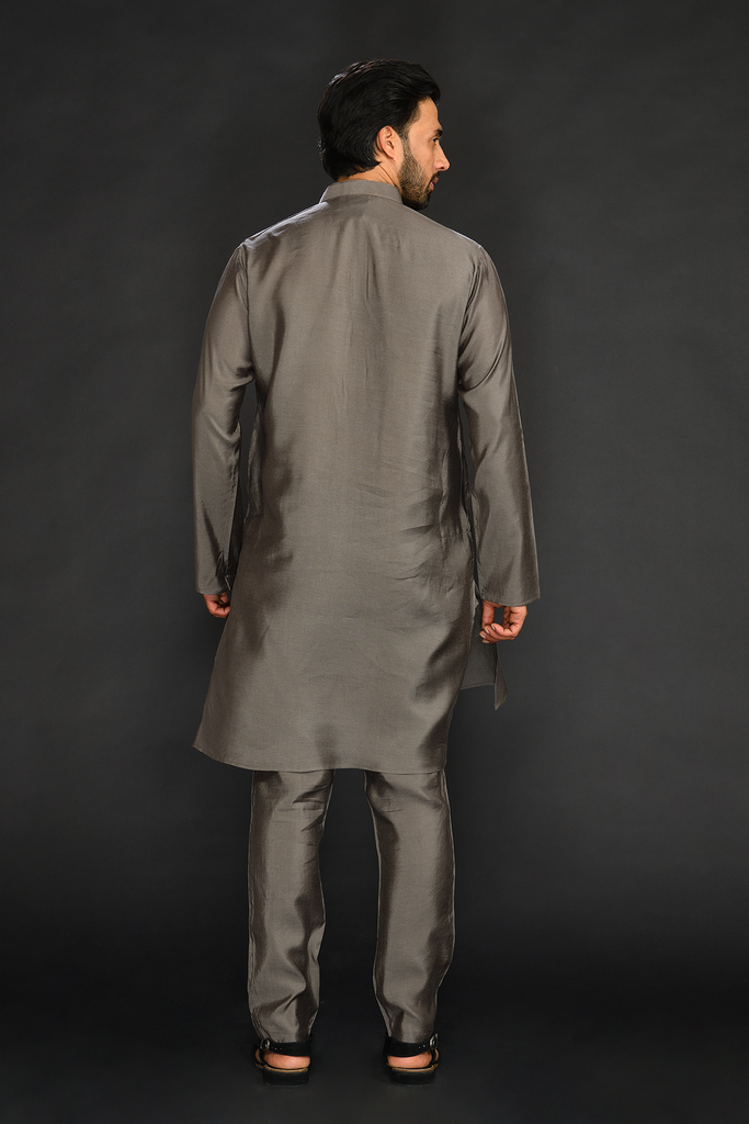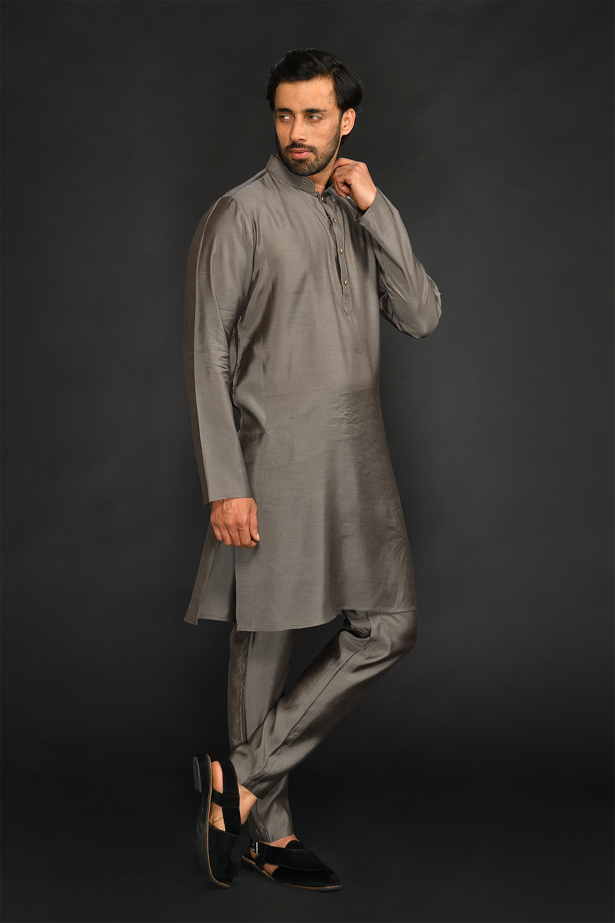 Silk Cotton Kurta with Slim Pant. Embroidery on collar and placket.