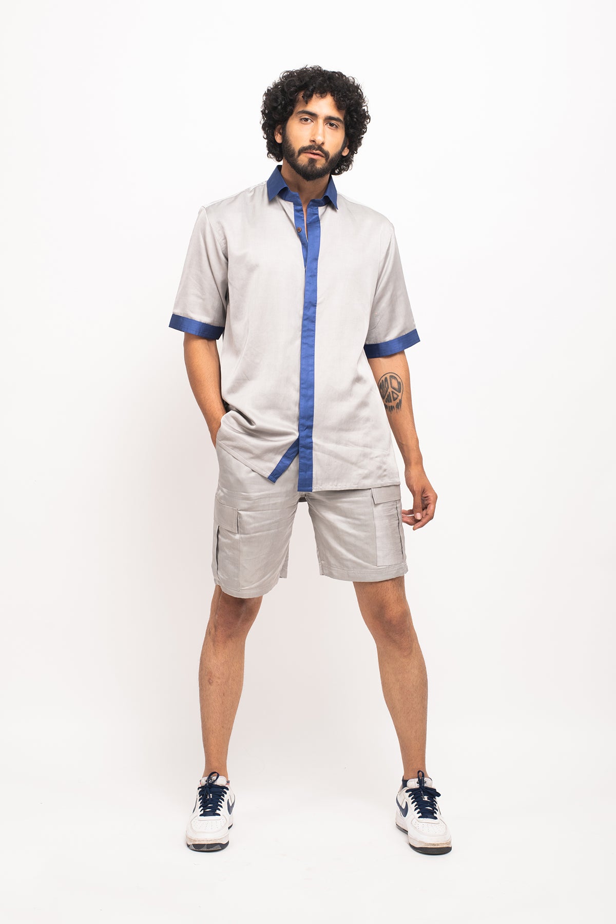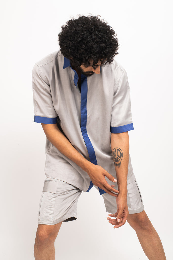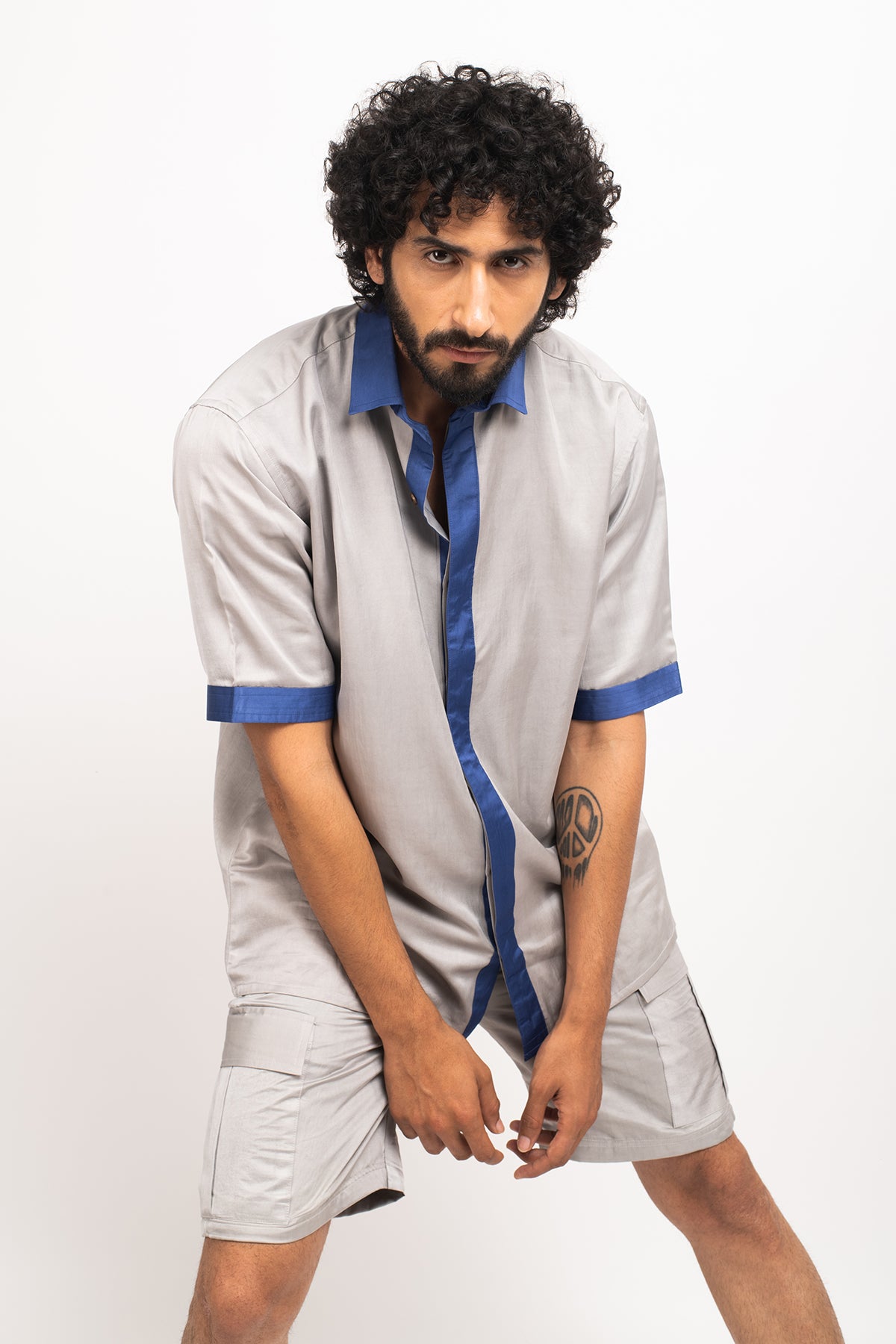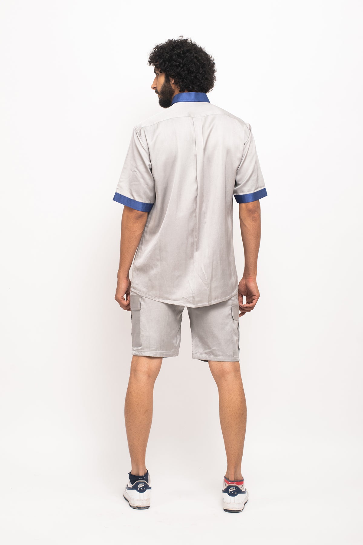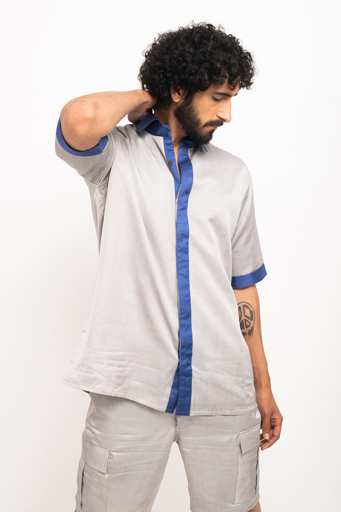 Grey shirt with Blue Collar and blue flap panelling in the front.Length of the Garments: 28