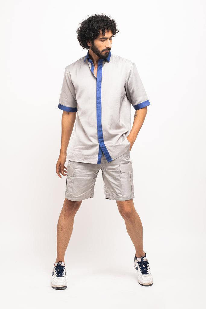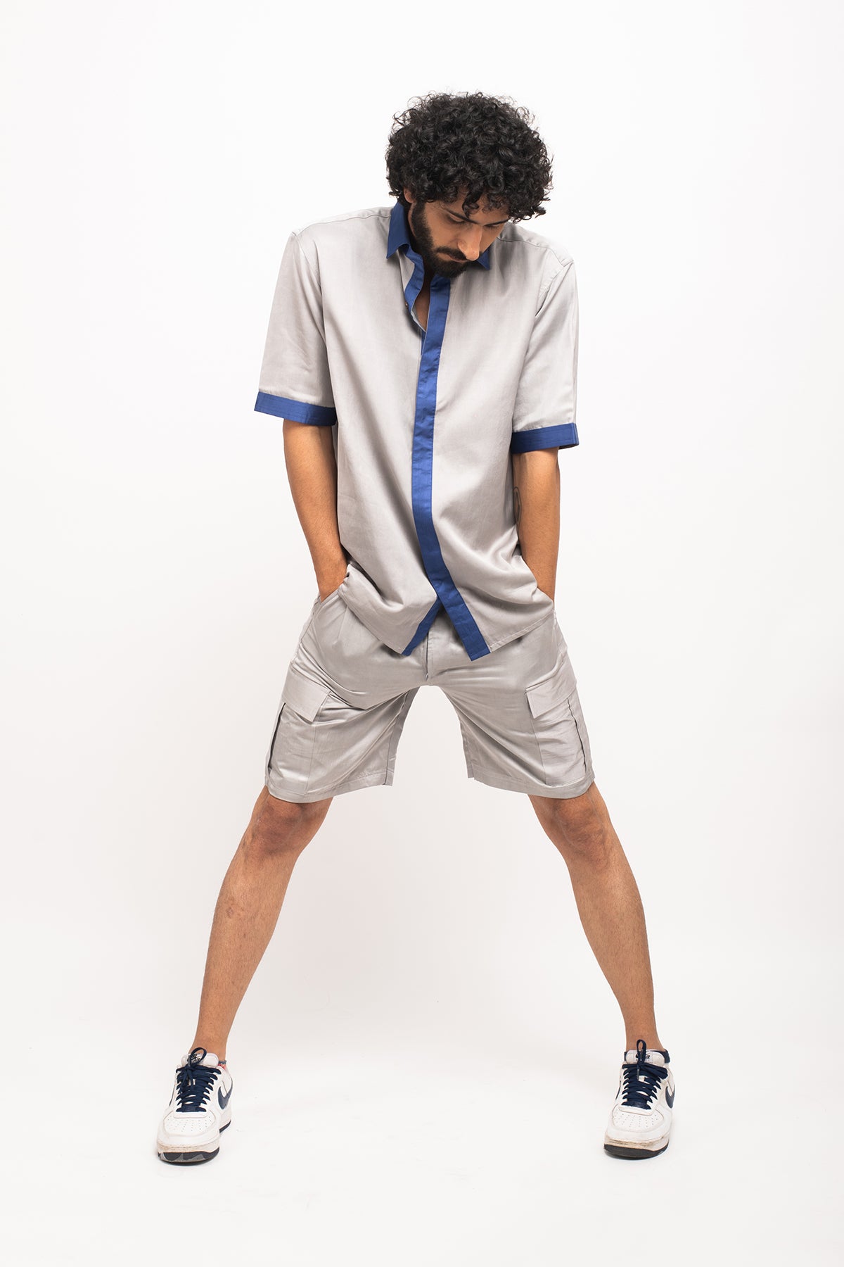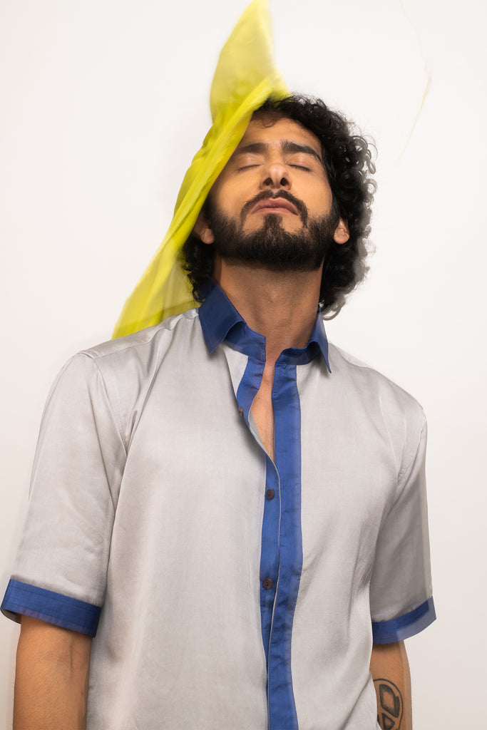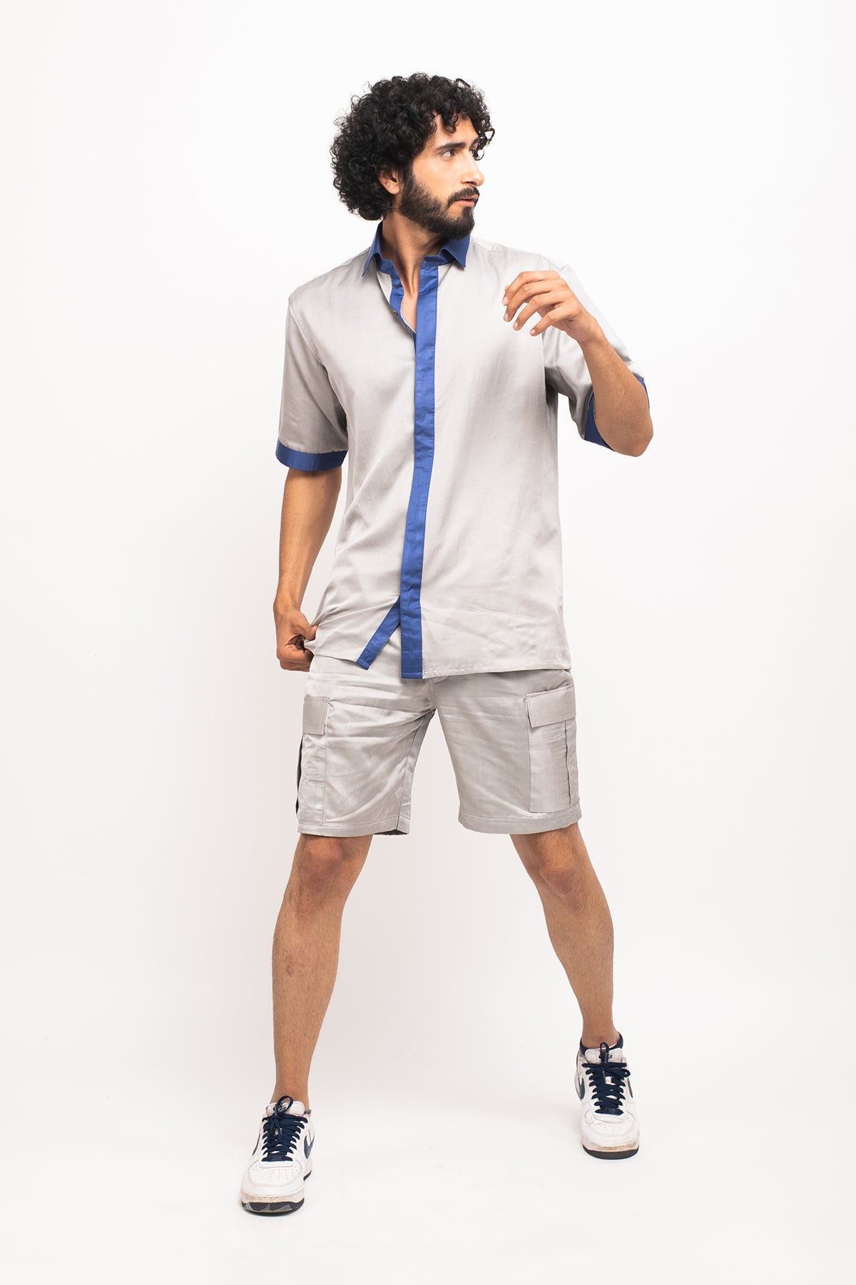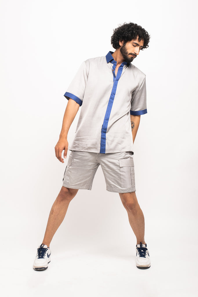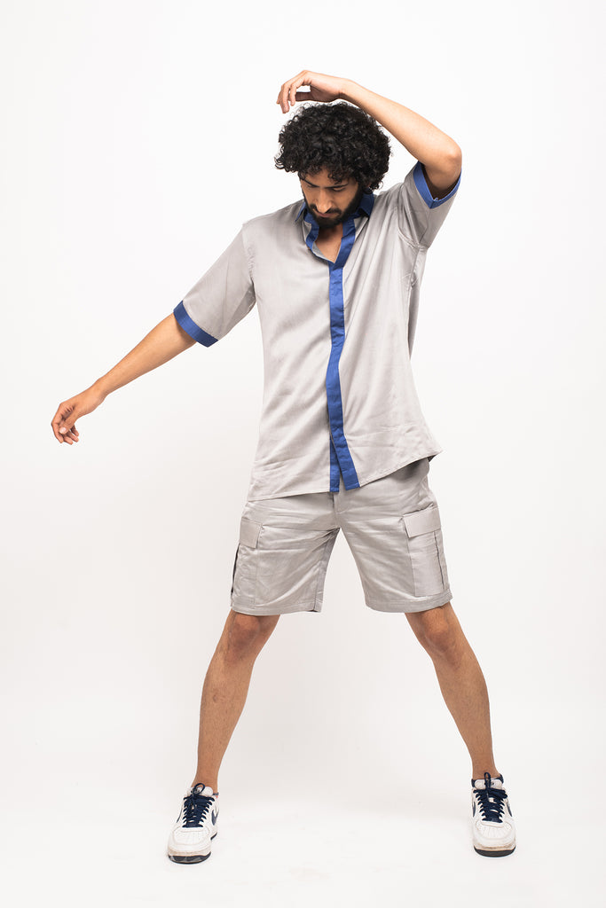 Grey shirt with Blue Collar and blue flap panelling in the front.Length of the Garments: 28