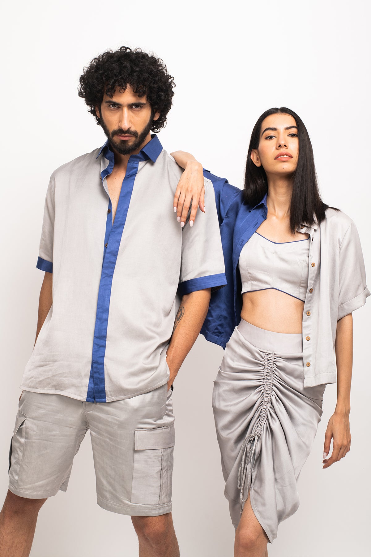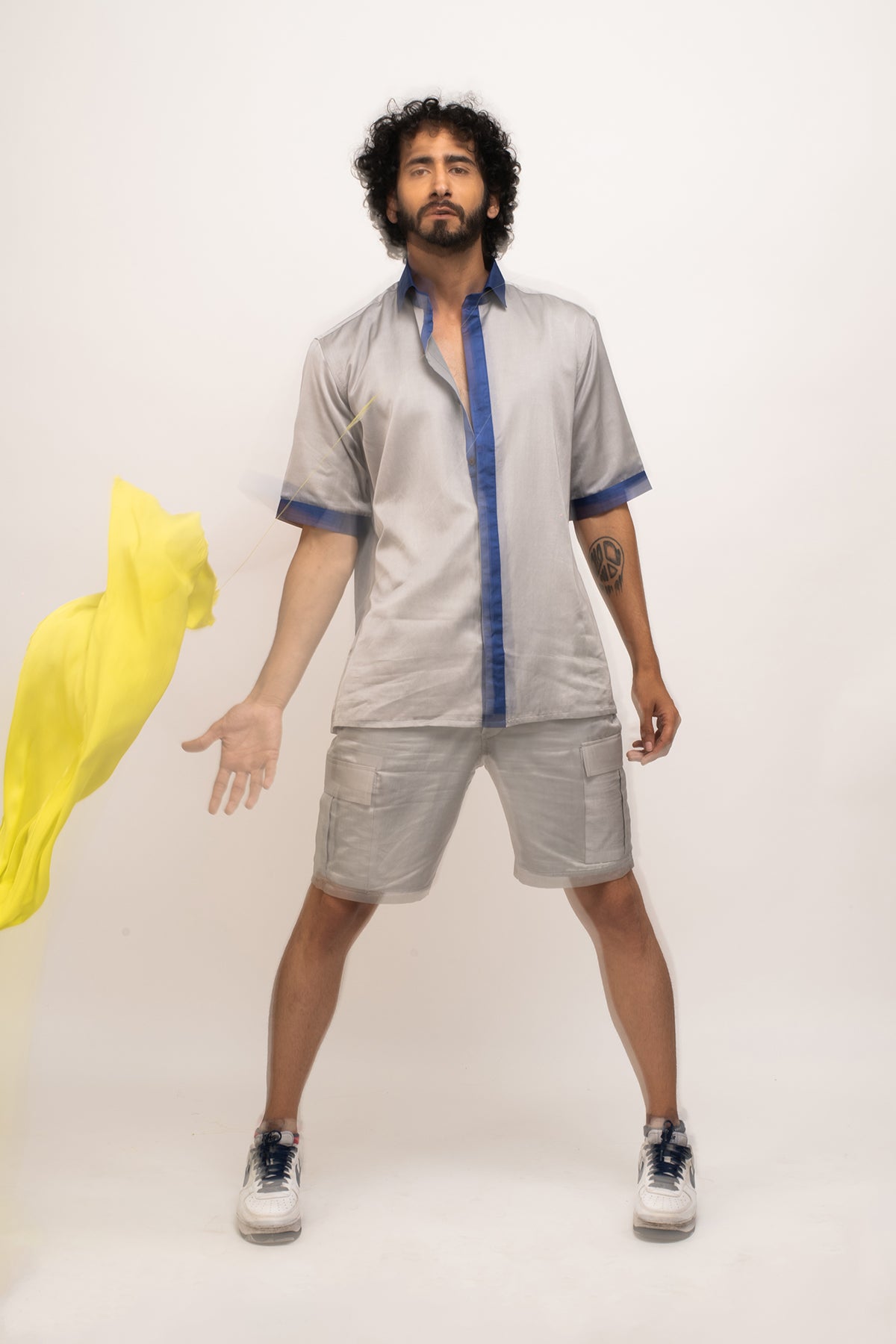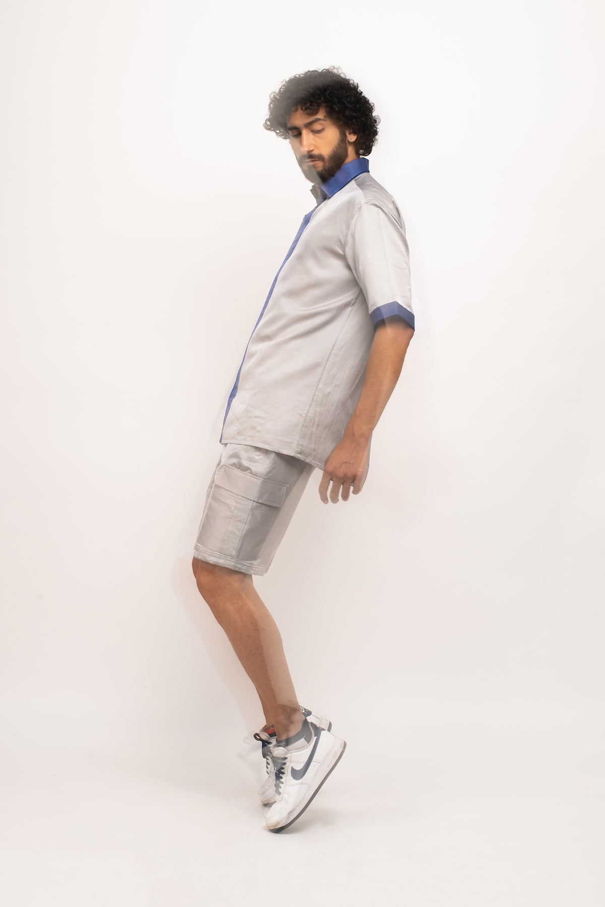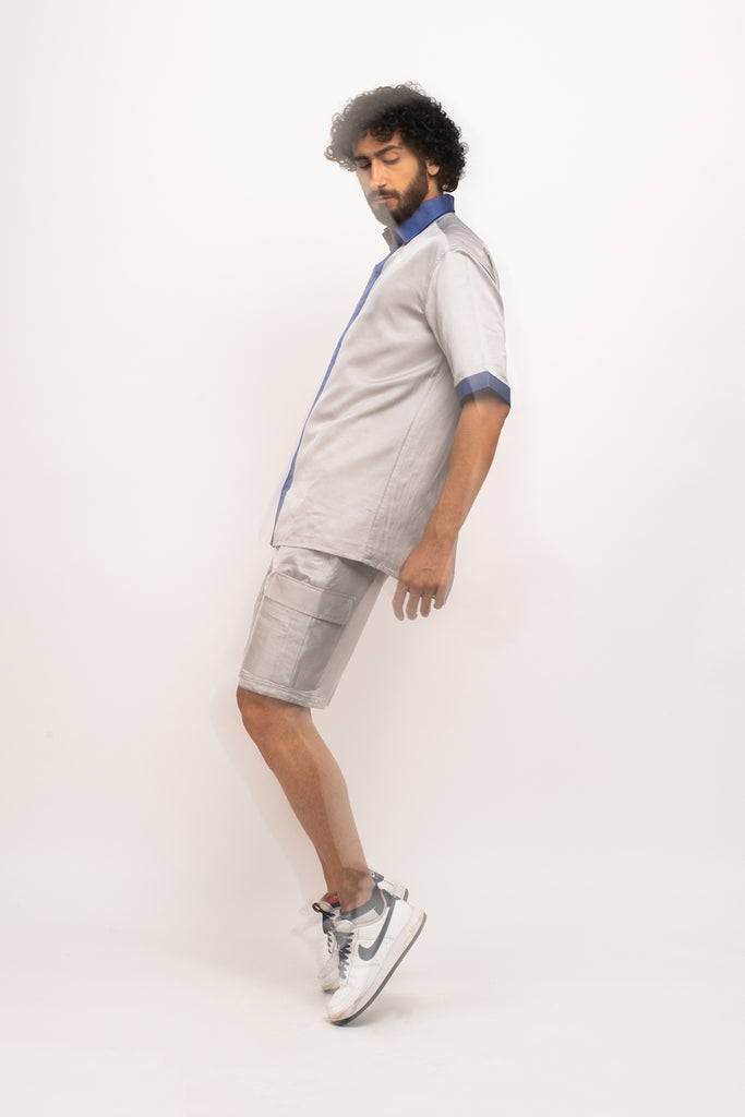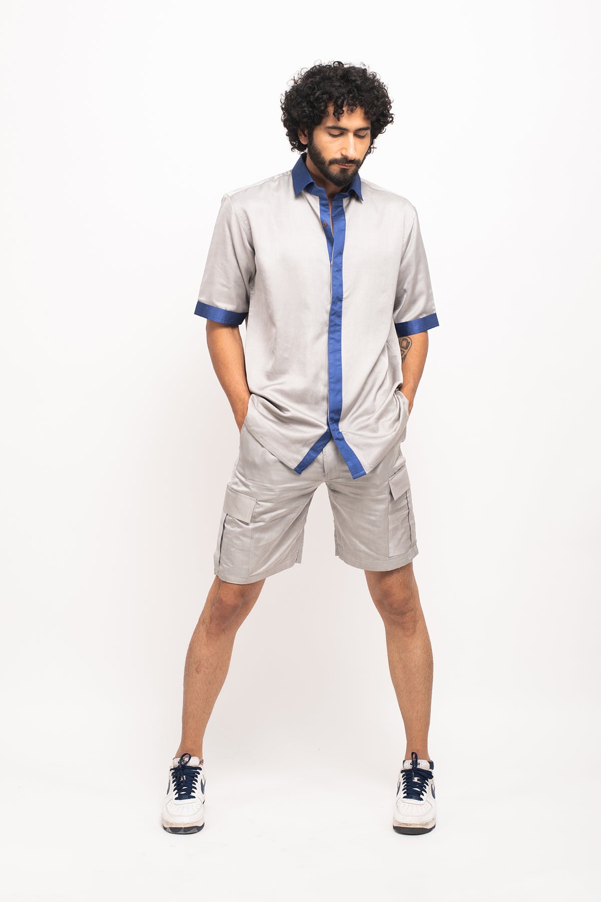 Grey shirt with Blue Collar and blue flap panelling in the front.Length of the Garments: 28