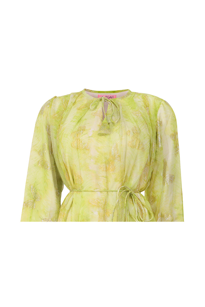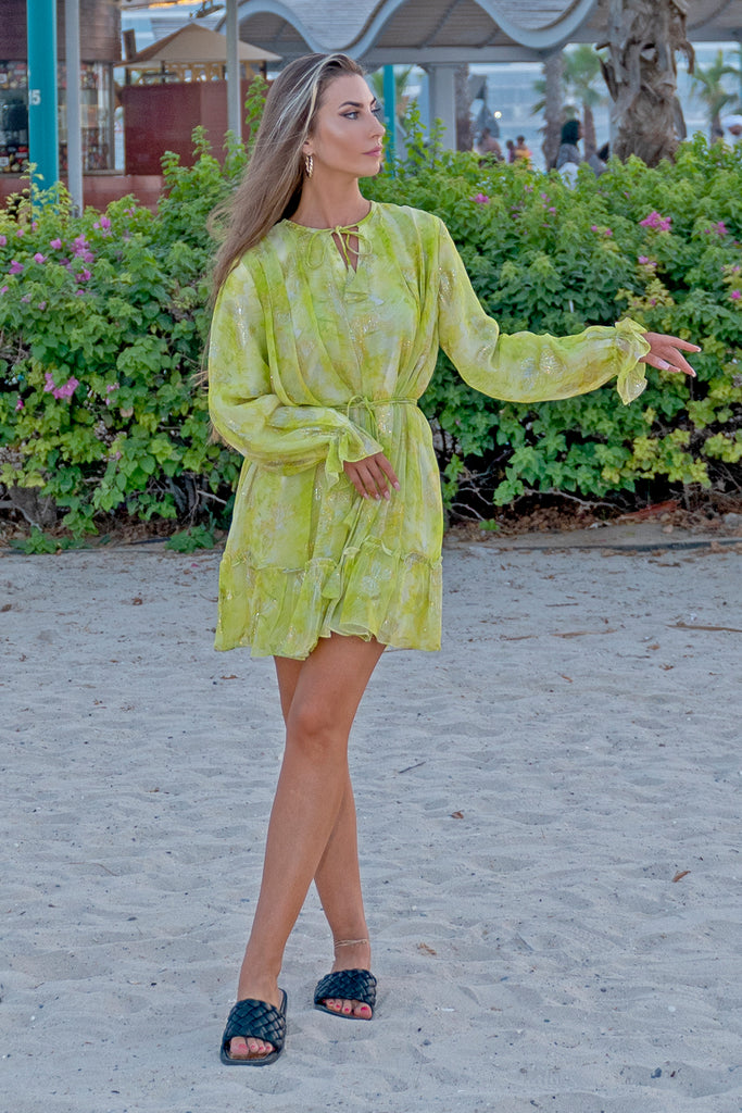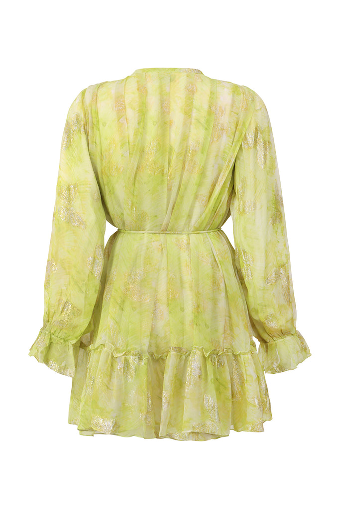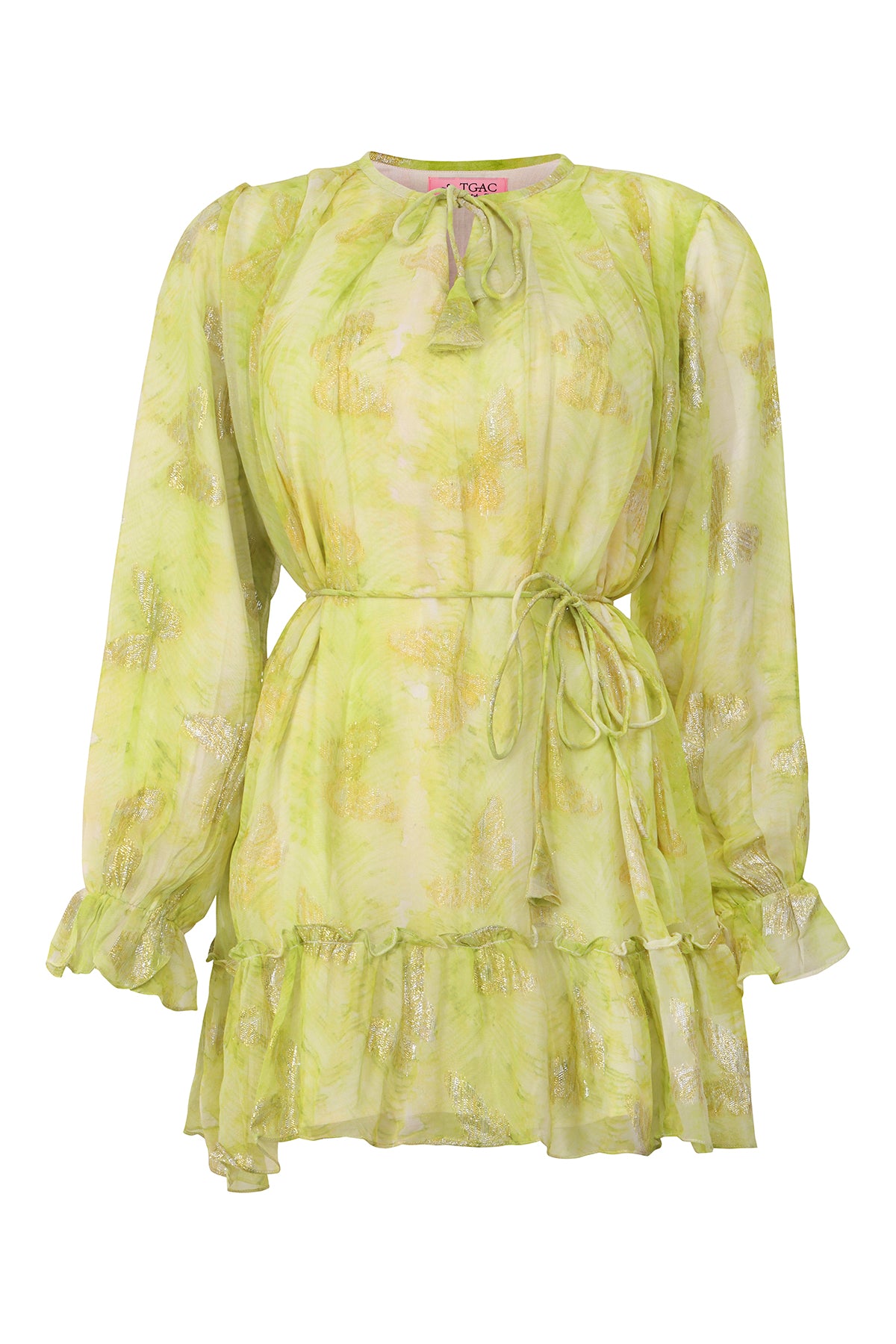 Crafted from Viscose Georgette with Butterfly Lurex, this luxury dress is made to fit any requirements of a vivacious woman that amuse her intense desires. Highlighting the neck with drawstring details, statement ruffled sleeves, and skirt that cascades into a flare and a relaxed mini silhouette.