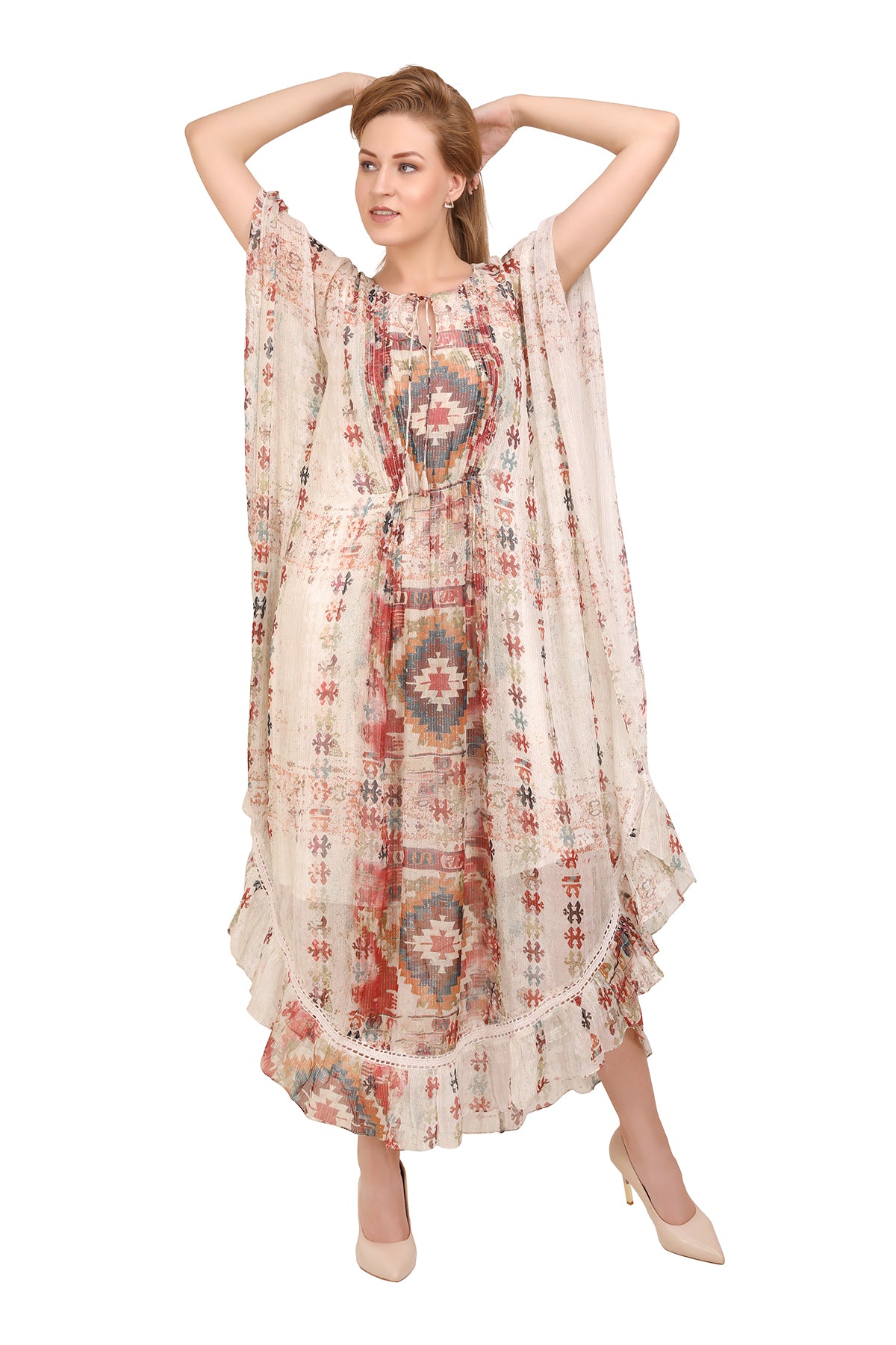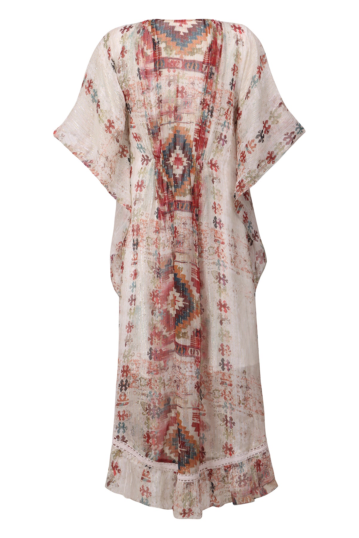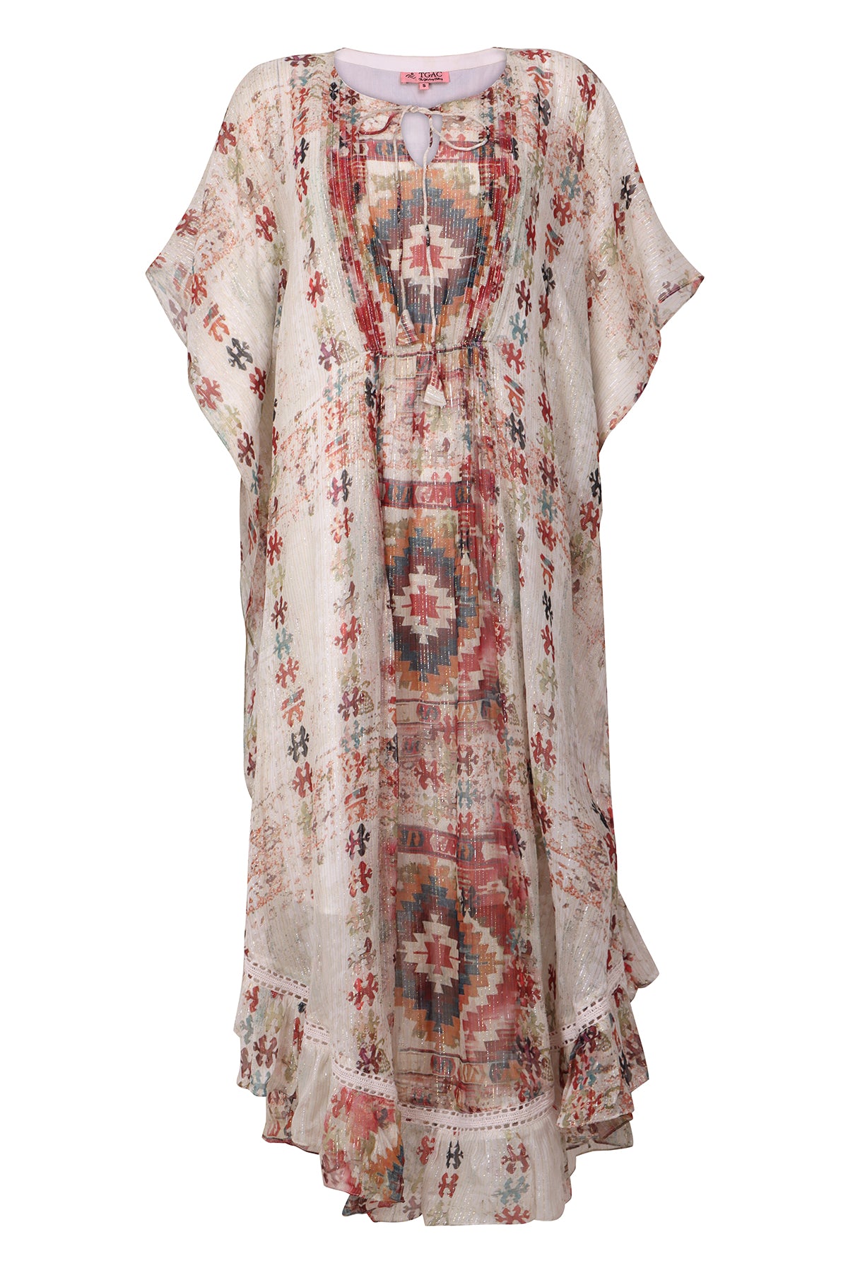 The breezy silhouette, which owes its origins to vintage antiquity, has remained timeless through the decades and is recreated for vacations and special occasions. This viscose georgette kaftan features a keyhole knotted neck, ruffled hem embellished with shimmer lurex and rug-inspired print that is effortlessly feminine with a touch of vintage charm.