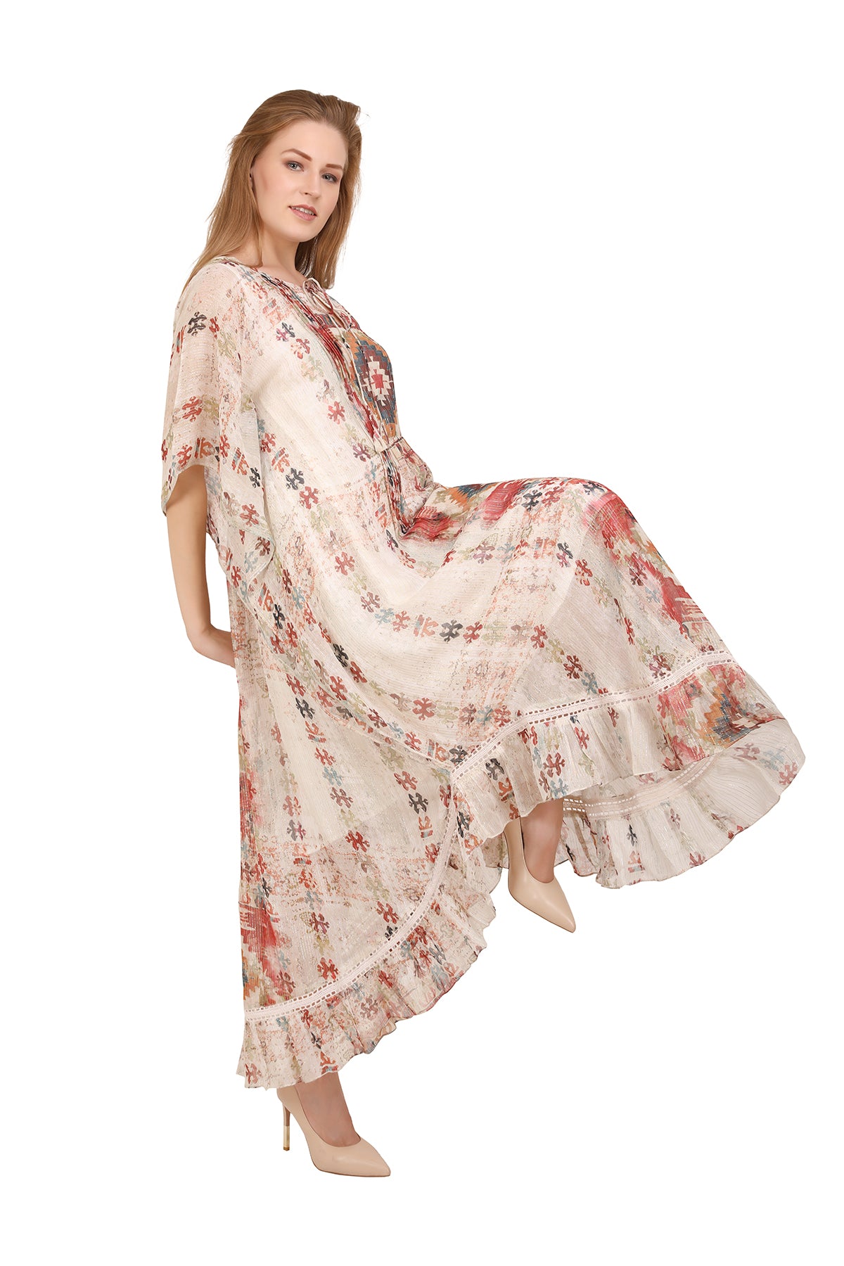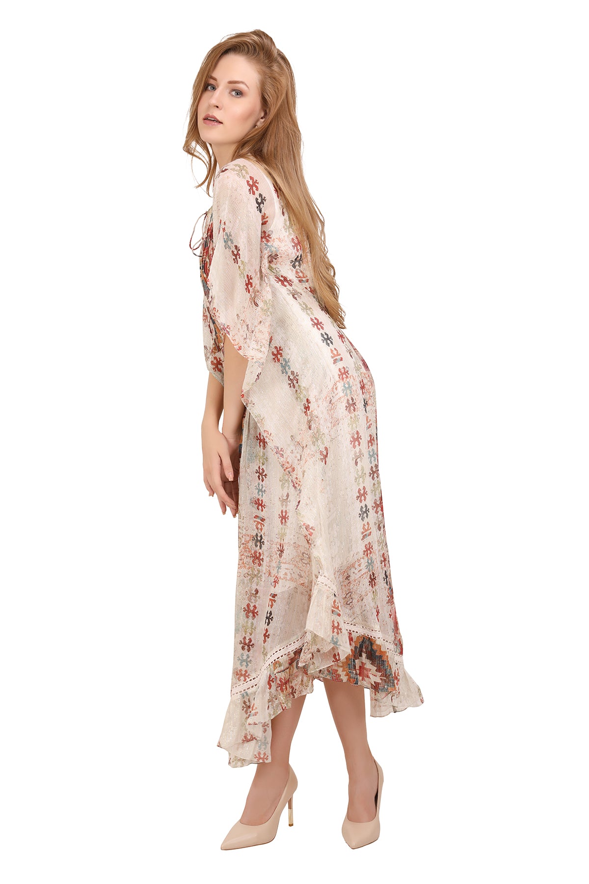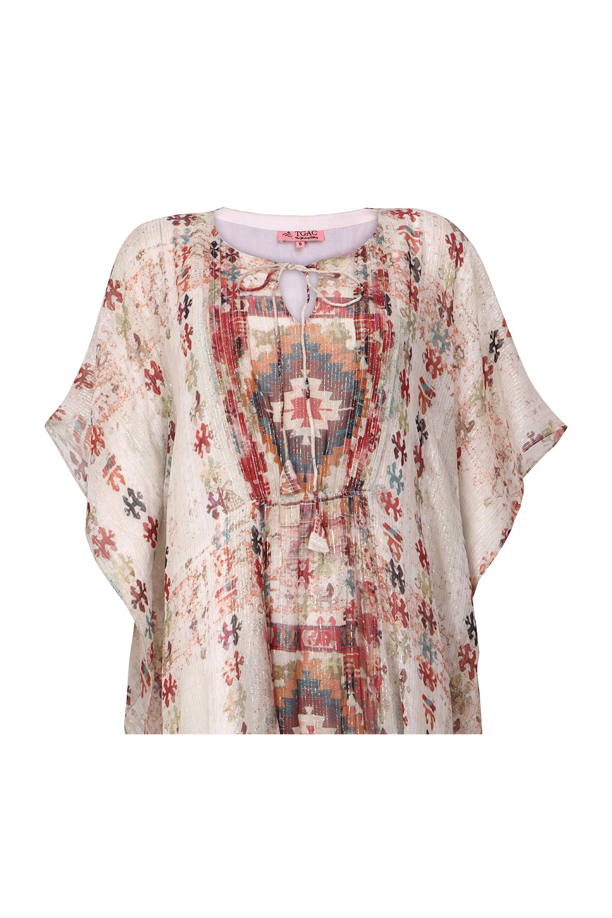 The breezy silhouette, which owes its origins to vintage antiquity, has remained timeless through the decades and is recreated for vacations and special occasions. This viscose georgette kaftan features a keyhole knotted neck, ruffled hem embellished with shimmer lurex and rug-inspired print that is effortlessly feminine with a touch of vintage charm.