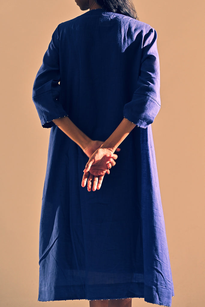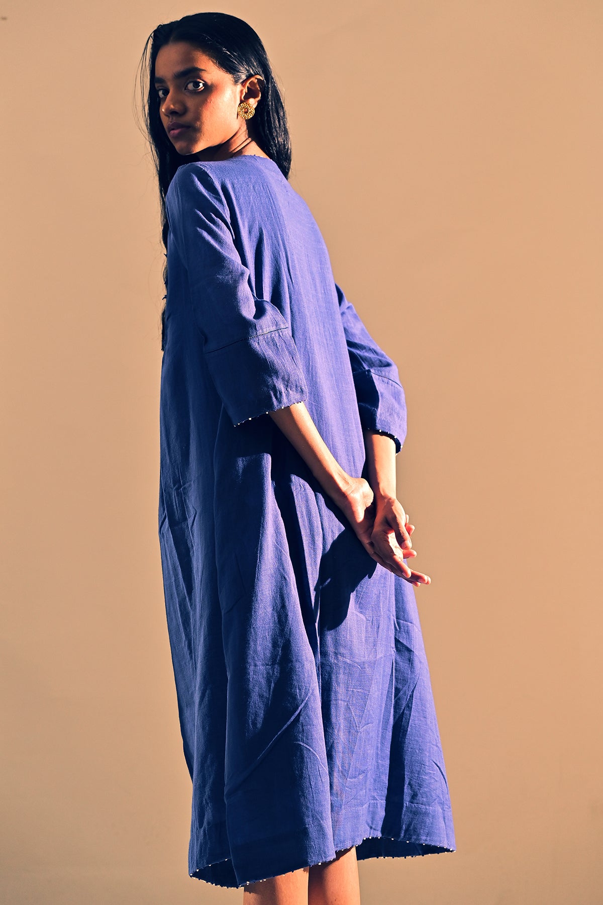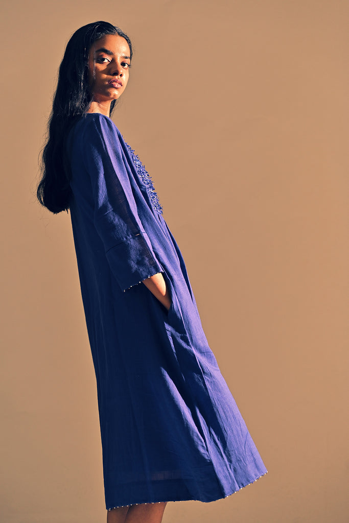 A-line gathered tunic with beautiful organza flowers tucked all over the yoke.