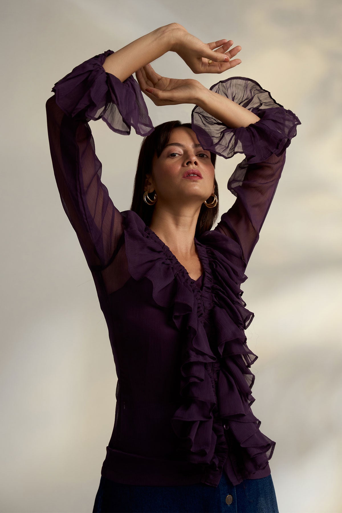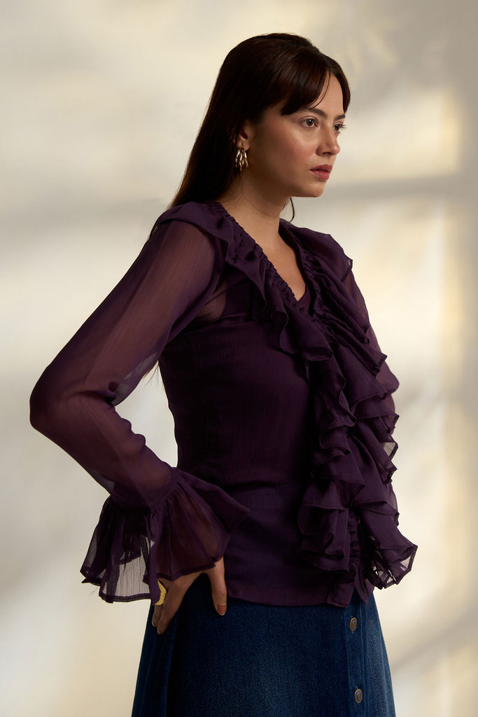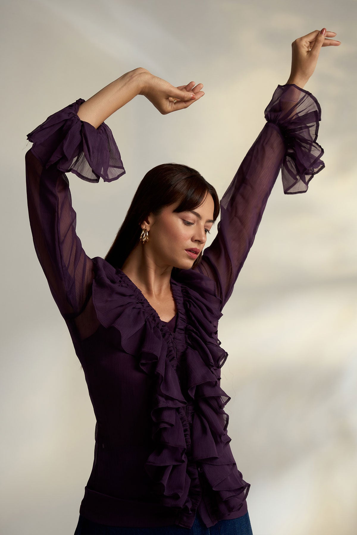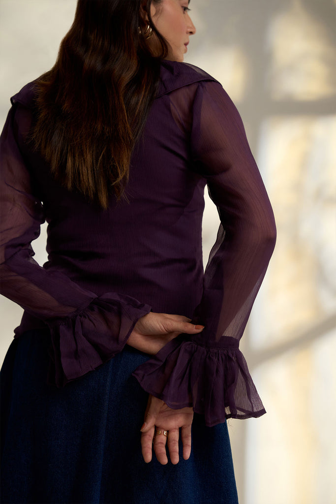 The shirt in a georgette blend has a deep v-neck with a flounce that crosses under the bust. The unique elasticated sleeves add much-needed flair. It comes with a slip. Available in plus size also.
