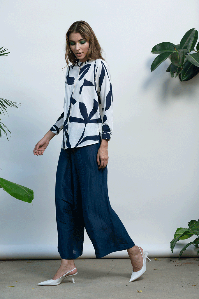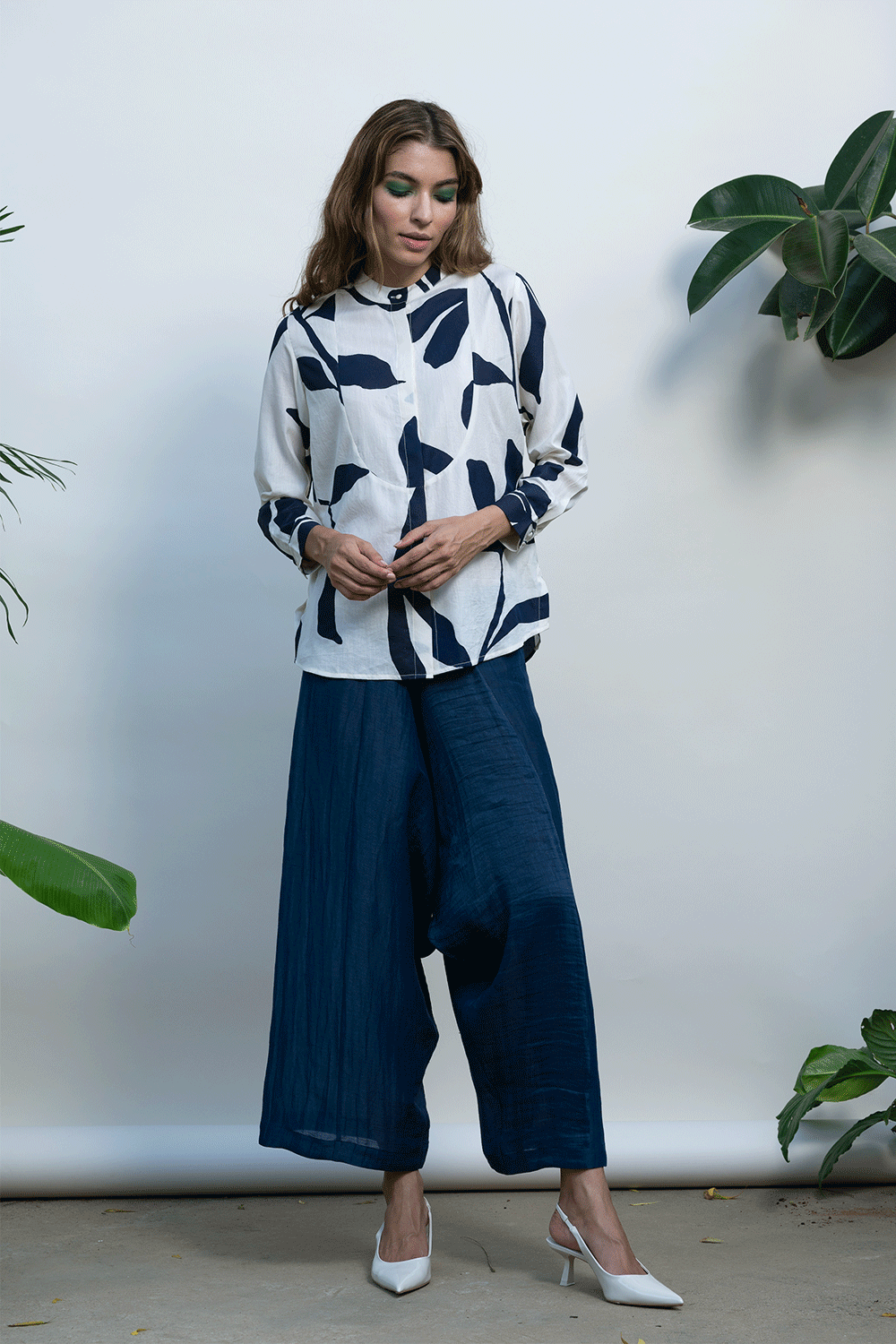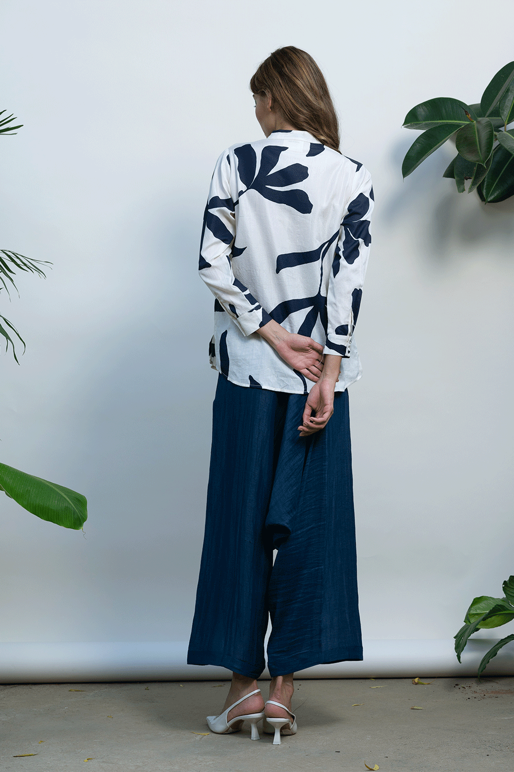 Printed top with the neck yoke and side slit. Easy to wear with a mandarin collar and front opeing. Has a hidden button placket. Due to the nature of the print, the placement of the print will vary in every piece.