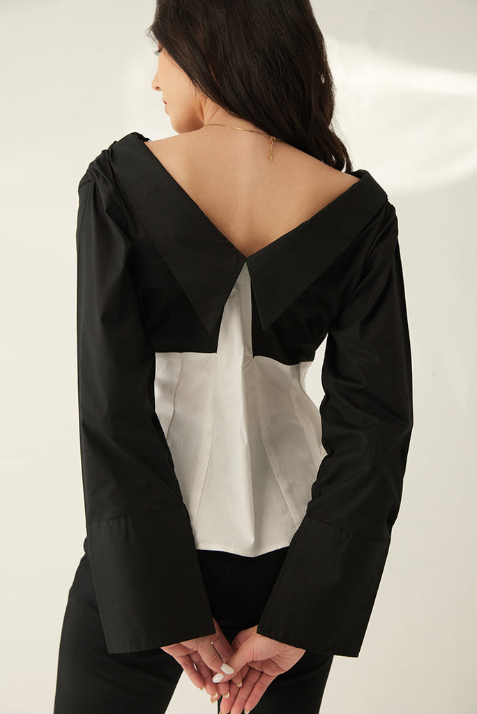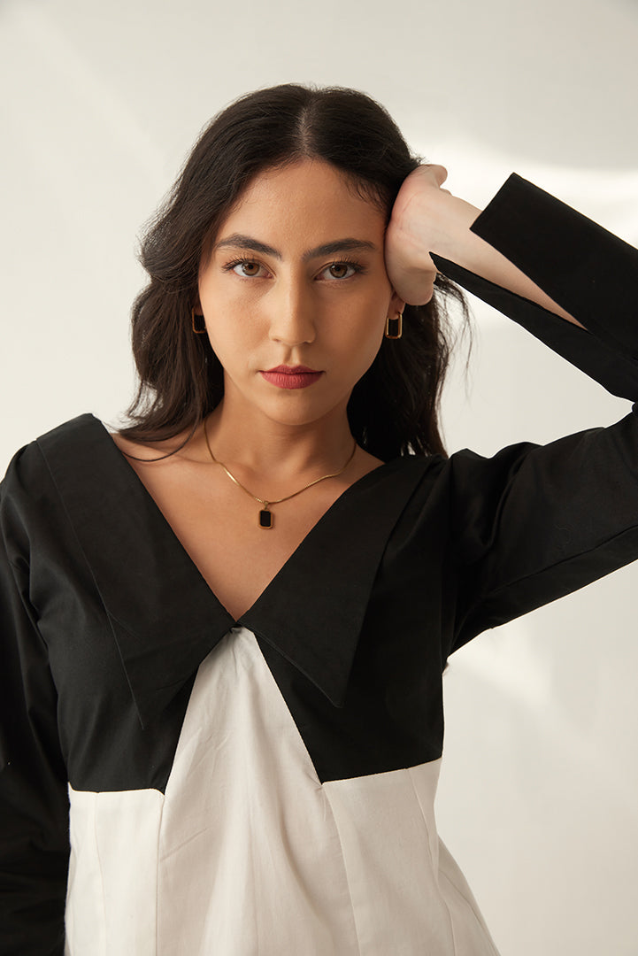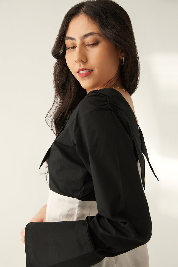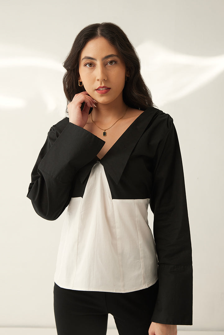 Structured black shirt with contrasting body. The broad cuff sleeves and collar gives a versatile edge to the garment. Pleat detailing on the shoulder gives a graceful look. Available in plus size also. Perfect for workwear or casual outings.