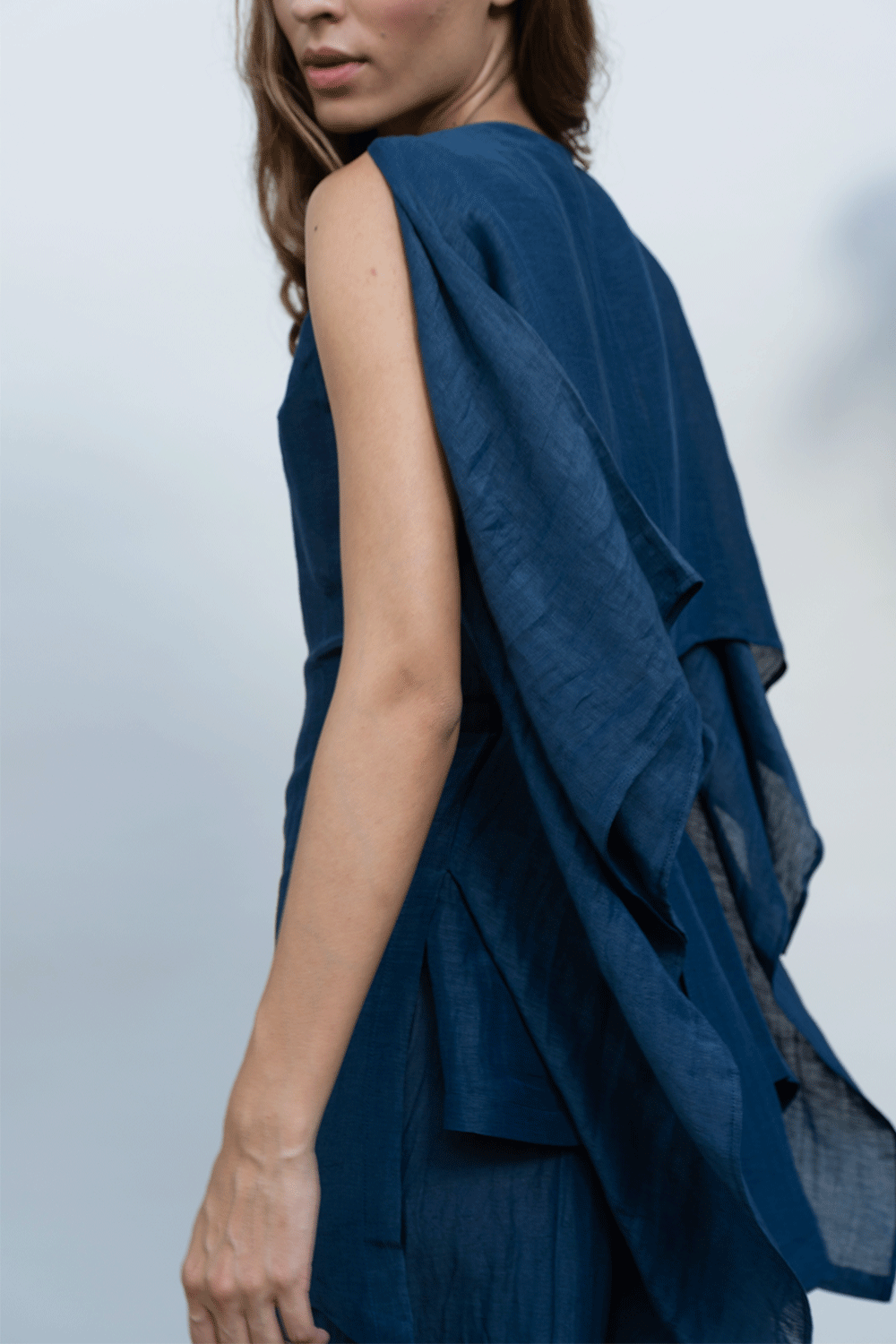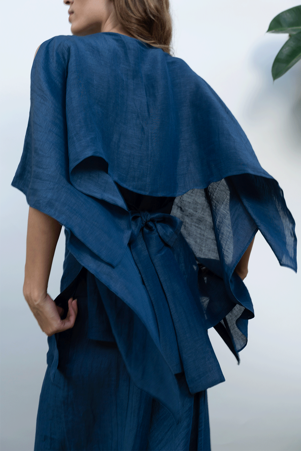 Solid top with asymmetrical front and drape detail at the back with belt at the waist that helps to cinch the waist. Easy to wear with button opeing and round neck.