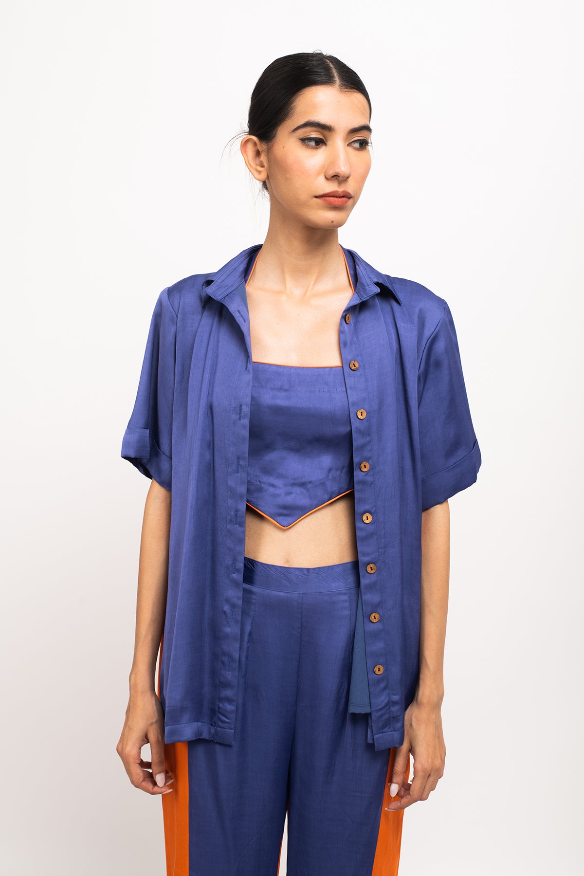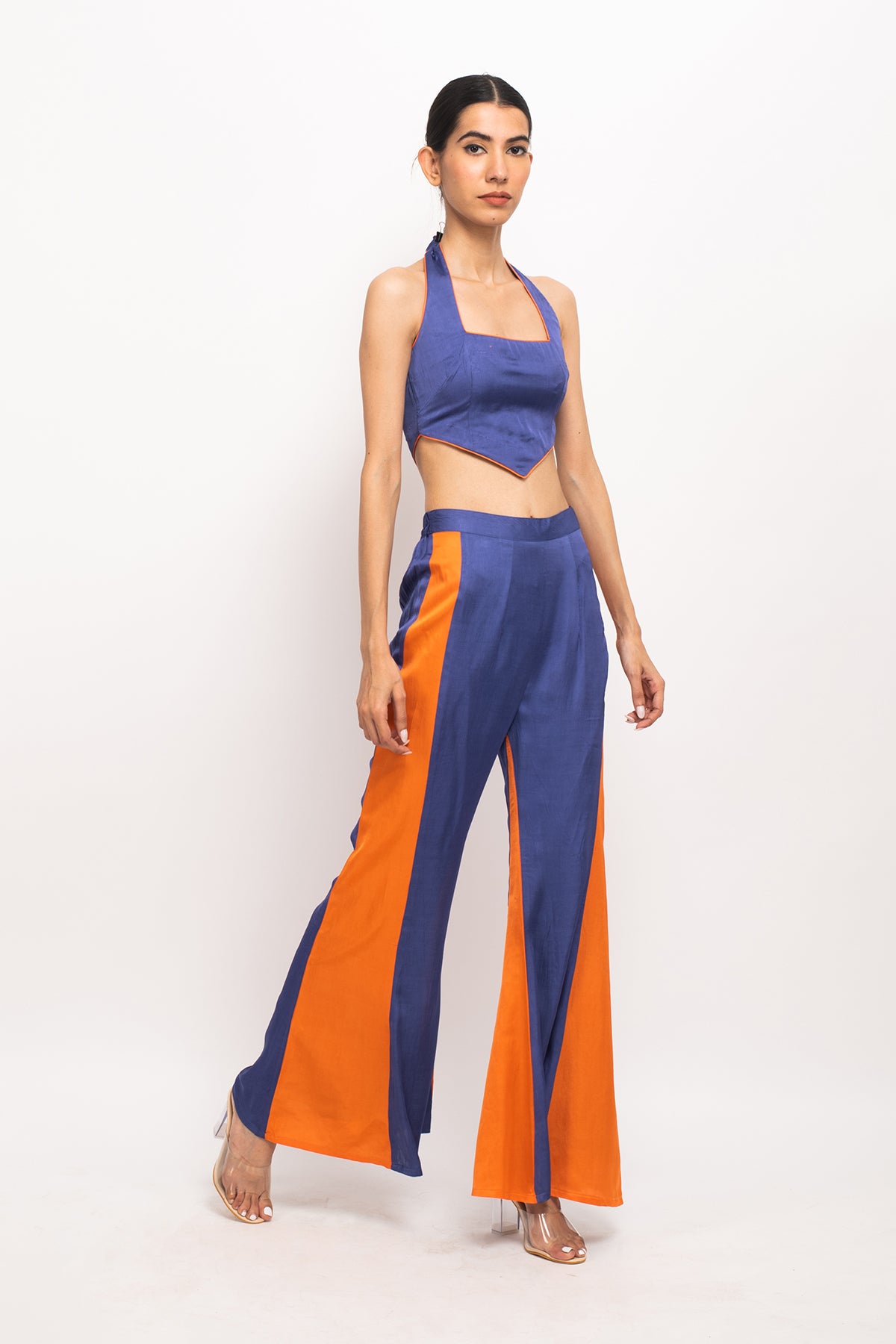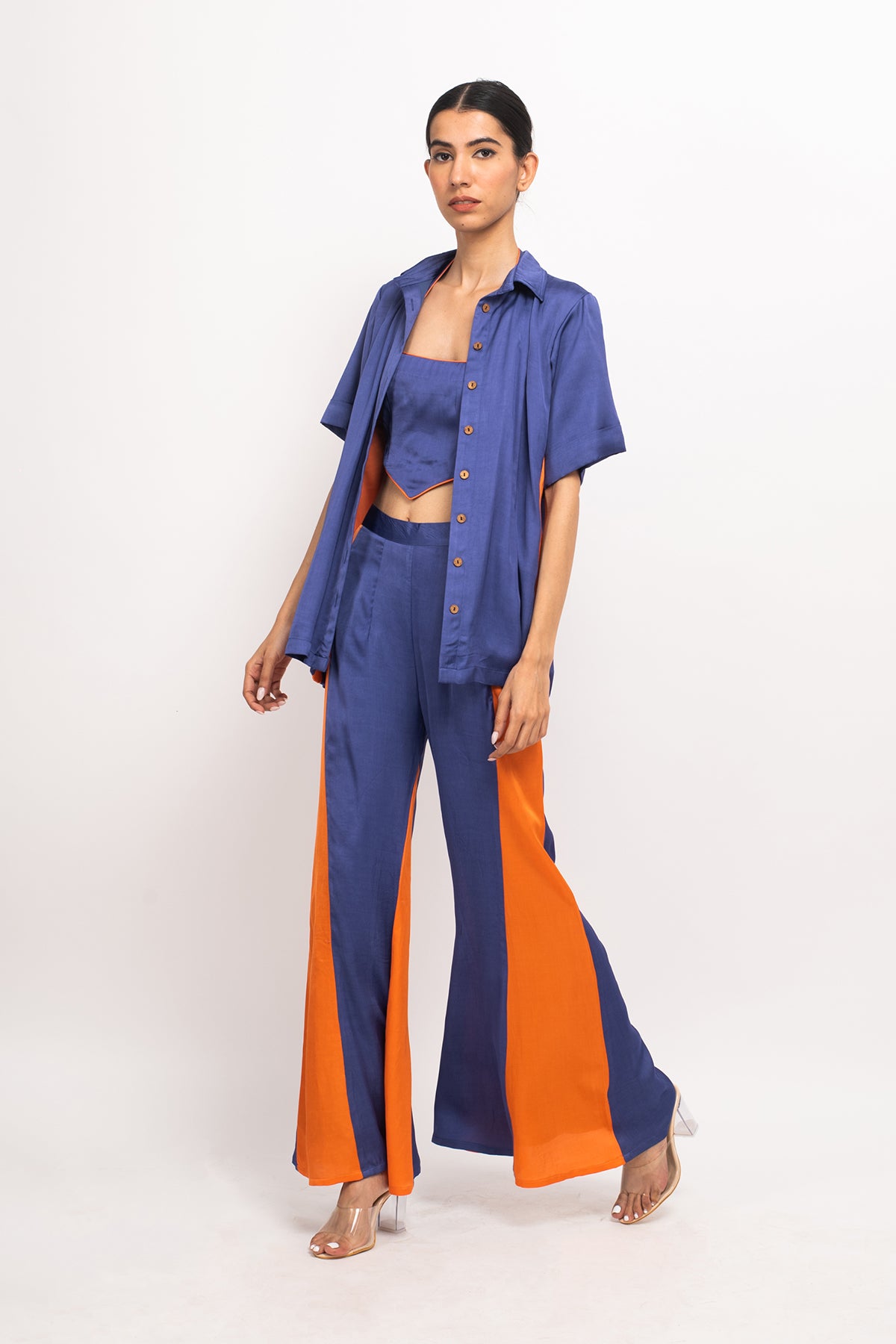 Orange-Blue three piece co-ord set; orange halter neck bustier paired with an orange-blue panelled shirt and orange-blue panelled flared pants.