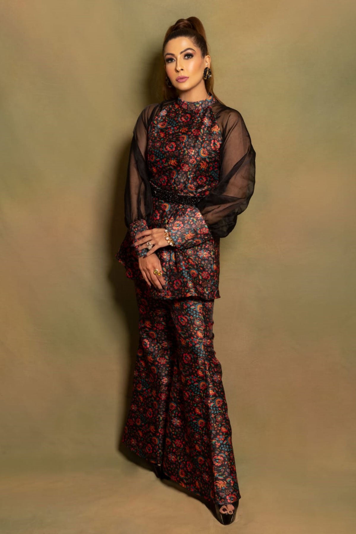 Hand embellished belt with organza sleeves top & bell bottoms set.