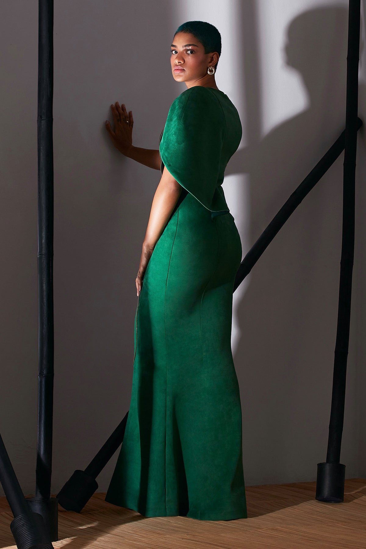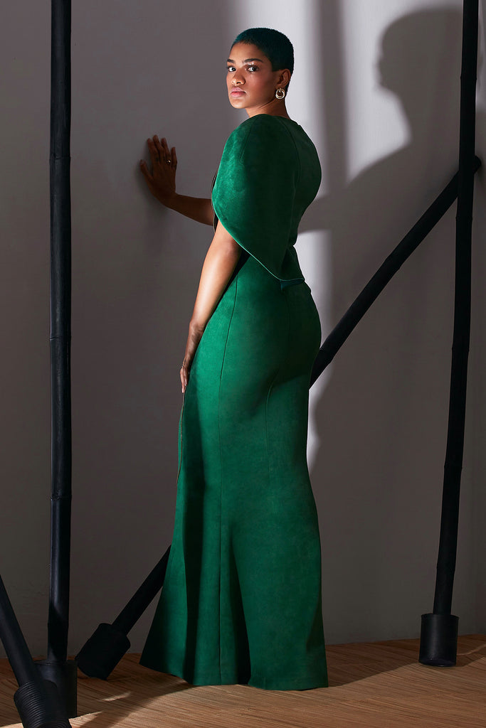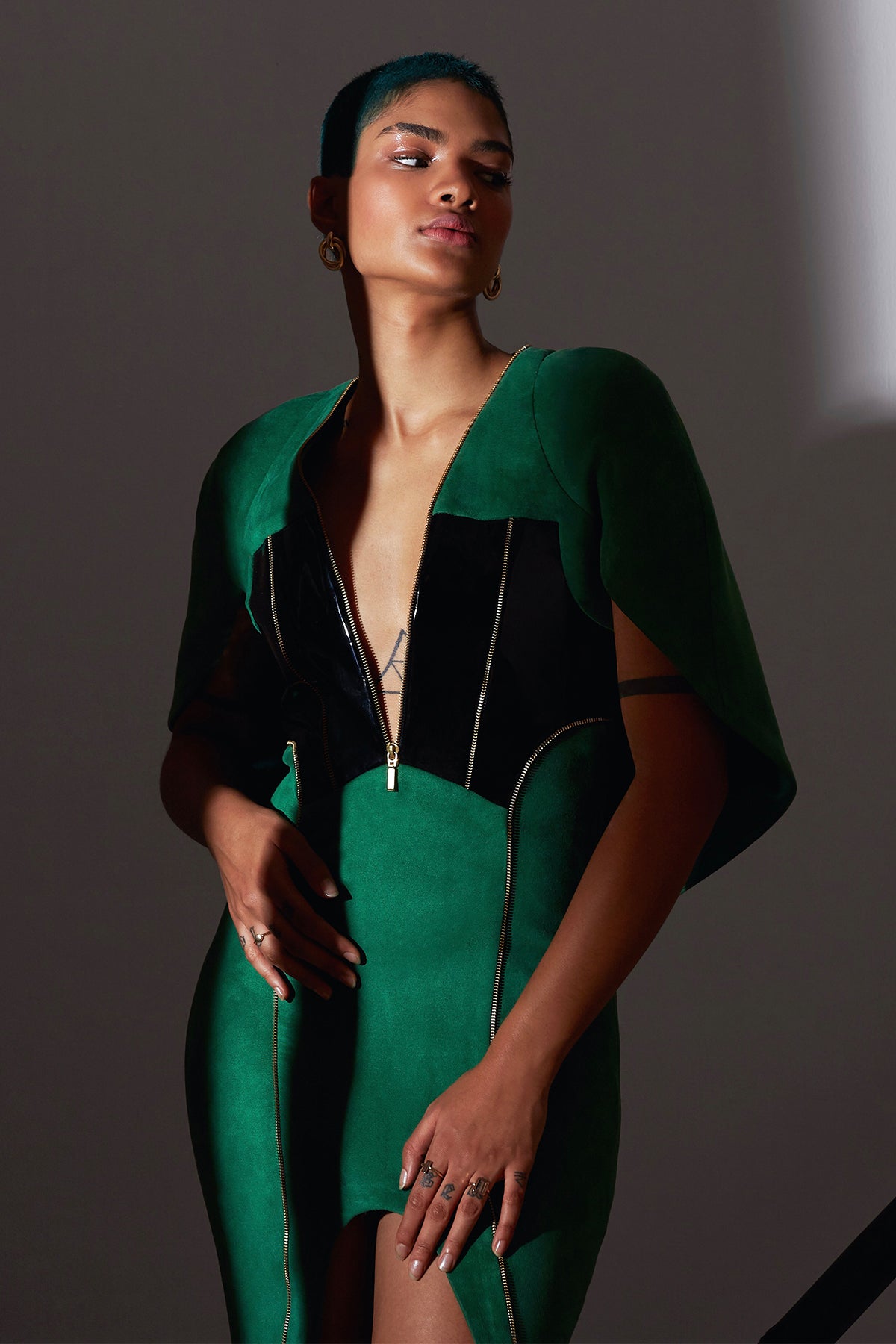 A cape sleeve gown in stretch neoprene-suede, with faux-leather harness detail intertwined with signature gold hardware.