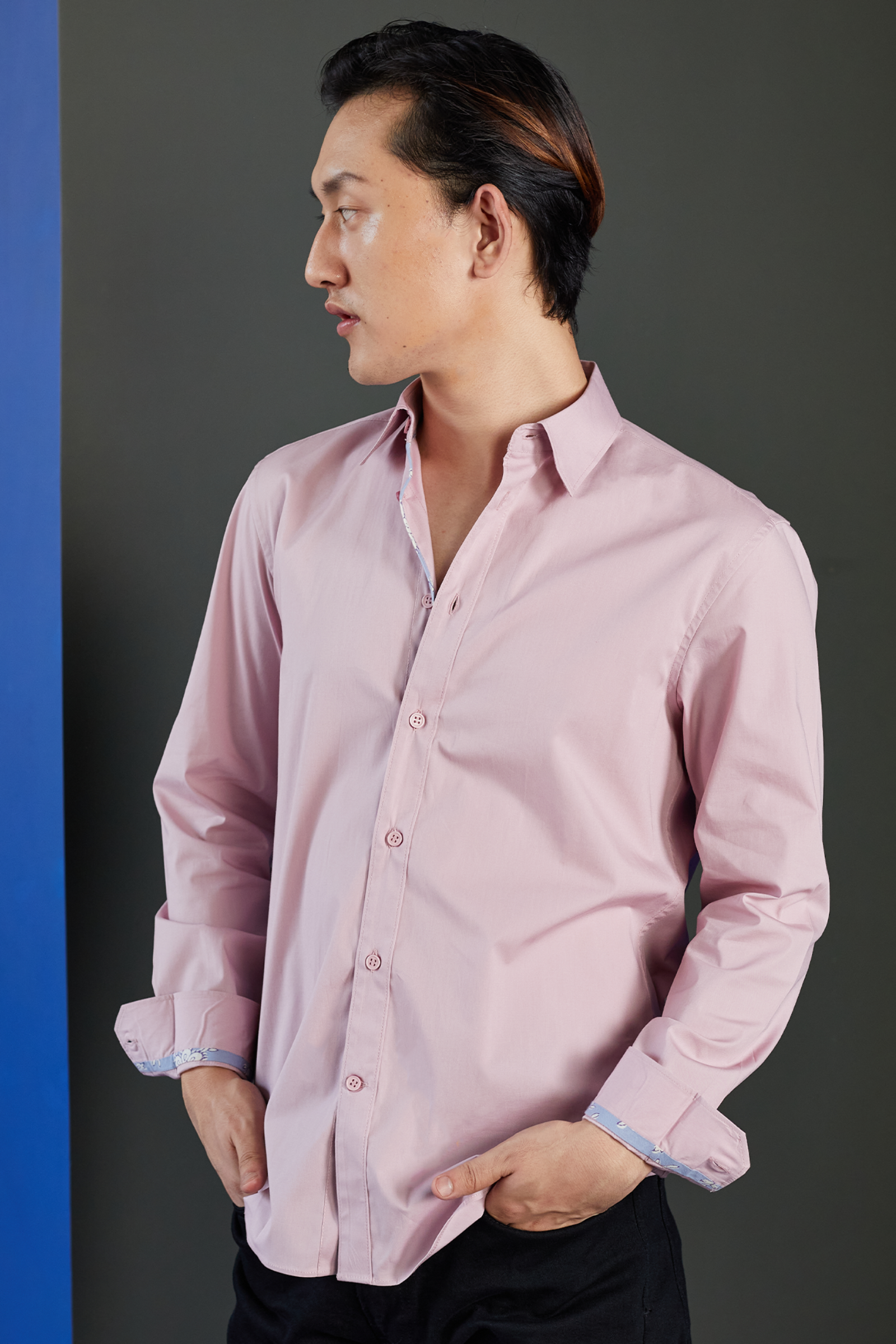 Long sleeves pink shirt with a drop down collar. Styled with a piping along the cuff, collar and placket.