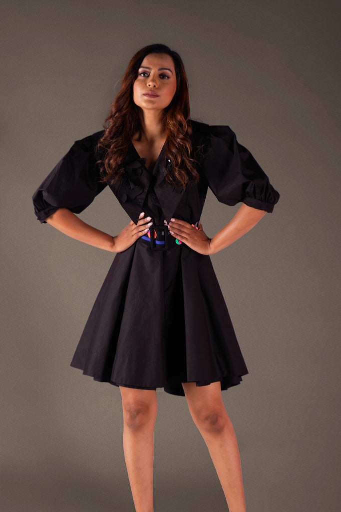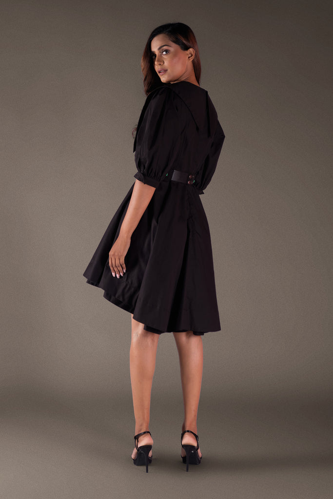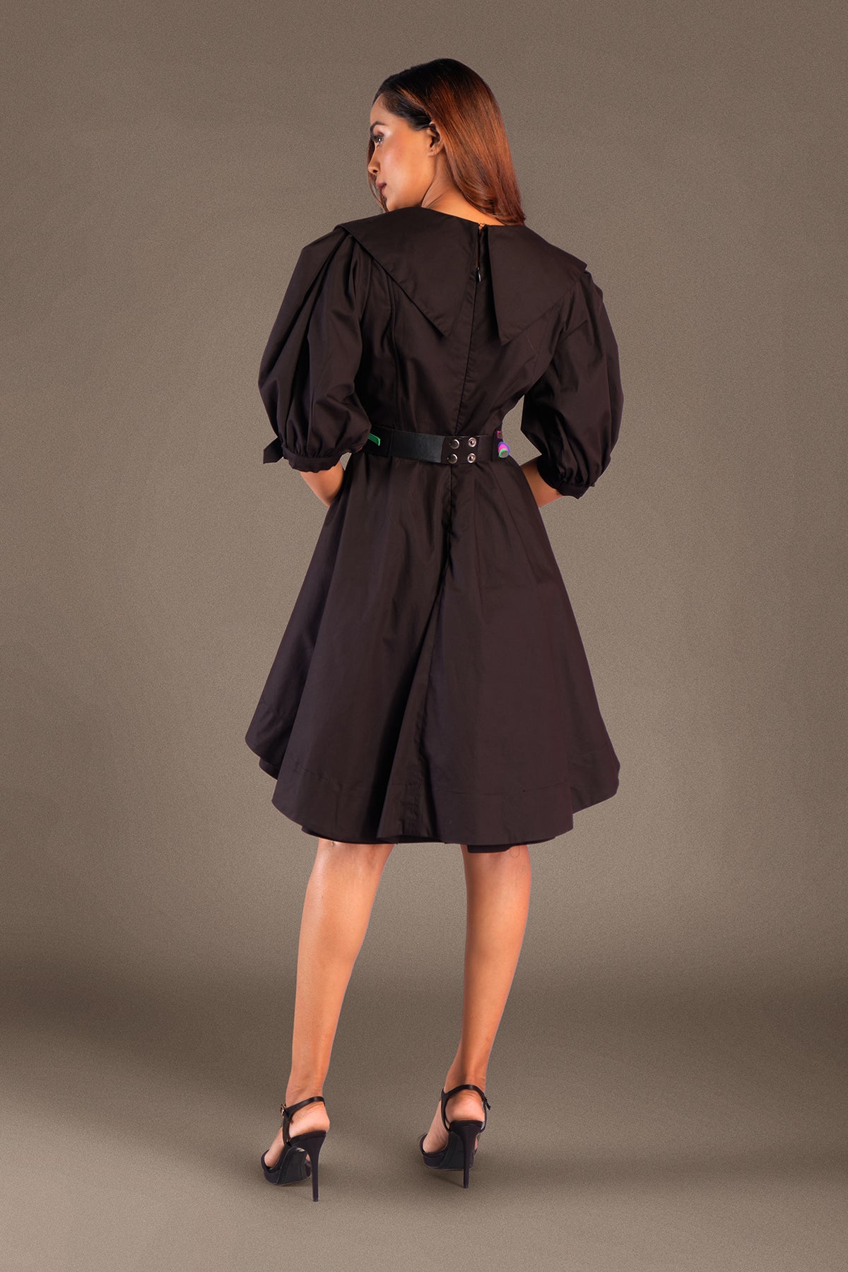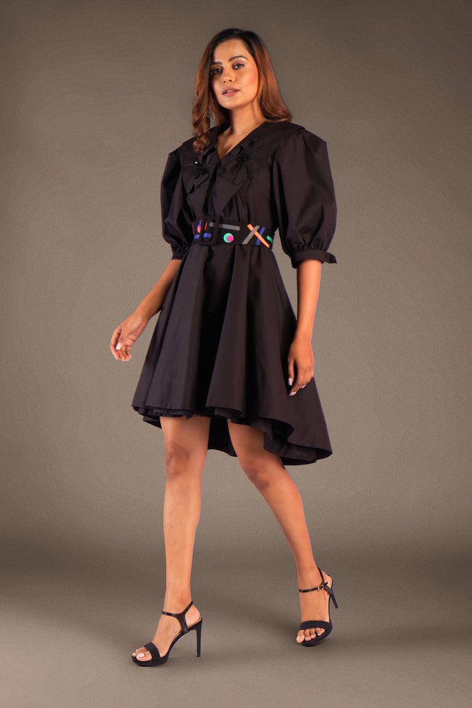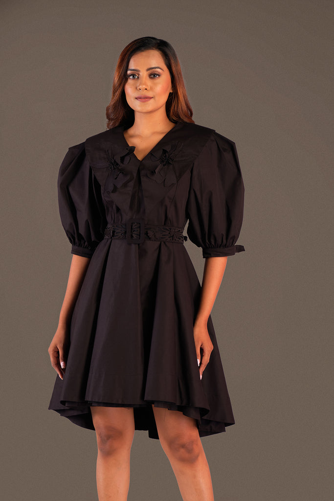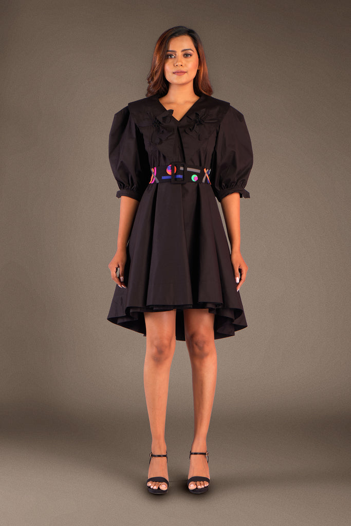 A-line hi-low cotton dress with attached flower embroidered collar comes with belt .