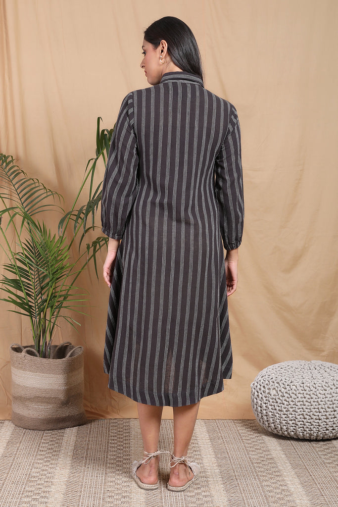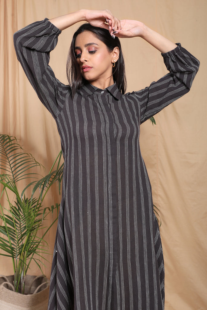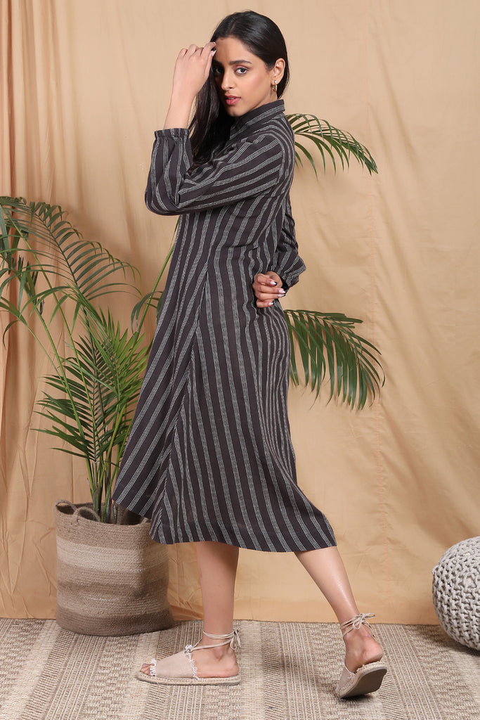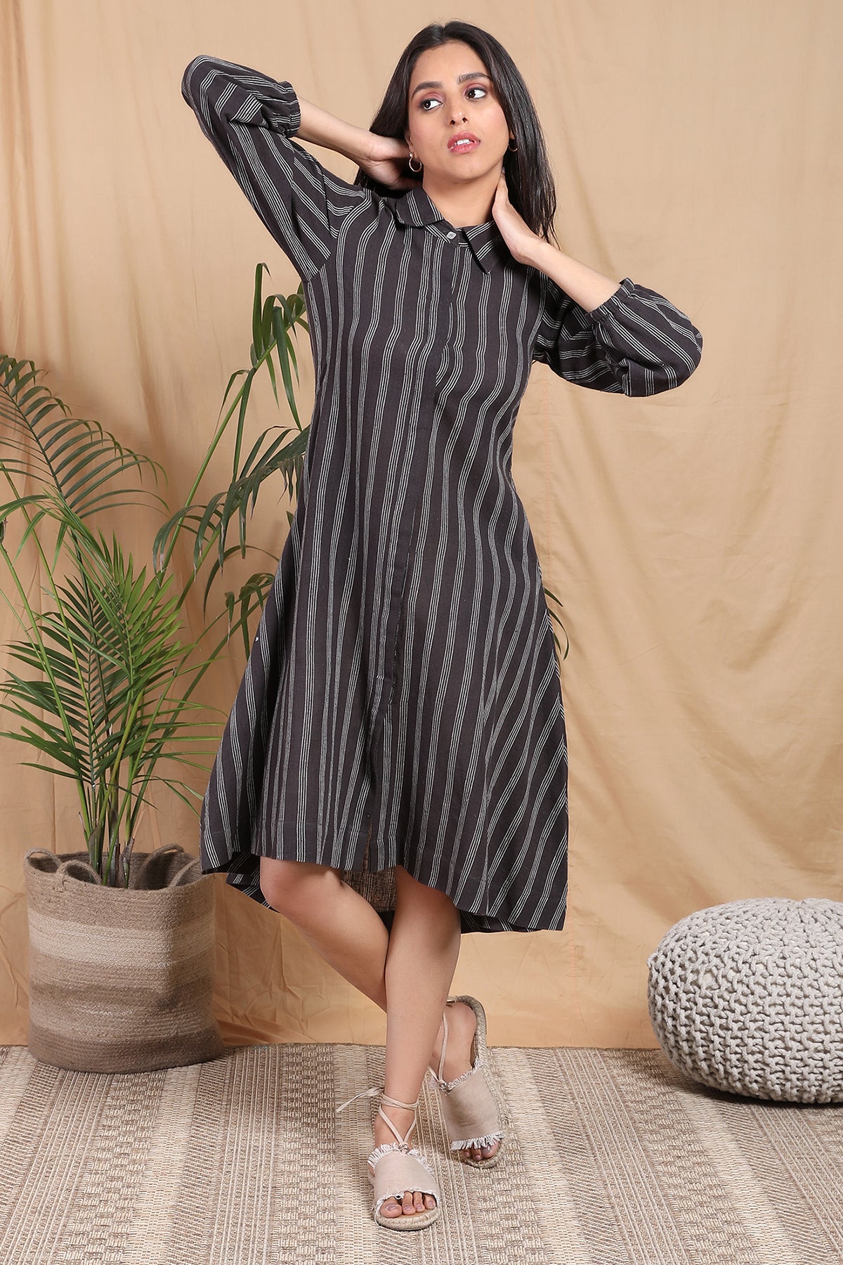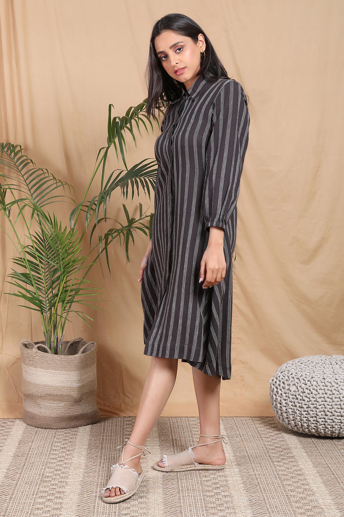 Midi dress with front conealed placket. Made from Kala Cotton fabric from Gujarat. The dress is super comfortable, easy and breezy.