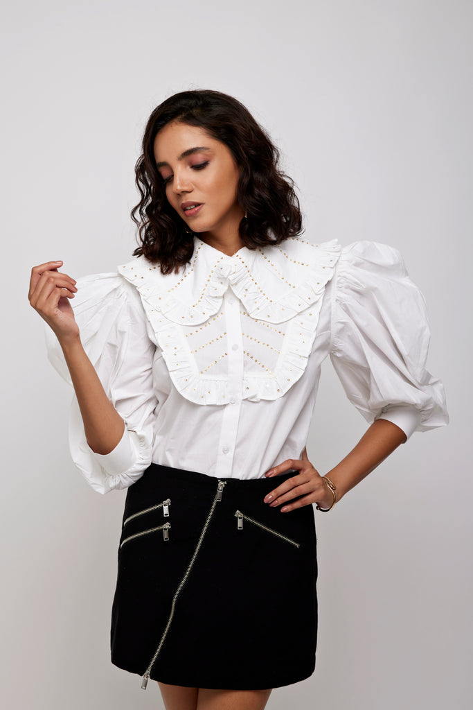 Bib with cape collar finished with ruffles to cynosure. Golden sequins and glass beads on the bib and oversized flap, golden sequins on the ruffles.