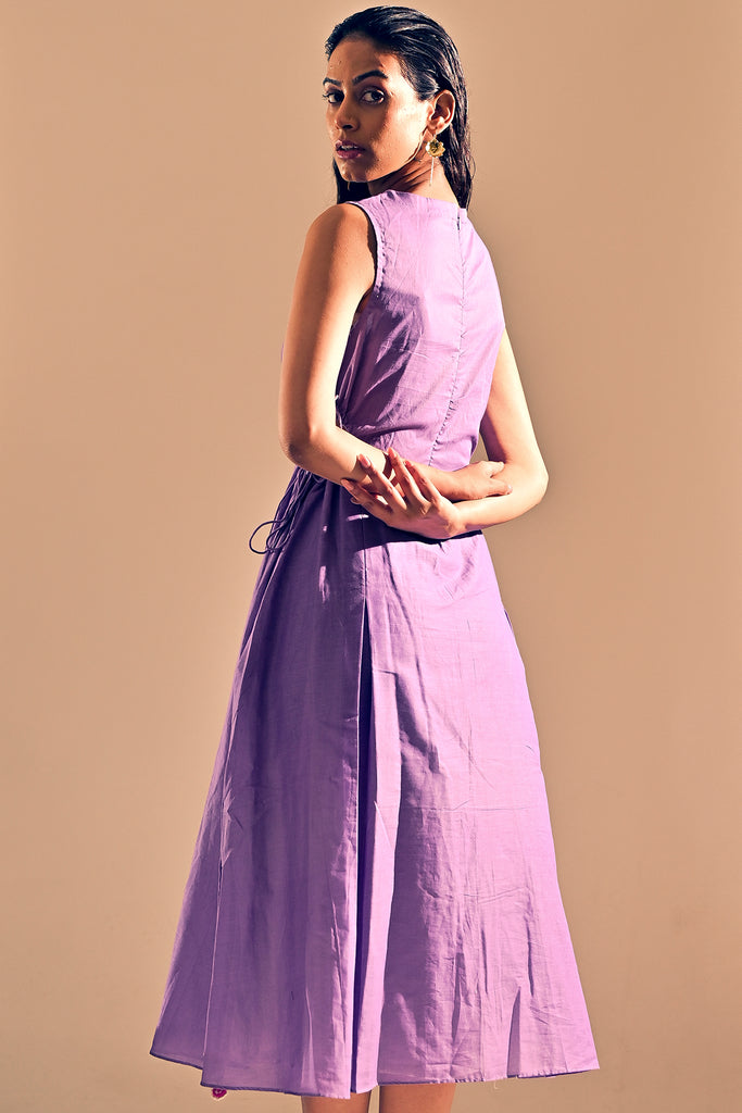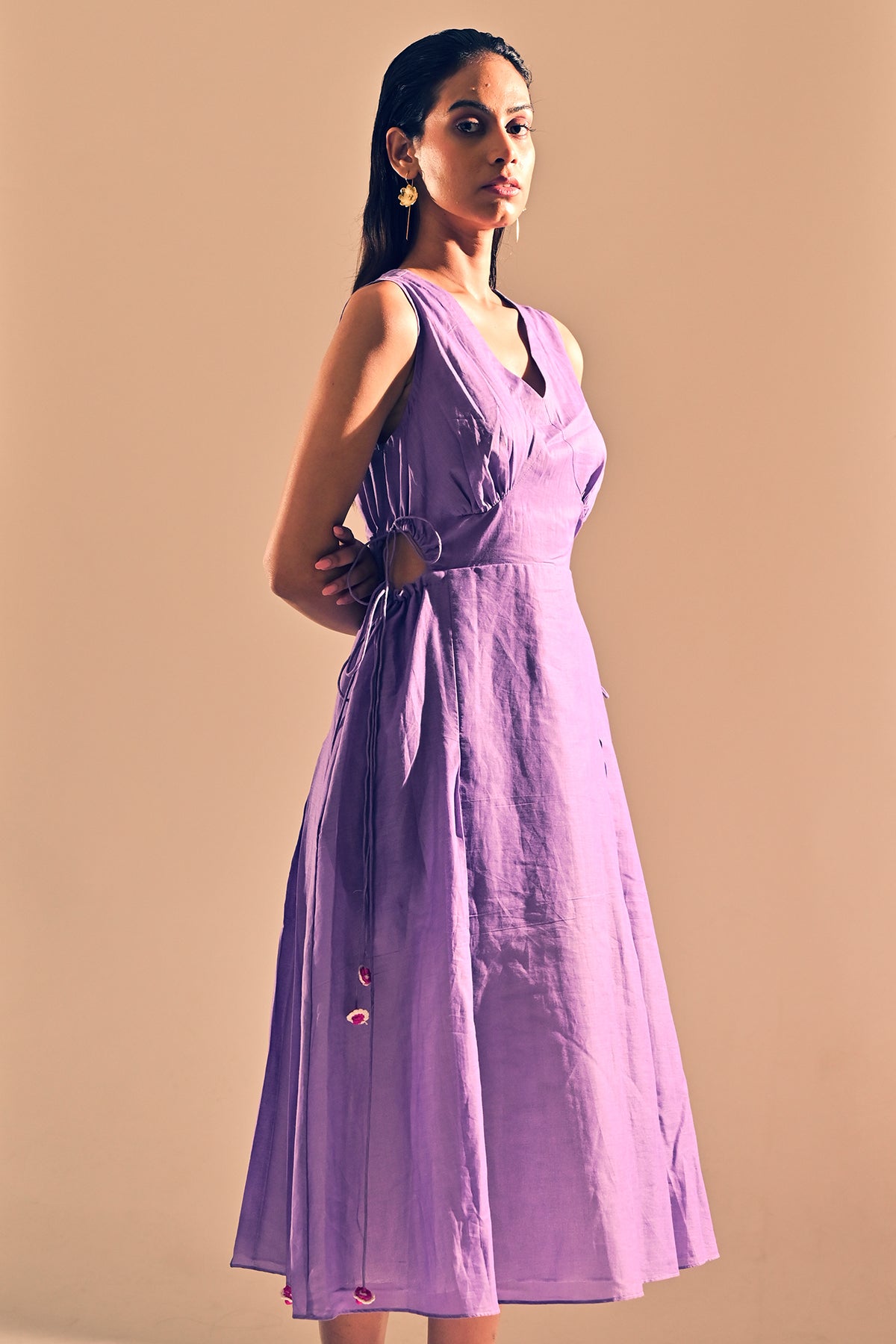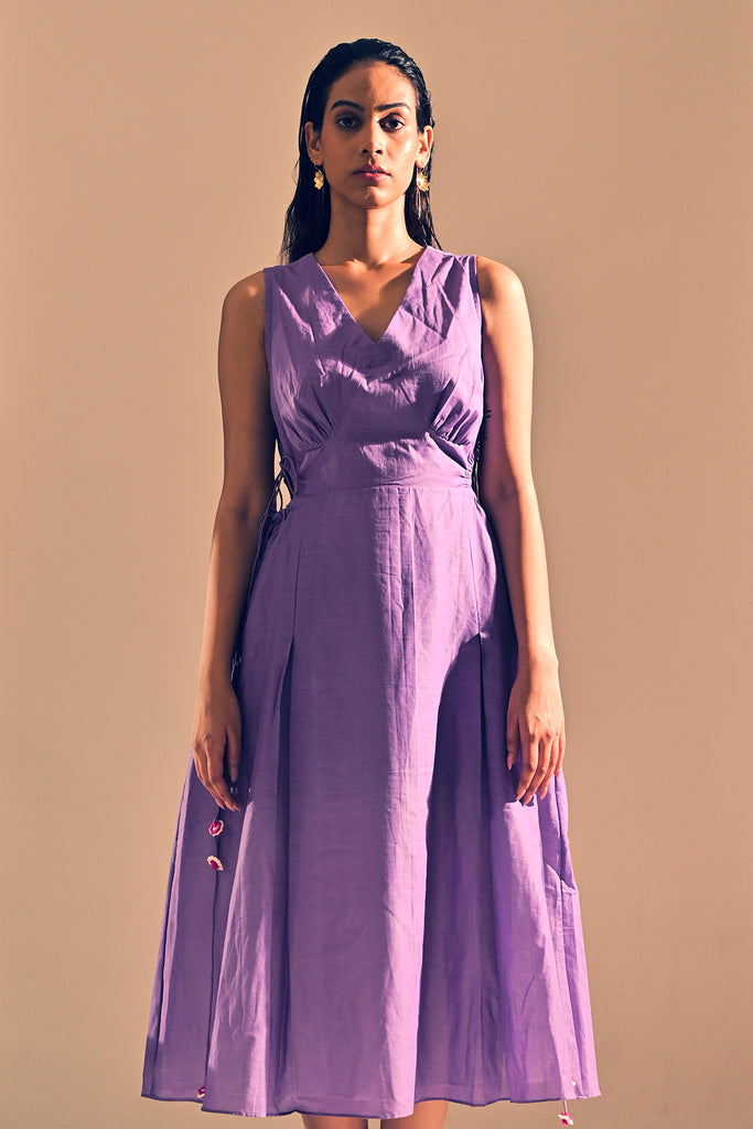 Waist cutout sleeveless dress with tie up details. Back zip closure.
